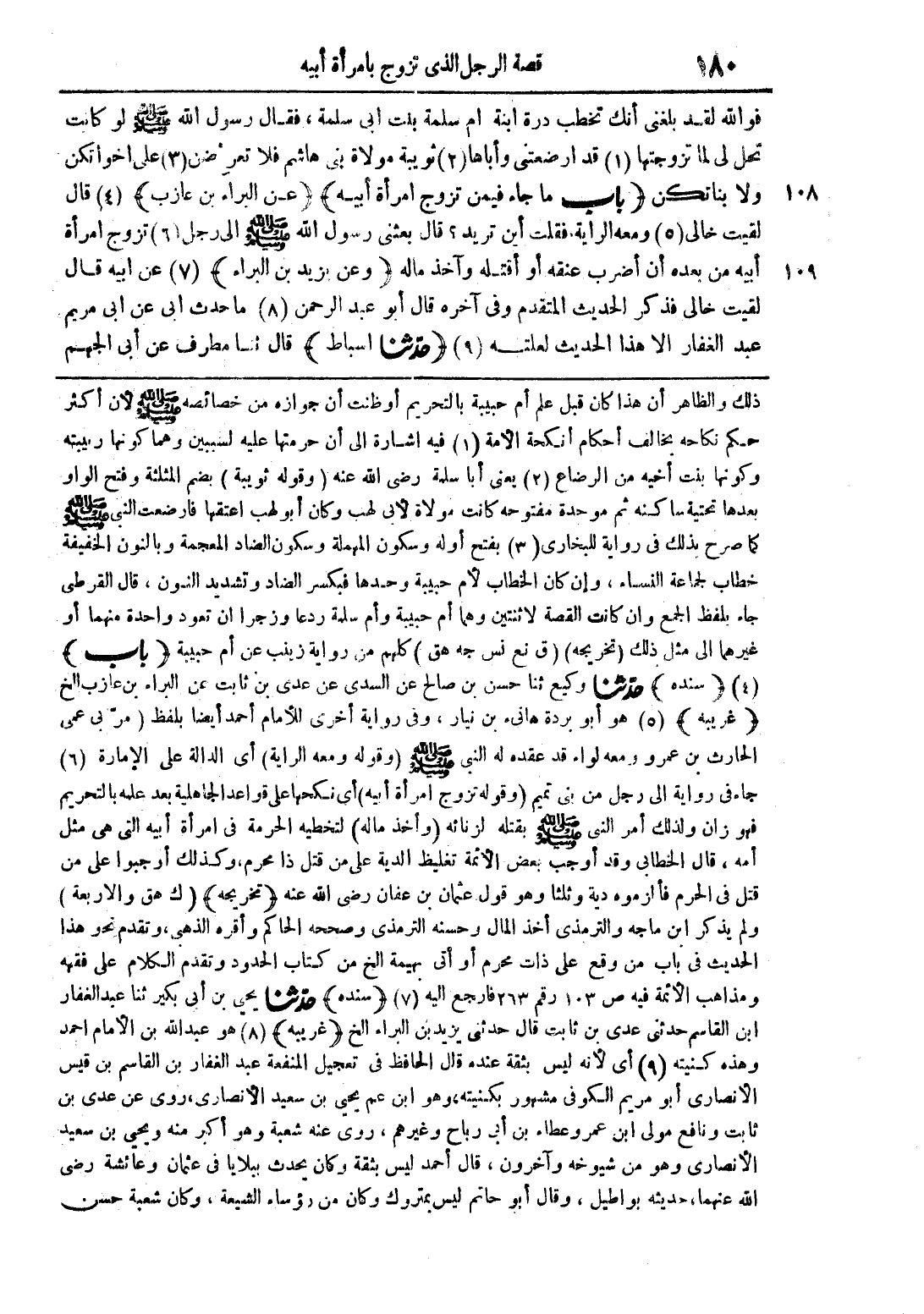 ذلك والظاهر أن هذا كان قبل علم أم حبيبة بالتحريم أو ظنت أن جوازه من خصائصه صلى الله عليه وسلم لأن أكثر حكم نكاحه يخالف أحكام أنكحه الأمة (1) فيه إشارة إلى أن حرمتها عليه لسببين وهما كونها ربيته وكونها بنت أخيه من الرضاع (2) يعني أبا سلمة رضي الله عنه (وقوله ثويبة) بضم المثلثة وفتح الواو بعدها تحتية ساكنه ثم موحدة مفتوحة كانت مولاة لأبي لهب وكان أ [ولهب اعتقها فارضعت النبي صلى الله عليه وسلم كما صرح بذلك في رواية للبخاري (3) بفتح أوله وسكون المهملة وسكون الضاد المعجمة وبالنون الخفيفة خطاب لجماعة النساء، وإن كان الخطاب لأم حبيبة وحدها فبكسر الضاد وتشديد النون، قال القرطبي جاء بلفظ الجمع وان كانت القصة لاثنتين وهما أم حبيبة وأم سلمة ردعا وزجرا ان تعود واحدة منهما أو غيرهما الى مثل ذلك (تخريجه) (ق نع نس جه هق) كلهم من رواية زينب عن أم حبيبة (باب) (4) (سنده) حدثنا وكيع ثنا حسن بن صالح عن السدي عن عدي بن ثابت عن البراء بن عازب الخ (غريبه) (5) هو أبو بردة هانيء بن نيار، وفي رواية أخرى للأمام أحمد أيضا بلفظ (مر بي عمي الحارث بن عمرو ومعه لواء قد عقده له النبي صلى الله عليه وسلم (وقوله ومعه الراية) أي الدالة على الإمارة (6) جاء في رواية إلى رجل من بني تميم (وقوله تزوج امرأة أبيه) أي نكحها على قواعد الجاهلية بعد علمه بالتحريم فهو زان ولذلك أمر النبي صلى الله عليه وسلم بقتله لزنائه (واخذ ماله) لتخطيه الحرمة في امرأة أبيه التي هي مثل أمه، قال الخطابي وقد أوجب بعض الأئمة تغليظ الدية على من قتل ذا محرم، وكذلك أوجبوا على من قتل فى الحرم فألزموه دية وثلثا وهو قول عثمان بن عفان رضي الله عنه (تخريجه) (ك هق والأربعة) ولم يذكر ابن ماجه والترمذي أخذ المال وحسنه الترمذي وصححه الحاكم وأقره الذهبي، وتقدم نحو هذا الحديث في باب من وقع على ذات محرم أو أتى بهيمة الخ من كتاب الحدود وتقدم الكلام على فقهه ومذاهب الأئمة فيه ص 103 رقم 263 فارجع إليه (7) (سنده) حدثنا يحيي بن أبي بكير ثنا عبد الغفار ابن القاسم حدثني عدي بن ثابت قال حدثني يزيد بن البراء الخ (غريبة) (8) هو عبد الله بن الأمام احمد وهذه كنيته (9) أي لأنه ليس بثقة عنده قال الحافظ في تعجيل المنفعة عبد الغفار بن القاسم بن قيس الأنصاري أبو مريم الكوفي مشهور بكنيته، وهو ابن عم يحيي بن سعيد الأنصاري، روى عن عدي بن ثابت ونافع مولى ابن عمر وعطاء بن أبي رباح وغيرهم، روى عنه شعبة وهو أكبر منه ويحيى بن سعيد الأنصاري وهو من شيوخه وآخرون، قال احمد ليس بثقة وكان يحدث ببلايا في عثمان وعائشة رضي الله عنهما، حديثه بواطيل، وقال أبو حاتم ليس بمتروك وكان من رؤساء الشيعة، وكان شعبة حسن