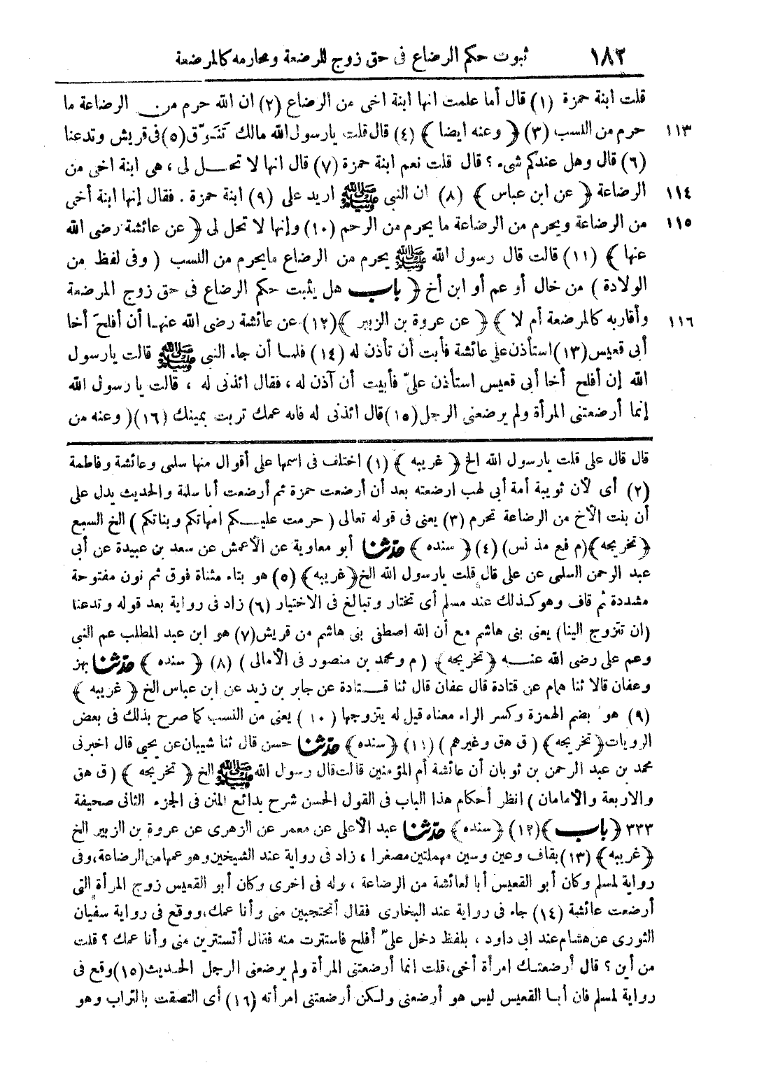 قلت ابنة حمزة (1) قال أما علمت إنها ابنة أخي من الرضاع (2) أن الله حرم من الرضاعة ما يدل حرم من النسب (3) (وعنه أيضا) (4) قال قلت يا رسول الله ما لم تتوق (5) في قريش وتدعنا (6) قال وهل عندكم شيء؟ قال قلت نعم ابنة حمزة (7) قال إنها لا تحل لي، هي ابنة أخي من الرضاعة (عن ابن عباس) (8) إن النبي صلى الله عليه وسلم أريد على (9) ابنة حمزة. فقال إنها ابنة أخي من الرضاعة ويحرم من الرضاعة ما يحرم من الرحم (10) وإنها لا تحل لي (عن عائشة رضي الله عنها) (11) قالت قال رسول الله صلى الله عليه وسلم يحرم من الرضاع ما يحرم من النسب (وفي لفظ من الولادة) من خال أو عم أو ابن أخ (باب هل يثبت حكم الرضاع في حق زوج المرضعة وأقاربه كالمرضعة أم لا) (عن عروة بن الزبير) (12) عن عائشة رضي الله عنها أن أفلح أخا أبي قعيس (13) استأذن على عائشة فأبت أن تأذن له (14) فلما أن جاء النبي صلى الله عليه وسلم قالت يا رسول الله إن أفلح أخا أبي قعيس أستأذن علي فأبيت أن آذن له، فقال ائذني له، قالت يا رسول الله إنما أرضعتني المرأة ولم يرضعني الرجل (15) قال ائذني له فانه عمك تربت يمينك (16) وعنه من