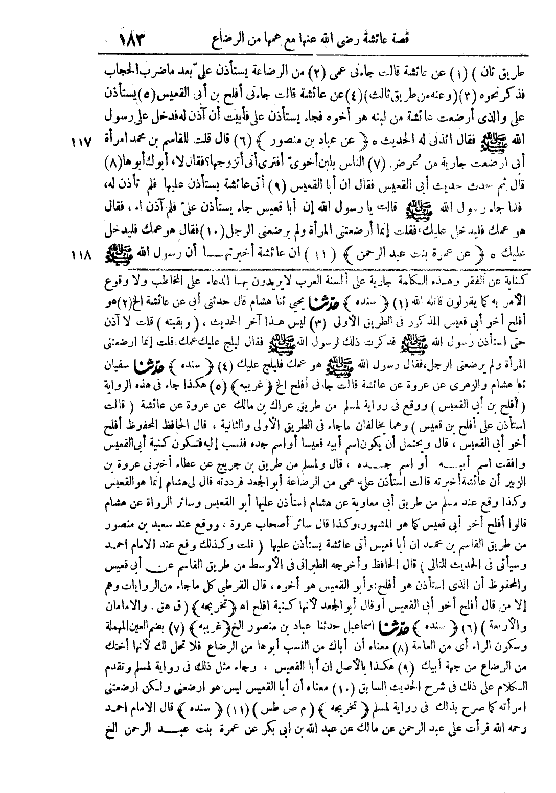طريق ثان) (1) عن عائشة قالت جاءني عمى (2) من الرضاعة يستأذن على بعد ما ضرب الحجاب فذكر نحوه (3) (وعنه من طريق ثالث) (4) عن عائشة قالت جاءني أفلح بن أبي القعيس (5) يستأذن على والذي أرضعت عائشة من لبنه هو أخوه فجاء يستأذن على فأبيت أن آذن له فدخل على رسول الله صلى الله عليه وسلم فقال إذني له الحديث (عن عباد بن منصور) (6) قال قلت للقاسم بن محمد امرأة أبى ارضعت جارية من عرض (7) الناس بلبن أخوي أفترى أنى اتزوجها؟ فقال لا، أبوك أبوها (8) قال ثم حدث حديث ابى القعيس فقال ان أبا القعيس (9) أتى عائشة يستأذن عليها فلم تأذن له، فلما جاء رسول الله صلى الله عليه وسلم قالت يا رسول الله إن أبا قعيس جاء يستأذن على فلم آذن له، فقال هو عمك فليدخل عليك، فقلت إنما أرضعتني المرأة ولم يرضعني الرجل (10) فقال هو عمك فليدخل عليك (عن عمرة بنت عبد الرحمن) (11) ان عائشة أخبرتها أن رسول الله صلى الله عليه وسلم