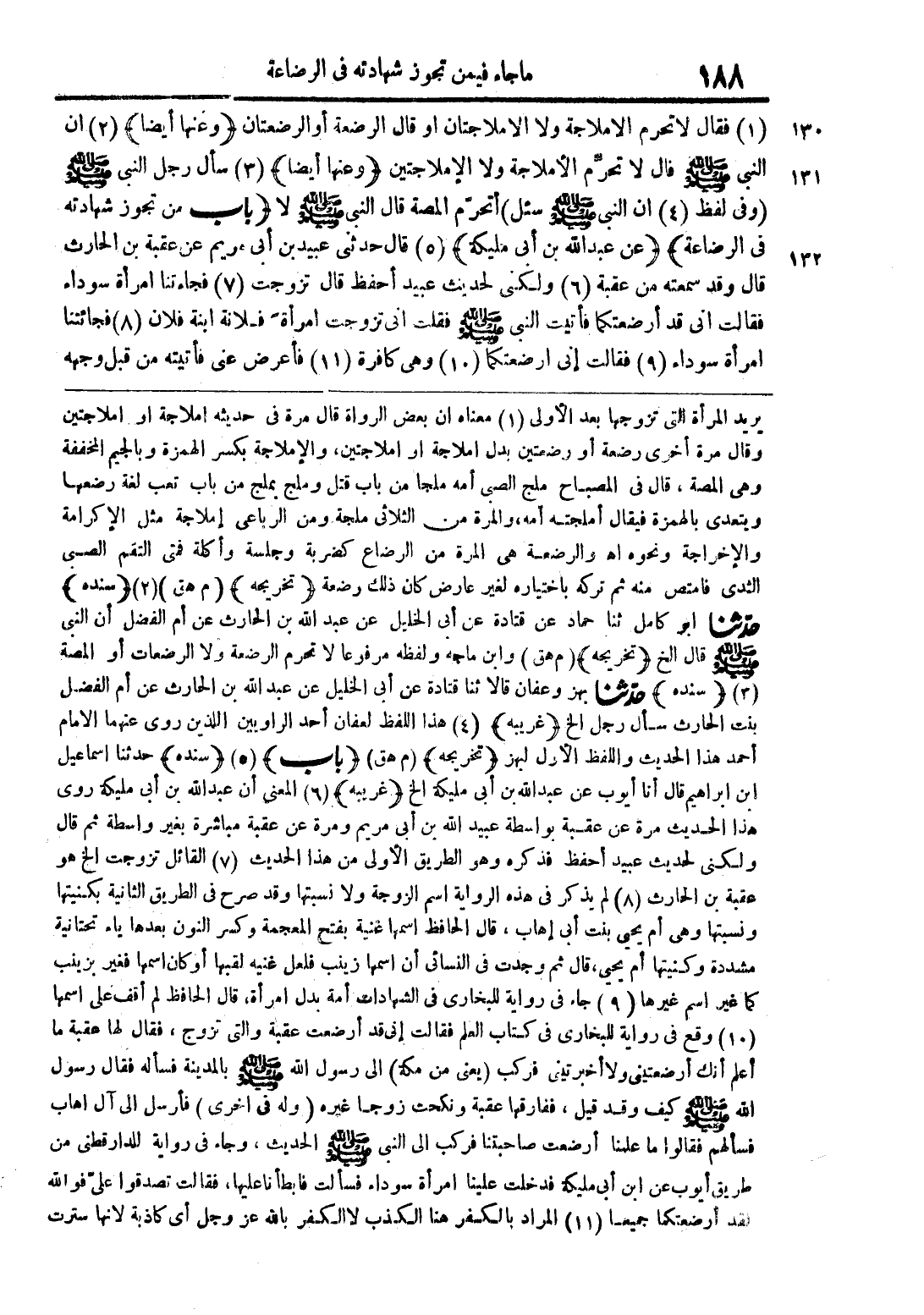 يريد المرأة التي تزوجها بعد الأولى (1) معناه ان بعض الرواة قال مرة في حديثة املاجة أو املاجتين وقال مرة أخرى رضعة أو رضعتين بدل املاجة أو املاجتين، والإملاجة بكسر الهمزة وبالجيم المخففة وهي المصة، قال في المصباح ملج الصبي أمه ملجا من باب قتل وملج يملج من باب تعب لغة رضعها ويتعدى بالهمزة فيقال أملجته أمه، والمرة من الثلاثي ملجة ومن الرباعي إملاجة مثل الإكرامة والإخراجة ونحوه اهـ والرضعة هي المرة من الرضاع كضربة وجلسة وأكلة فمتى التقم الصبي الثدي فامتص منه ثم تركه باختياره لغير عارض كان ذلك رضعة (تخريجه) (م هق) (2) (سنده) حدّثنا أبو كامل ثنا حماد عن قتاده عن أبي الخليل عن عبد الله بن الحارث عن أم الفضل أن النبي صلى الله عليه وسلم قال الخ (تخريجه) (م هق) وابن ماجه ولفظه مرفوعا لا تحرم الرضعة ولا الرضعات أو المصة (3) (سنده) حدّثنا بهز وعفان قالا ثنا قتادة عن أبي الخليل عن عبد الله بن الحارث عن أم الفضل بنت الحارث سأل رجل الخ (غريبه) (4) هذا اللفظ لعفان أحد الراويين اللذين روى عنهما الامام أحمد هذا الحديث واللفظ الأول لبهز (تخريجه) (م هق) (باب) (5) (سنده) حدثنا إسماعيل ابن إبراهيم قال أنا أيوب عن عبد الله بن أبي ملية الخ (غريبه) ((6) المعنى أن عبد الله بن أبي مليكة روى هذا الحديث مرة عن عقبة بواسطة عبيد الله بن أبي مريم ومرة عن عقبة مباشرة بغير واسطة ثم قال ولكني لحديث عبيد احفظ فذكره وهو الطريق الأولى من هذا الحديث (7) القائل تزوجت الخ هو عقبة بن الحارث (8) لم يذكر في هذه الوراية اسم الزوجة ولا نسبتها وقد صرح في الطريق الثانية بكنيتها ونسبتها وهي أم يحيى بنت ابي إهاب، قال الحافظ إسمها غنية بفتح المعجمة وكسر النون بعدها ياء تحتانية مشددة وكنيتها أم يحيى، قال ثم وجدت في النسائي أن اسمها زينب فلعل غنيه لقبها أو كان اسمها فغير بزينب كما غير اسم غيرها (9) جاء في رواية للبخاري في الشهادات أمة بدل امرأة، قال الحافظ لم أقف على اسمها (10) وقع في رواية للبخاري في كتاب العلم فقالت إني قد أرضعت عقبة والتي تزوج، فقال لها عقبة ما أعلم أنك أرضعتني ولا أخبرتني فركب (يعني من مكة) الى رسول الله صلى الله عليه وسلم بالمدينة فسأله فقال رسول الله صلى الله عليه وسلم كيف وقد قيل، ففارقها عقبة ونكحت زوجا غيره (وله في أخرى) فأرسل الى آل اهاب فسألهم فقالوا ما علمنا أرضعت صاحبتنا فركب الى النبي صلى الله عليه وسلم الحديث، وجاء في رواية للدارقطني من طريق أيوب عن أبن أبي مليكة فدخلت علينا امرأة سوداء فسألت فأبطأ عليها، فقالت تصدقوا علىّ فو الله لقد أرضعتكما جميعا (11) المراد بالفر هنا الكذب لا الكفر بالله عز وجل أي كاذبة لأنها سترت