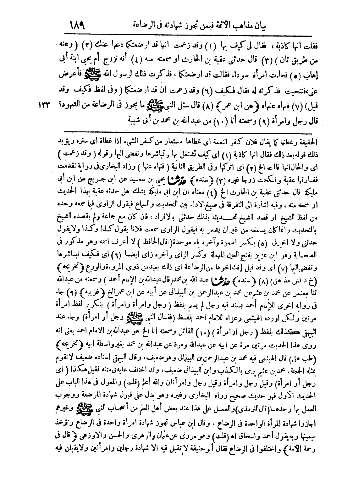 الحقيقة وغطتها كما يقال فلان كفر النعمة أي غطاها مستعار من كفر الشيء إذا غطاة أي ستره ويؤيد ذلك قوله بعد ذلك فقال انها كاذبة (1) أي كيف تشتغل بها وتباشرها وتفضي اليها وقوله (وقد زعمت) أي والحال انها قالت الخ (2) أي اتركها وفي الطريق الثانية (فنهاه عنها) وزاد البخاري في رواية تقدمت ففارقها عقبة ونكحت زوجا غيره (3) (سنده) حدّثنا يحيى بن سعيد عن ابن جريج عن ابن أبي مليكة قال حدثني عقبة بن الحارث الخ (4) معناه ابن ابي مليكة يشك هل حثه عقبة بهذا الحديث او سمعه منه، وفيه إشارة الى التفرقة في صيغ الأداء بين التحديث والسماع فيقول الراوي فيما سمعه وحده من لفظ الشيخ او قصد الشيخ تحديثه بذلك حدثني بالفراد، فان كان مع جماعة ولم يقصده الشيخ بالتحديث وانما كان يسمعه من غير ان يشعر به فيقول الراوي سمعت فلانا يقول كذا وكذا ولا يقول حدثني ولا أخبرني (5) بكسر الهمزة وآخره باء موحدة (قال الحافظ) لا أعرف اسمه وهو مذكور في الصحابة وهو ابن عزيز بفتح العين المهملة وكسر الزاي وآخره زاي أيضا (6) أي فكيف تباشرها وتفضي اليها (7) أي وقد قيل إنك أخوها من الرضاعة أي ذلك بعيد من ذوي المروءة والورع (تخريجه) (خ د نس مذ هق) (سنده) حدّثنا عبد الله بن محمد (قال عبد الله بن الإمام أحمد) وسمعته من عبد الله ثنا معتمر عن محمد بن عثيم عن محمد بن عبد الرحمن بن البيلماني عن ابيه عن ابن عمر الخ (غريبه) (9) جاء في رواية أخرى للإمام أحمد بسند فيه رجل لم يسم بلفظ (رجل وامرأة وامرأة) بتكرير لفظ امرأة مرتين ولكن أورده الهيثمي وعزاه للاما احمد بلفظ (فقال النبي صلى الله عليه وسلم رجل أو امرأة) وجاء عند البهقي كذلك بلفظ (رجل او امرأة) (10) القائل وسمعته انا الخ هو عبد الله بن الامام احمد يعني انه روى هذا الحيث مرتين مرة عن ابيه عن عبد الله ومرة عن عبد الله بن محمد بغير واسطة ابيه (تخريجه) (طب هق) قال الهيثمي فيه محمد بن عبد الرحمن بن البيلماني وهو ضعيف، وقال البيهقي اسناده ضعيف لا تقوم بمثله الحجة، محمد بن عثيم يرمي بالذب وابن البيلماني ضعيف، وقد اختلف عليه في متنه فقيل هكذا (أي رجل او امرأة) وقيل رجل وامرأة وقيل رجل وامرأتان والله أعلم (قلت) والمعول في هذا الباب على الحديث الأول فهو حديث صحيح رواه البخاري وغيره وهو يدل على قبول شهادة المرضعة ووجوب العمل بها وحدها (قال الترمذي) والعمل على هذا عند بعض أهل العلم من أصحاب النبي صلى الله عليه وسلم وغيرهم اجازوا شهادة المرأة الواحدة في الرضاع، وقال ابن عباس تجوز شهادة امرأة واحدة في الرضاع وتؤخذ بيمينها وبه يقول أحمد واسحاق اهـ (قلت) وهو مروى عن عثمان والزهري والحسن والاوزعي (قال في رحمة الأمة) واختلفوا في الرضاع فقال أبو حنيفة لا تقبل فيه شهادة رجلين وامرأتين ولا يقبلن فيه