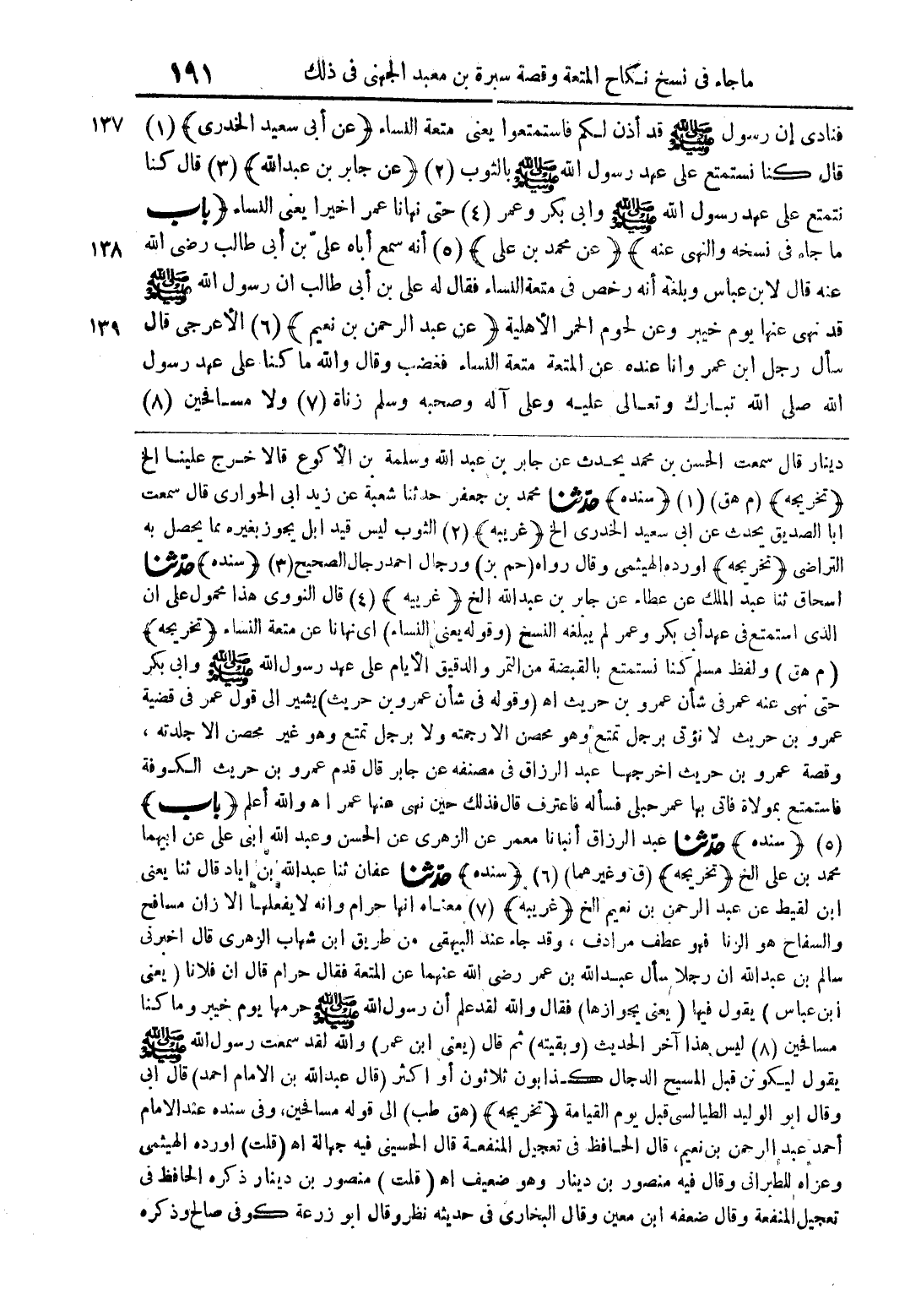 فنادى إن رسول الله صلى الله عليه وسلم قد أذن لكم فاستمتعوا يعني متعة النساء (عن ابي سعيد الخدرى) (1) قال كنا نستمتع على عهد رسول الله صلى الله عليه وسلم بالثوب (2) (عن جابر بن عبد الله) (3) قال كنا نتمتع على عهد رسول الله صلى الله عليه وسلم وابى بر وعمر (4) حتى نهانا عمر أخيرا يعنى النساء (باب ما جاء في نسخة والنهى عنه) (عن محمد بن على) (5) انه سمع اباه بن أبي طالب رضى الله عنه قال لابن عباس وبلغه أنه رخص في متعة النساء فقال له على بن أبي طالب ان رسول الله صلى الله عليه وسلم قد نهى عنها يوم خيبر وعن لحوم الحمر الأهلية (عن عبد الرحمن بن نعيم) (6) الاعرجي قال سأل رجل ابن عمر وانا عنده عن المتعة متعة النساء فغضب وقال والله ما كنا على عهد رسول الله صلى الله تبارك وتعالى عليه وعلى آله وصحبه وسلم زناة (7) ولا مسافحين (8)
