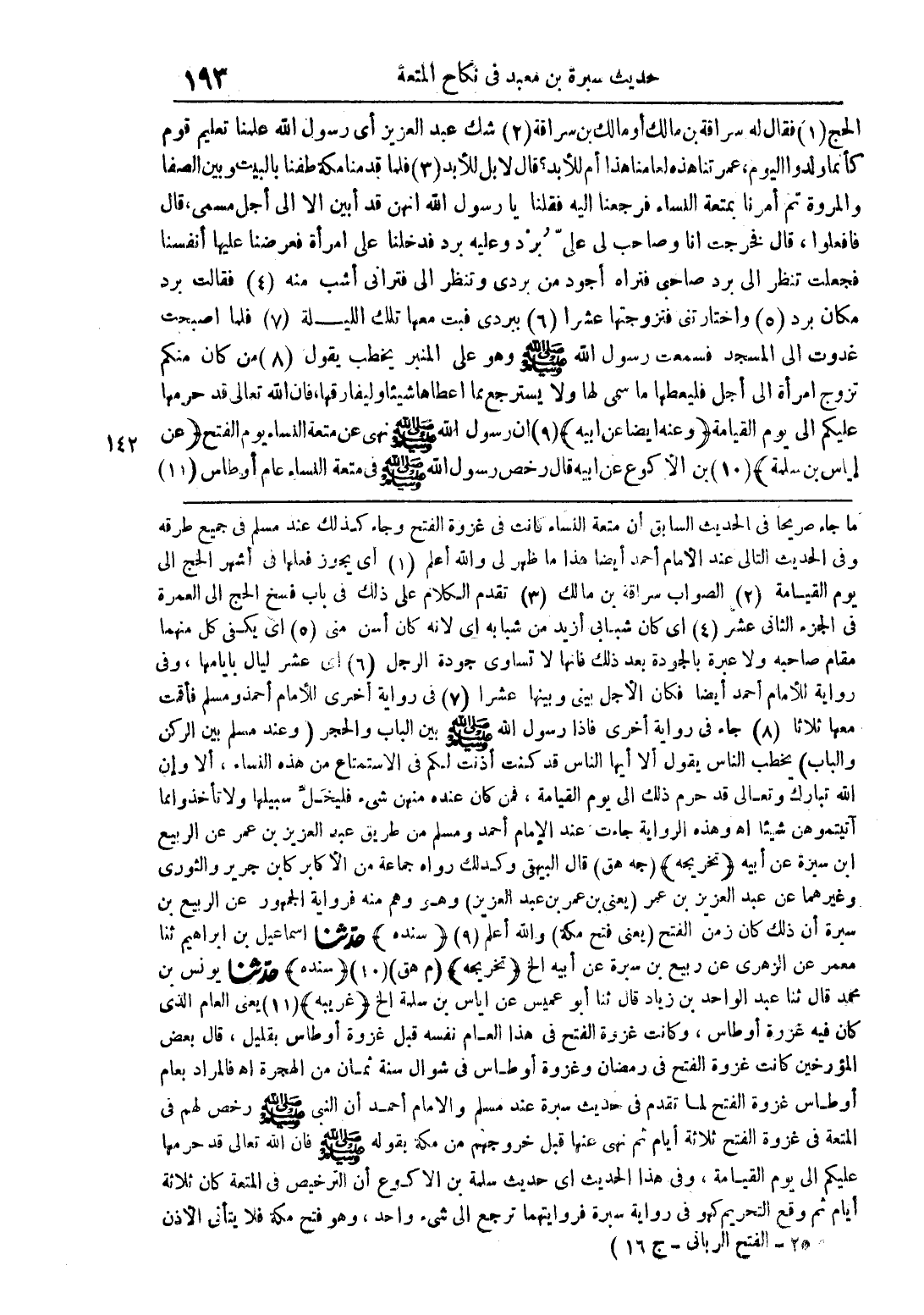 الحج (1) فقال له سراقة بن مال أو مالك بن سراقة (2) شك عبد العزيز أي رسول الله علمنا تعليم قوم كأنما ولدوا اليوم، عمرتنا هذه لعامنا هذا أم للأبد؟ قال لا بل للأبد (3) فلما قدمنا مكة طفنا بالبيت وبين الصفا والمروة تم أمرنا بمتعة النساء فرجعنا اليه فقلنا يا رسول الله انهن قد أبين الا الى أجل مسمى، قال فافعلوا، قال فخرجت انا وصاحب لي علىّ برد وعليه برد فدخلنا على امرأة فعرضنا عليها أنفسنا فجعلت تنظر الى بر صاحبي فتراه أجود من بدرى وتنظر الى فتراني اشب منه (4) فقالت برد مكان برد (5) واختارتني فتزوجتها عشرا (6) ببردى فبت معها تلك الليلة (7) فلما أصبحت غدوت الى المسجد فسمعت رسول الله صلى الله عليه وسلم وهو على المنبر يخطب يقول (8) من ان منكم تزوج امراة الى أجل فليعطها ما سمى لها ولا يسترجع مما أعطاها شيئا وليفارقها، فان الله تعالى قد حرمها عليكم الى يوم القيامة (وعنه أيضا عن ابيه) (9) ان رسو الله صلى الله عليه وسلم نهى عن متعة النساء يوم الفتح (عن اياس بن سلمة) (10) بن الأكوع عن ابيه قال رخص رسول الله صلى الله عليه وسلم في متعة عام أوطاس (11)