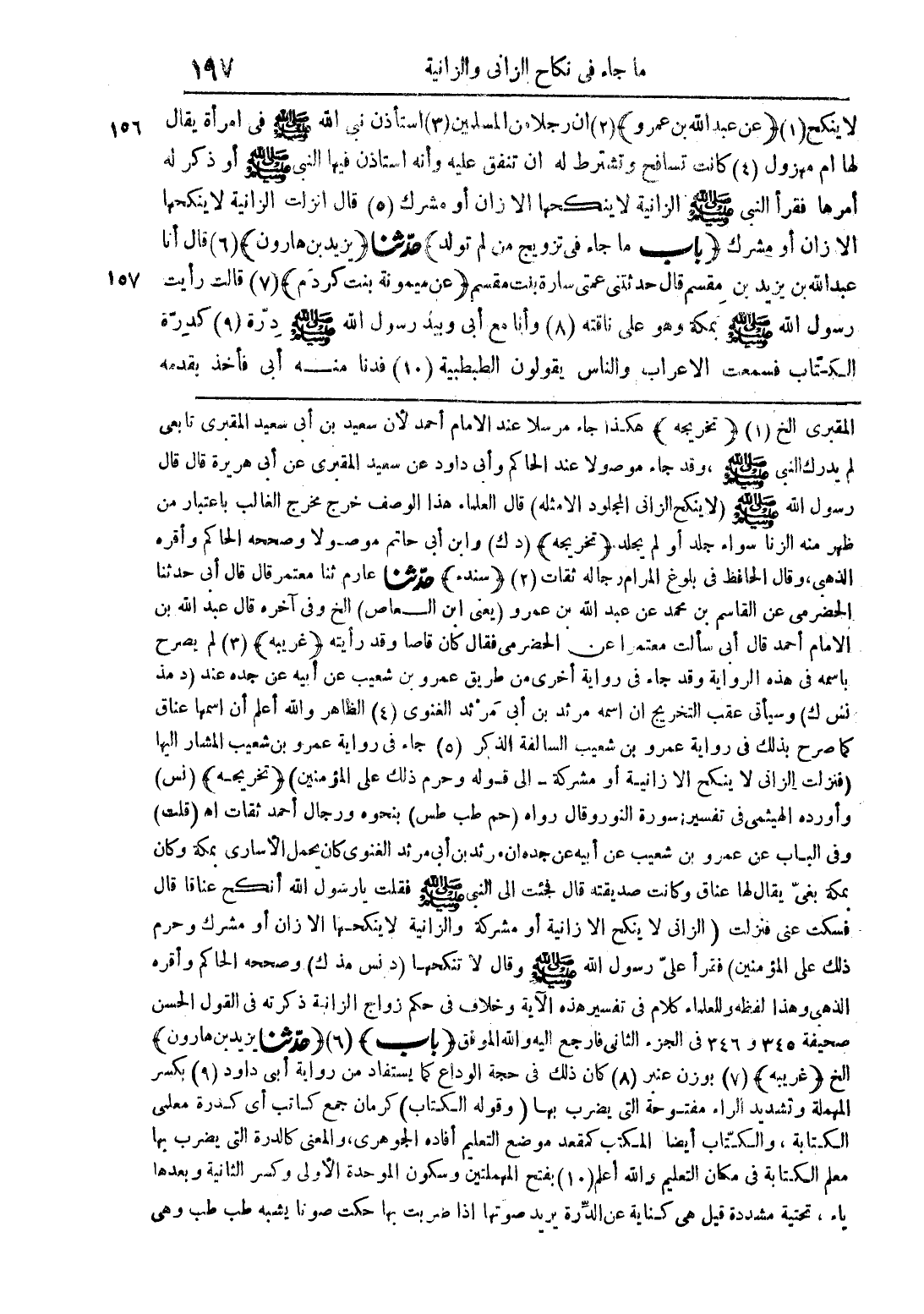 المقبري الخ (1) (تخريجه) هكذا جاء مرسلا عند الامام أحمد لأن سعيد بن أبي سعيد المقبري تابعي لم يدرك النبي صلى الله عليه وسلم، ود جاء موصولا عند الحاكم وأبي داود عن سعيد المقبري عن أبي هريرة قال قال رسول الله صلى الله عليه وسلم (لا ينكح الزاني المجلود الا مثله) قال العلماء هذا الوصف خرج مخرج الغالب باعتبار من ظهر منه الزنا سواء جلد أو لم يجلد (تخريجه) (د ك) وابن أبي حاتم موصولا ولا وصححه الحاكم وأقره الذهبي، وقال الحافظ في بلوغ المرام رجاله ثقات (2) (سنده) حدّثنا عارم ثنا معتمر قال قال أبي حدثنا الحضرمي عن القاسم بن محمد عن عبد الله بن عمرو (يعني ابن العاص) الخ وفي آخره قال عبد الله بن الامام أحمد قال أبي سألت معتمرا عن الحضرمي فقال كان قاصا وقد رأيته (غريبه) (3) لم يصرح باسمه في هذه الرواية وقد جاء في رواية أخرى من طريق عمرو بن شعيب عن أبيه عن جده عند (د مذ نس ك) وسيأتي عقب التخريج ان اسمه مرثد بن أبي مرثد الغنوي (4) الظاهر والله أعلم أن اسمها عناق كما صرح بذلك في رواية عمرو بن شعيب السالفة الذكر (5) جاء في رواية بن شعيب المشار اليها (فنزلت الزاني لا ينكح الا زانية أو مشركة - الى قوله وحرم ذلك على المؤمنين) (تخريجه) (نس) وأورده الهيثمي في تفسيره سورة النور وقال رواه (حم طب طس) بنحوه ورجال أحمد ثقات اهـ (قلت) وفي الباب عن عمرو بن شعيب عن أبيه عن جده ان مرثد بن أبي مرثد الغنوي كان يحمل الأسارى بمكة وكان بمكة بغىّ يقال لها عناق وكانت صديقته قال فجئت الى النبي صلى الله عليه وسلم فقلت يا رسول الله أنح عناقا قال فسكت عنى فنزلت (الزاني لا ينكح الا زانية أو مشركة والزانية لا ينكحها الا زان او مشرك وحرم ذلك على المؤمنين) فقرأ علىّ رسول الله صلى الله عليه وسلم وقال لا تنكحها (د نس مذ ك) وصححه الحاكم وأقره الذهبي وهذا لفظه وللعلماء كلام في تفسيره هذه الآية وخلاف في حكم زواج الزانية ذكرته في القول الحسن صحيفة 345 و 346 في الجزء الثاني فارجع اليه والله الموفق (باب) (6) (حدّثنا يزيد بن هارون) الخ (غريبه) (7) بوزن عنبر (8) كان ذلك في حجة الوادع كما يستفاد من رواية أبي داود (9) بكسر المهملة وتشيد الراء مفتوحة التي يضرب بها (وقوله الكتاب) كرمان جمع كاتب أي كدرة معلمي الكتابة، والكتّاب أيضا المكتب كمقعد موضع التعليم أفداه الجوهري، والمعنى كالدرة التي يضرب بها معلم الكتابة في مكان التعليم والله أعلم (10) بفتح المهملتين وسكون الموحدة الأولى وكسر الثانية وبعدها ياء، تحتية مشددة قيل هي كناية عن الدرة يريد صوتها اذا ضربت بها حكت صونا يشبه طب طب وهي