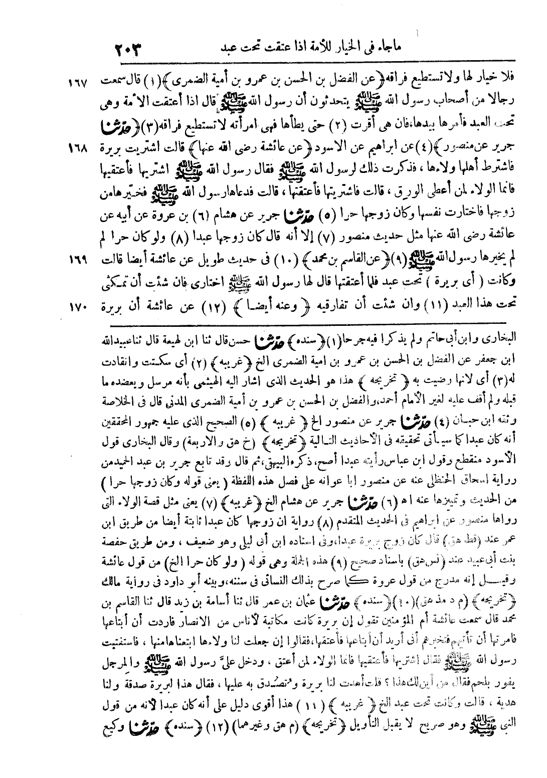 فلا خيار لها ولا تستطيع فراقه (عن الفضل بن الحسن بن عمرو بن أمية الضمري) (1) قال سمعت رجالا من أصحاب رسول الله صلى الله عليه وسلم يتحدثون أن رسول الله صلى الله عليه وسلم قال إذا أعتقت الامة وهى تحت العبد فأمرها بيدها فان هي أقرت (2) حتى يطأطأ فمي امرأته لا تستطيع فراقه (3) (حدّثنا جرير عن منصور) (4) عن إبراهيم عن الأسود (عائشة رضى الله عنها) قالت اشتريت بريرة فاشترط أهلها ولاءها، فذكرت ذلك لرسول الله صلى الله عليه وسلم فقال رسول الله صلى الله عليه وسلم اشتريها فأعتقيها فإنما الولاء لمن اعطى الورق، قالت فاشتريتها فأعتقتها، قالت فدعاها رسول الله صلى الله عليه وسلم فخيّرها من زوجها فاختارت نفسها وكان زوجها حرا (5) حدّثنا جرير بن هشام (6) بن عورة عن أبيه عن عائشة رضي الله عنها مثل حديث منصور (7) إلا أنه قال كان زوجها عبدا (8) ولو كان حرا لم يخيرها رسول الله صلى الله عليه وسلم (9) (عن القاسم بن محمد) (10) في حديث طويل عن عائشة أيضا قال وكانت (أي بريرة) تحت عبد فلما أعتقتها قال لها رسول الله صلى الله عليه وسلم اختارى فإن شئت ان تمكثي تحت هذا العبد (11) وان شئت أن تفارقيه (وعنه أيضا) (12) عن عائشة أن بريرة