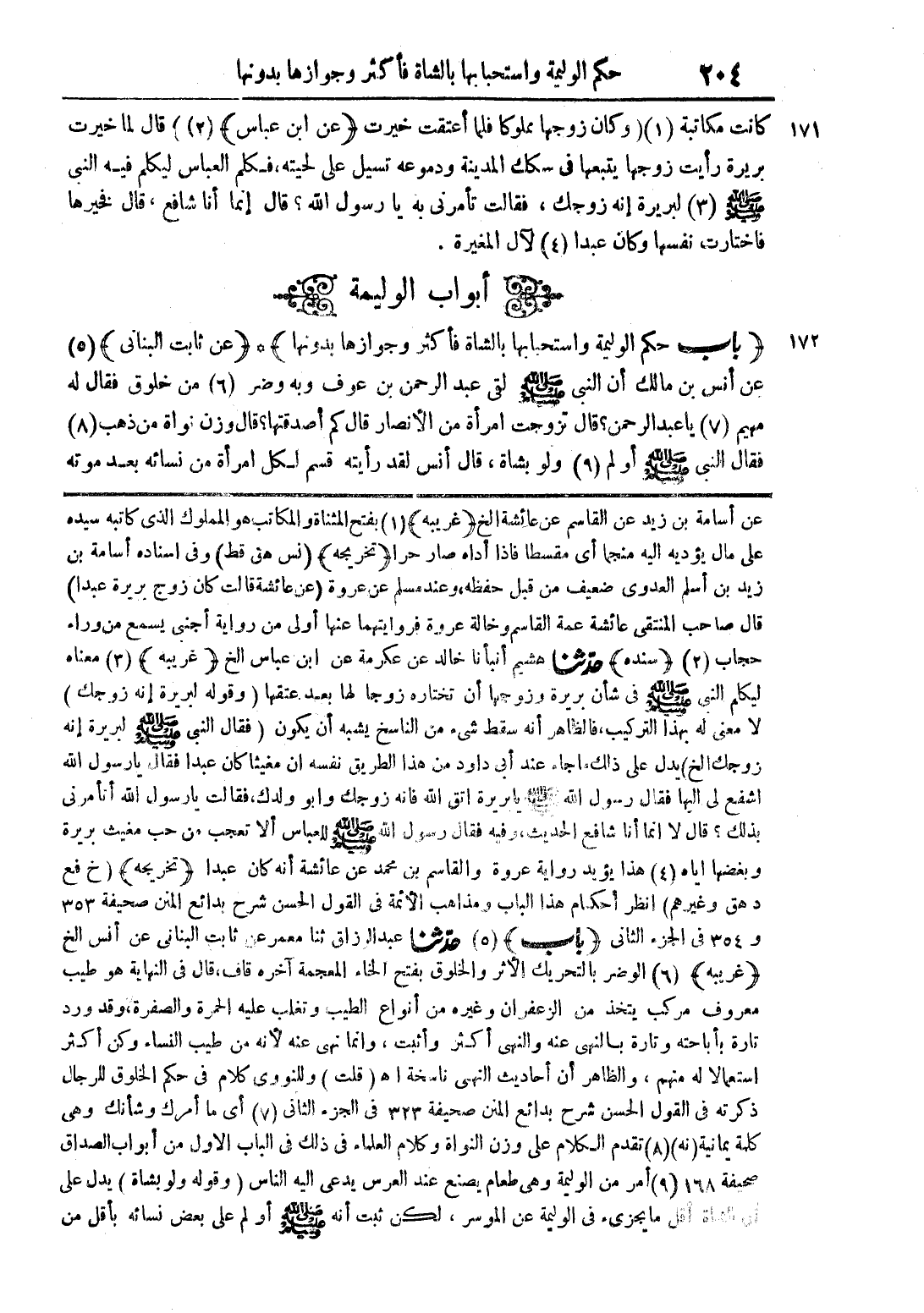 عن أسامة بن زيد عن القاسم عن عائشة الخ (غريبه) (1) بفتح المثناة والمكاتب هو المملوك الذي كاتبه سيده على مال يؤديه إليه منجما أي مقسطا فإذا أداه صار حرا (تخريجه) (نس هق قط) وفي اسناده أسامة بن زيد بن أسلم العدوي ضعيف من قبل حفظه، وعند مسلم عن عروة (عن عائشة قال كان زوج بريرة عبدا) قال صاحب المنتقي عائشة عمة القاسم وخالة عورة فروايتهما عنها أولي من رواية أجنبي يسمع من وراء حجاب (2) (سنده) حدّثنا هشيم أنبأنا خالد عن عكرمة عن ابن عباس الخ (غريبه) (3) معناه ليكلم النبي صلى الله عليه وسلم في شأن بريرة وزجها ان تختاره زوجا لها بعد عتقها (وقوله لبيرة إنه زوجك) لا معنى له بهذا التركيب، فالظاهر أنه سقط شيء من الناسخ يشبه أن يكون (فقال النبي صلى الله عليه وسلم لبريرة إنه زوجك الخ) يدل على ذلك ما جاء عند ابي داود من هذا الطريق نفسه أن مغثيا كان عبد فقال يا رسلو الله اشفع لي إليها فقال رسول الله صلى الله عليه وسلم يا بريرة اتق الله فإنه زوجك وأبو ولدك، فقالت يا رسول الله أتأمرني بذلك؟ قال لا إنما أنا شافع الحديث، وفيه يقول رسول الله صلى الله عليه وسلم للعباس ألا تعجب من جب مغيث بريرة وبعضها إياه (4) هذا يؤيد رواية عروة والقاسم بن محمد عن عائشة أنه كان عبد (تخريجه) (خ فع دهق وغيرهم) انظر أحكام هذا الباب ومذاهب الأئمة في القول الحسن شرح بدائع المتن صحيفة 353 و 354 في الجزء الثاني (باب) (5) حدّثنا عبد الرزاق ثنا معمر عن ثابت البناني عن أنس الخ (غريبه) (6) الوضر بالتحريك الأثر والخلوق بفتح الخاء المعجمة آخره قاف، قال في النهاية هو طيب معروف مركب يتخذ من الزعفران وغيره من أنواع الطيب وتغلب علبه الحمرة والصفرة، وقد ورد تارة بإباحته وتارة بالنهي عنه والنهي أكثر وأثبت، وإنما نهى عنه لأنه من طيب النساء وكن أكثر استعمالا له منهم، والظاهر أن احاديث النهي ناسخة أهـ (قلت) وللنووي كلام في حكم الخلوق للرجال ذكرته في القول الحسن شرح بدائع المنن صحيفة 323 في الجزء الثاني (7) أي ما امرك وشأنك وهي كلمة يمانية (نه) (8) تقدك الكلام على وزن النواة وكلام العلماء في ذلك الباب الأول من أبوب الصداق صحيفة 168 (9) وأمر من الوليمة وهي طعام يصنع عند العرس يدعى إليه الناس (وقوله ولو بشاة) يدل على أن الهاة أقل ما يجزئ في الوليمة عن الموسر، لكن ثبت أنه صلى الله عليه وسلم أو لم على بعض نسائه بأقل من