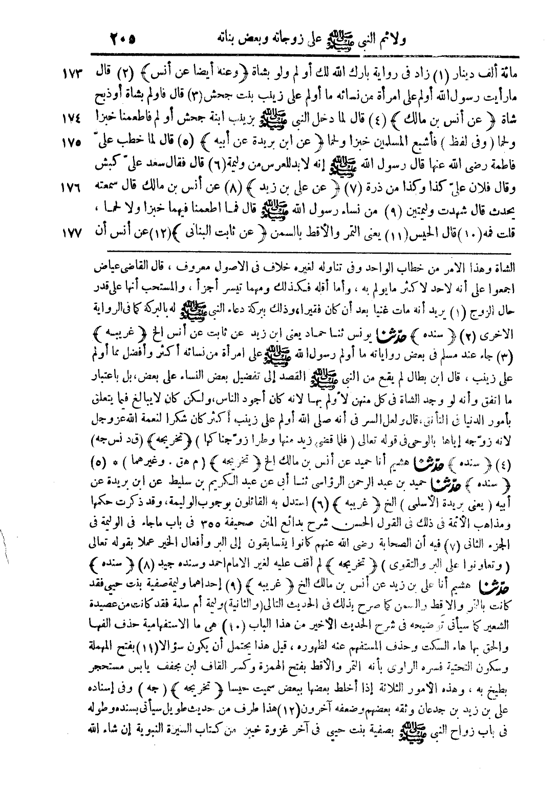الشاة وهذا الأمر م خطاب الواحد وفي تناوه لغيره خلاف في الأصول معروف، قال القاضي عياض اجمعوا على أنه لاحد لا كثر ما يولم به، وأما أقبله فكذلك ومهما تيسر أجزأ، والمستحب أنها على قدر حال الزوج (1) يريد أنه مات غنيا بعد ما ان كان فقيرا، وذلك ببركة دعاء النبي صلى الله عليه وسلم له بالبركة كما في الرواية الأخرى (2) (سنده) حدّثنا يونس ثنا حماد يعني ابن زيد عن ثابت عن أنس الخ (غريبه) (3) جاء عند مسلم في بعض رواياته ما أولم رسول الله صلى الله عليه وسلم على امرأة من نسائه أكثر وأفضل مما أولم على زينب، قال ابن بطال لم يقع من النبي صلى الله عليه وسلم القصد إلى تفضيل بعض النساء على بعض، بل باعتبار ما انفق وأنه لو وجد الشاة في كل منهم لا ولم بها لأنه كان أجود الناس، ولكن كان لا يبالغ فيما يتعلق بأمور الدنيا في الناني، قال ولعل السر في انه صلى الله أولم على زينب أكثر كان شكرا لنعمة الله عز وجل لأنه زوّجه إياها بالوحي في قوله تعالى (فلما قضى زيد منها وطرأ زوّجهاكها) (تخريجه) (ق د نس جه) (4) (سنده) حدّثنا هشيم أنا حميد عن أنس بن مالك الخ (تخريجه) (م هق. وغيرهما) (5) (سنده) حدّثنا حميد بن عبد الرحمن الرؤاسي ثنا أبي عن عبد الكريم بن سليط عن ابن برديه عن أبيه (سعني بريدة الأسلي) الخ (غريبه) (6) استدل به القانون بوجوب الوليمة، وقد ذكرت حكمها ومذاهب الأئمة في ذلك في القول الحسن شرح بدائع المنن صحيفة 355 في باب ما جاء في الوليمة في الجزء الثاني (7) فيه أن الصحابة رضى الله عنهم كانوا يتسابقون إلى البر وأفعال الخير عملا بقوله تعالى (وتعاونوا على البر والتقوى) (تخريجه) لم أقف عليه لغير الامام أحمد وسنده جيد (8) (سنده) حدّثنا هشيم أنا على بن زيد عن أنس بن مالك الخ (غريبه) (9) إحداهما وليمة صفية بذت حيي فقد كانت بالتمر والاقط كما صرح بذلك في الحديث الأخير من هذا الباب (10) هي ما الاستفهامية حذف الفها والحلق بها هاء السكت وحذف المستفهم عنه لظهوره، قيل هذا يحتمل أن يكون سؤالا (11) بفتح المهملة وسكون التحتية فسره الراوي بأنه التمر والأقط بفتح الهمزة وكسر القاف لبن مجفف يابس مستحجر بطيخ به، وهذا الأمور الثلاثة إذا أخلط بعضها ببعض سميت حيسا (تخريجه) (جه) وفي إسناده على بن زيد بن جدعان وثقة بعضهم وضعفه آخرون (12) هذا طرف من حديث طويل سيأتي بسنده وطوله في باب زواج النبي صلى الله عليه وسلم بصفية بنت حيي في آخر غزوة خبير من كتاب السيرة النبوية إن شاء الله