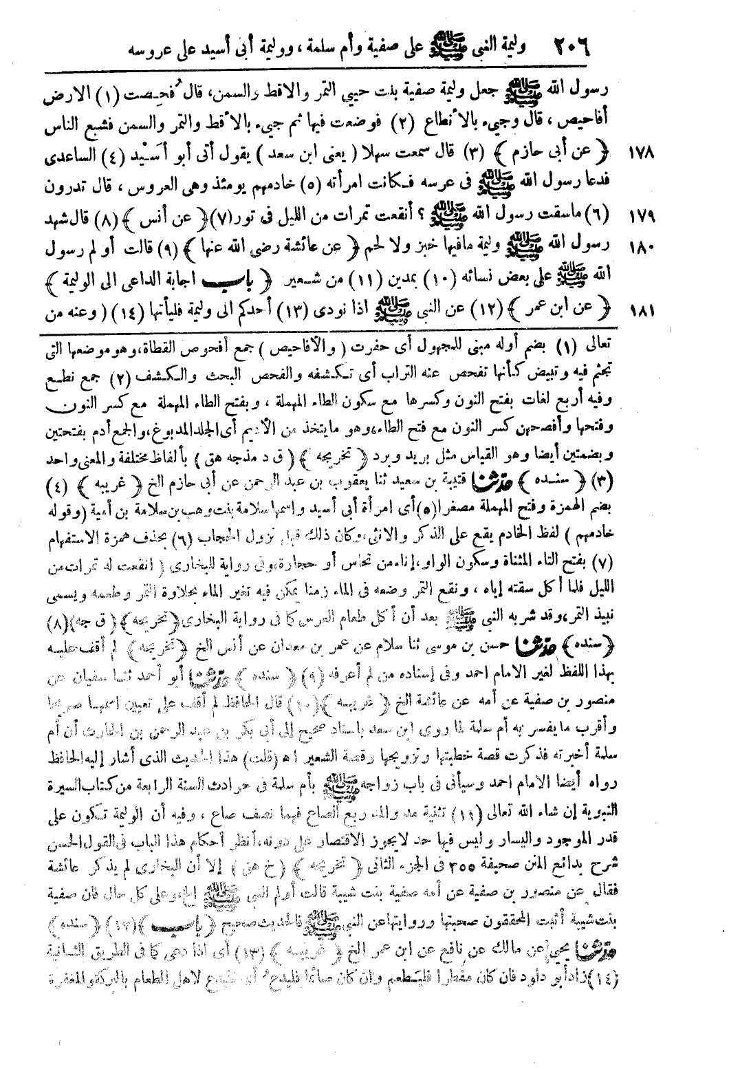 رسول الله صلى الله عليه وسلم جعل وليمة صفية بنت حيي التمر والاقط والسمن، قال فحصت (1) الأرض أفاحيص، قال وجئ بالأنطاع (2) فوضعت فيها ثم جئ بالأقط والتمر والسمن فشبع الناس (عن أبي حازم) (3) قال سمعت صهر (يعني ابن سعد) يقول إني أبو أسيد (4) الساعدي فدعا رسول الله صلى الله عليه وسلم في عرسه فكانت امرأته (5) خادمهم يومئذ وهي العروس، قال تدرون (6) ما سقت رسول الله صلى الله عليه وسلم؟ أنقعت تمرات من الليل في تور (7) (عن أنس) (8) قال سهد رسول الله صلى الله عليه وسلم وليمة ما فيها خبز ول لحم (عن عائشة رضي الله عنها) (9) قال أولم رسول الله صلى الله عليه وسلم على بعض نسائه (10) بمدين (11) من شعير (باب إجابة الداعي الى الوليمة) (عن ابن عمر) (12) عن النبي صلى الله عليه سلم إذا نودي (13) أحدكم إلى وليمة فليأتها (14) (وعنه من