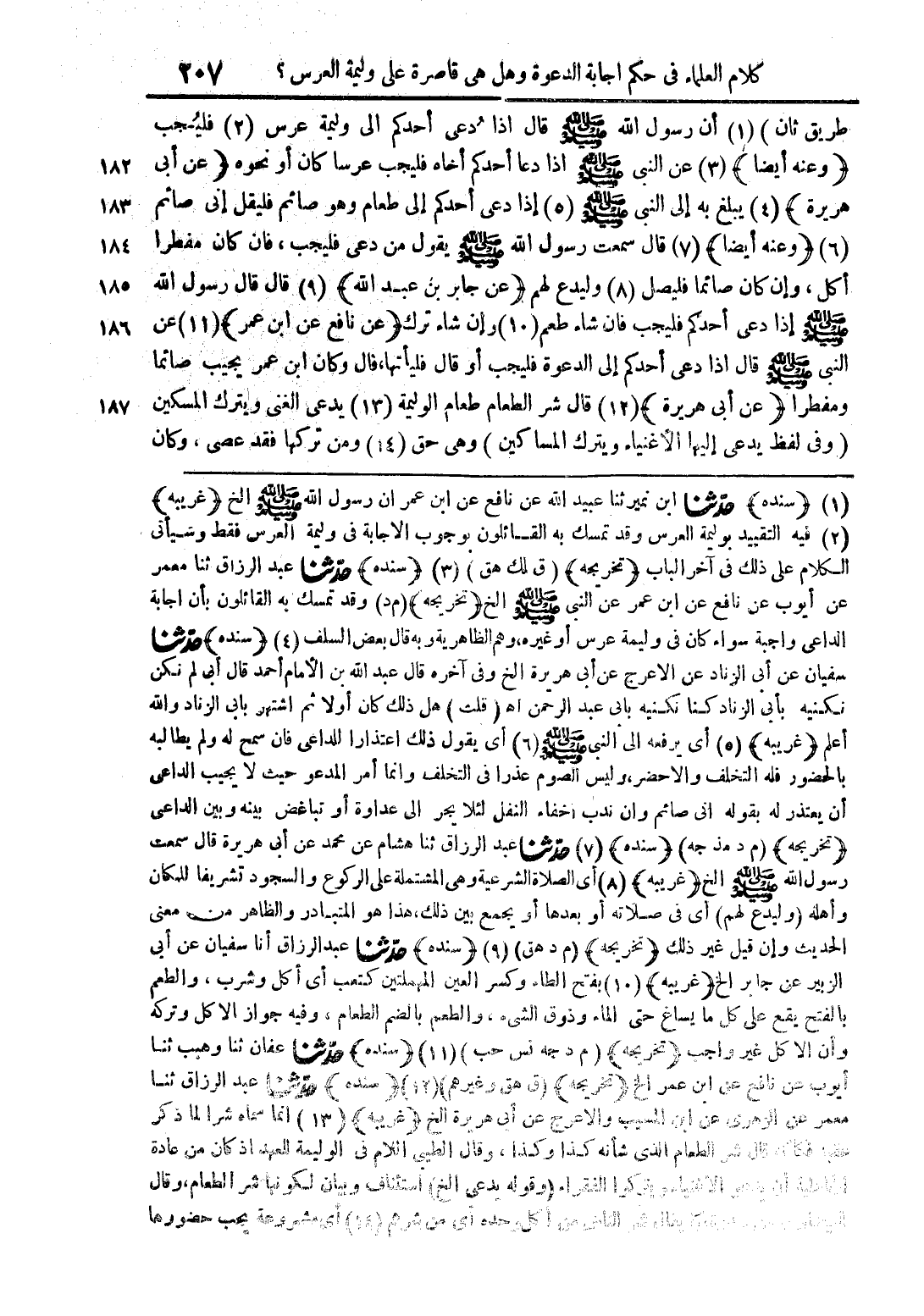 (1) (سنده) حدّثنا ابن نمير ثنا عبيد الله عن نافع عن ابن عمر أن رسول الله صلى الله عليه وسلم الخ (غريبه) (2) فيه التقييد بوليمة وقد تمسك به القائلون بوجوب الإجابة في وليمة العرس فقط وسيأتي الكلام على ذلك في آخر الباب (تخريجه) (ق لك هق) (3) (سنده) حدّثنا عبد الرزاق ثنا معمر عن أيوب عن نافع عن ابن عمر عن النبي صلى الله عليه وسلم (تخريج) (م د) وقد تمسك به القائلون بأن إجابة الداعي واجبة سواء كان في وليمة عرس أو غيره، وهم الظاهرية وبه قال بعض السلف (4) (سنده) حدّثنا سفيان عن أبي الزناد عن الأعرج عن أبي هريرة الخ وفي آخره قال عبد الله بن الأمام قال أبي لم نكن نكنيه بأبي الزناد كنا نكنيه بأبي عبد الرحمن أهـ (قلت) هل ذلك كان أولا ثم اشتهر بأبي الزناد والله أعلم (غريبه) (5) أي يرفعه الى النبي صلى الله عليه وسلم (6) أي يقول ذلك اعتذارا للداعي فإن سمح له ولم يطالبه بالحصور فله التخلف والا حضر، وليس الصوم عذار في التخلف وانما امر المدعو حيث لا يجيب الداعي أن يعتذر له بقوله إني صائم وان ندب إخفاء النفل لئلا يجر إلى عداوة أو تباغض بينه وبين الدعي (تخريجه) (م د مذ جه) (سنده) (7) حدّثنا عبد الرزاق ثنا هشام عن محمد عن أبي هريرة قال سمعت رسول الله صلى الله عليه وسلم الخ (غريبه) (8) أي الصلاة الشرعية وهي المشتملة على الركوع والسجود تشريفا للمكان وأهله (وليدع لهم) أي في صلاته او بعدها أو يجمع بين ذلك، هذا هو المتبادر والظاهر من معنى الحديث وإن قيل غير ذلك (تخريجه) (م د هق) (9) (سنده) حدّثنا عبد الرزاق أنا سفيان عن أبي الزبير عن جابر الخ (غريبه) (10) بفتح الطاء وكسر العين المهملتين كتعب أي أكل وشرب، والطعم بالفتح يقع على كل ما يساغ حتى الماء وذوق الشيء، والطعم بالضم الطعام، وفيه جواز الاكل وتركه وأن الأكل غير واجب (تخريجه) (م د جه نس حب) (11) (سنده) حدّثنا عفان ثنا وهيب ثنا أيوب عن نافع عن ابن عمر الخ (تخريجه) (ق هق وغيرهم) (12) (سنده) حدّثنا عبد الرزاق ثنا معمر عن الزهري عن ابن المسيب والأعرج عن ابي هريرة الخ (غريبه) (13) إنما سماه شرا لما ذكر عقب قال شر الطعام الذي شأنه كذا وكذا، وقال الطيى اللام في الوليمة للعهد إذ كان من عادة الجاهلية أن يدعو الأغنياء ويتركوا الفقراء (وقوله يدعى الخ) استئناف وبيان لكونها شر الطعام، وقال البيضاوي: ونظيره ما يقال: شر الناس من أكل وحده أي من شرهم (18) أي مشروعة يجب حضورها