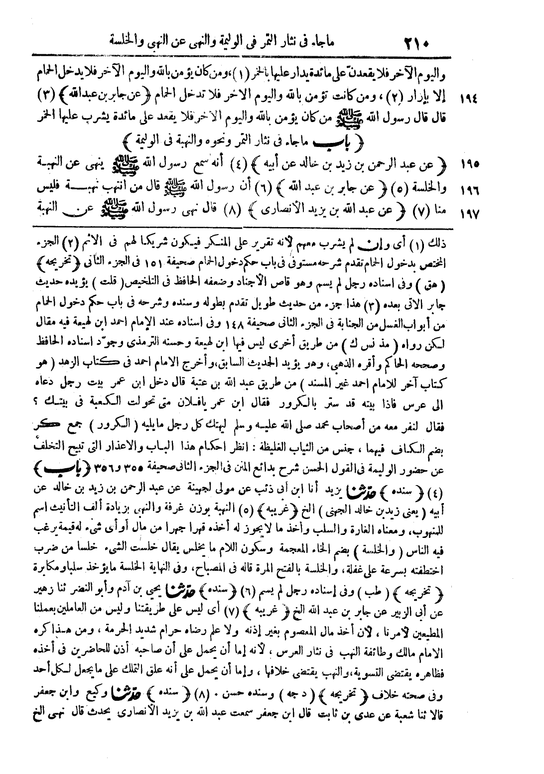 ذلك (1) أي وإن لم يشرب معهم لأنه تقرير على المنكر فيكون شريكا لهم في الإثم (2) الجزء المختص بدخول الحمام تقدم شرحه مستوفي في باب حكم دخول الحمام صحيفة 151 في الجزء الثاني (تخريجه) (هق) وفي اسناده رجل لم يسم وهو قاص الأجناد وضعفه الحافظ في التخليص (قلت) يؤيده حديث جابر الآتي بعده (3) هذا جزء من حديث طويل تقدم بطوله وسنده وشرحه في باب حكم دخول الحمام من أبواب الغسل من الجنابة في الجزء الثاني صحيفة 148 وفي إسناده عند الامام أحمد ابن لهيعة فيه مقال لكن رواه (مذ نس ك) من طريق أخرى ليس فيها ابن لهيعة وحسنه الترمذي وجوّد اسناده الحافظ وحصصه الحاكم وأقره الذهبي، وهو يؤيد الحديث السابق، وأخرج الامام احمد في كتاب الزهد (هو كتاب آخر للإمام أحمد غير المسند) من طريق عبد الله بن عتبة قال دخل ابن عمرو بيت رجل دعاه إلى عرس فإذا بيته قد ستر بالكرور فقال ابن عمر يا فلان متى تحولت الكعبة في بيتك؟ فقال لنفر معه من أصحاب محمد صلى الله عليه وسلم ليهتك كل رجل ما يليه (الكرور) جمع كر بضم الكاف فيهما، جنس من الثياب الغليظة: انظر أحكام هذا الباب والاعذار التي تبيح التخلف عن حضور الوليمة في القول الحسن شرح بدائع المنن في الجزء الثاني صحيفة 355 و 356 (باب) (4) (سنده) حدّثنا يزيد أنا ابن أبي ذئب عن مولى لجهينة عن عبد الرحمن بن زيد بن خالد عن أبيه (يعنى زيد بن خالد الجهني) الخ (غريبه) (5) النهبة بوزن غرفة والنهي بزيادة ألف التأنيث اسم للمنهوب، ومعناه الغارة والسلب وأخذ ما لا يجوز له أخذه قهرا جهرا من مال أو أي شيء له قيمة يرغب فيه الناس (والخلسة) بضم الخاء المعجمة وسكون اللام ما يخلس يقال خلست الشيء خلسا من ضرب اختطفته بسرعة على غفلة، والخلسة بالفتح المرة قاله في المصباح، وفي النهاية الخلسة ما يؤخذ سلبا ومكابرة (تخريجه) (طب) وفي إسناده رجل لم يسم (6) (سنده) حدّثنا يحيى بن آدم وأبو النضر ثنا زهير عن أبي الزبير عن جابر بن عبد الله الخ (غريبه) (7) أي ليس على طريقتنا وليس من العاملين بعملنا المطيعين لأمرنا، لأن أخذ مال المعصوم بغير إذنه ولا علم رضاه حرام شديد الحرمة، ومن هذا كره الإمام مالك وطائفة النهب في نثار العرس، لأنه إما أن يحمل على أن صاحبه أذن للحاضرين في أخذه فظاهره يقتضي التسوية، والنهب يقتضي خلافها، وإما أن يحمل على أنه علف التملك على ما يجعل لكل أحد وفي صحته خلافها، وإما أن يحمل على أنه علق التملك على ما يجعل لكل أحد وفي صحته خلاف (تخريجه) (د جه) وسنده حسن. (8) (سنده) حدّثنا وكيع وابن جعفر قالا ثنا شعبة عن عدي بن ثابت قال ابن جعفر سمعت عبد الله بن يزيد الأنصاري يحدث قال نهى الخ