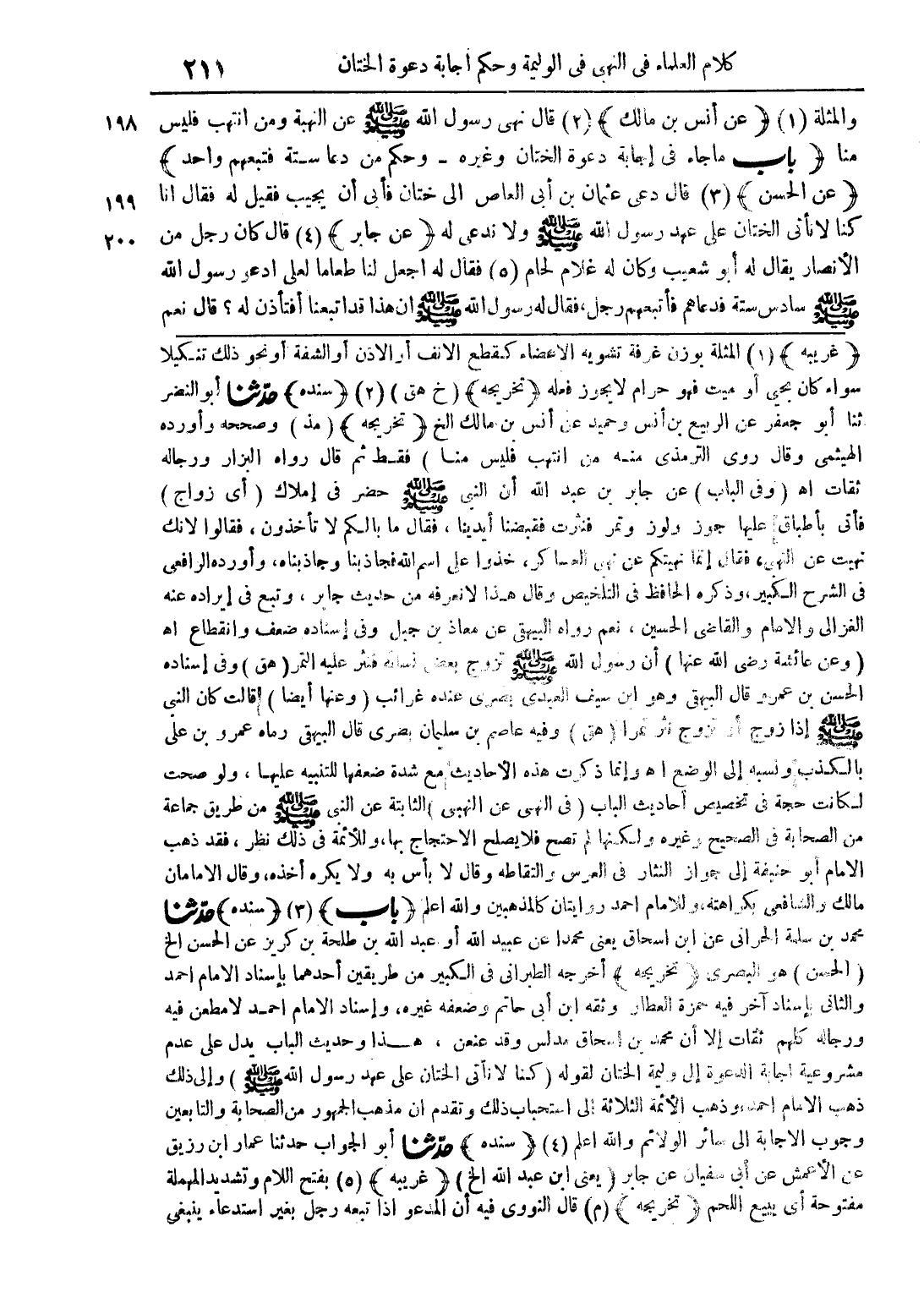 (غريبه) (1) المثلة بوزن غرفة تشوية الأعضاء كقطع الأنف أو الأذن أو الشفة أو نحو ذلك تنكيلا سواء كان يحيى أو ميت فهو حرام فعله (تخريجه) (خ هق) (2) (سنده) حدّثنا أبو النضر ثنا أبو جعفر عن الربيع بن أنس وحميد عن أنس بن مالك الخ (تخريجه) (مذ) وصححه وأورده الهيثمي وقال روى الترمذي منه من انتهب فليس منا) فقط ثم قال رواه البزار ورجاله ثقات أهـ (وفي الباب) عن جابر بن عبد الله أن النبي صلى الله عليه وسلم حضر في إملاك (أي زواج) فأتي بأطباق عليها جوز ولوز وتمر فنثرت فقبضنا أيدينا، فقال ما بالكم لا تأخذون، فقالوا لأنك نهيت عن النهي، فقال إنما نهيتكم عن نهي العساكر، خذوا على اسم الله فجاذبنا وجاذبناه، وأورده الرافعي في الشرح الكبير، وذكره الحافظ في التلخيص وقال هذا لا نعرفه من حديث جابر، وتبع في إيراده عنه الغزالي والامام والقاضي الحسين، نعم رواه البيهقي عن معاذ بن جبل وفي إسناده ضعف وانقطاع أهـ (عن عائشة رضى الله عنها) ان رسول الله صلى الله عليه وسلم تزوج بعض نسائه فنثر عليه التمر (هق) وفي إسناده الحسن بن عمرو قال البيهقي وهو ابن سيف العبدي بصري عنده غرائب (وعنها أيضا) قالت كان النبي صلى الله عليه وسلم إذا زوج او تزوج نثر تمرا (هق) وفيه عاصم بن سليمان بصري قال البيهقي رماه عمرو بن على بالكذب ونسبه إلى الوضع أهـ وإنما ذكرت هذه الأحاديث مع شدة ضعفها للتنبيه عليها، ولو صحت لكانت حجة في تخصيص أحاديث الباب (في النهي عن النهبي) الثابتة عن النبي صلى الله عليه وسلم من طريق جماعة من الصحابة في التصحيح وغيره ولكنها لم تصح فلا يصلح الاحتجاج بها، وللأئمة في ذلك نظر، فقد ذهب الامام أبو حنيفة إلى جواز النثار في العرس والتقاطه وقال لا بأس به ولا يكره أخذه، وقال الامامان مالك والشافعي بكراهته، وللإمام احمد روايتان كالمذهبين والله اعلم (باب) (3) (سنده) حدّثنا محمد بن سلمة الحراني عن ابن إسحاق يعني محمدا عن عبيد الله بن طلحة بن كريز عن الحسن الخ (الحسن) هو البصري (تخريجه) اخرجه الطبراني في الكبير من طريقين أحدهما بإسناد الامام أحمد والثاني بإسناد آخر فيه حمزة العطار وثقه ابن أبي هاتم وضعفه غيره، وإسناد الإمام أحمد لا مطعن فيه ورجاله كلهم ثقات إلا أن محمد بن إسحاق مدلس وقد عنعن، هذا وحديث الاب يدل على عدم مشروعية إجابة الدعوة إلى وليمة الختان لقوله (كنا لا نأتي الختان على عهد رسول الله صلى الله عليه وسلم) وإلى ذلك ذهب الإمام أحمد وذهب الأئمة الثلاثة إلى استحباب ذلك وتقدم ان مذهب الجمهور من الصحابة والتابعين وجوب الإجابة إلى سائر الولائم والله أعلم (4) (سنده) حدّثنا أبو الجواب حدثنا عمار ابن رزيق عن الأعمش عن أبي سفيان عن جابر (يعني ابن عبد الله الخ) (غريبه) (5) بفتح اللام وتشديد المهملة مفتوحة أي يبيع اللحم (تخريجه) (م) قال النووي فيه أن المدعو إذا تبعه رجل بغير استدعاء ينبغي