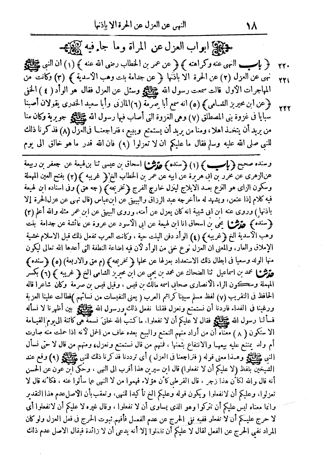 (باب النهى عنه وكراهته) (عن عمر بن الخطاب رضى الله عنه) (1) ان النبى صلى الله وسلم نهى عن العزل (2) عن الحرة الا باذنها (عن جدامة بنت وهب الأسدية) (3) وكانت من المهاجرات الأول قالت سمعت رسول الله صلى الله عليه وسلم وسئل عن العزل فقال هو الواد (4) الخفى (عن ابن محيريز الشامى) (5) انه سمع أبا صرمة (6) المازنى وأبا سعيد الخدرى يقولان أصبنا سبايا فى غزوة بنى المصطلق (7) وهى الغزوة التى أصاب فيها رسول الله صلى الله عليه وسلم جويرية وكان منا من يريد أن يتخذ اهلا, ومنا من يريد أن يستمع ويبيع, فتراجعنا فى العزل (8) فذكرنا ذلك للنبى صلى الله عليه وسلم فقال ما عليكم ان لا تعزلوا (9) فان الله قدر ما هو خالق إلى يوم