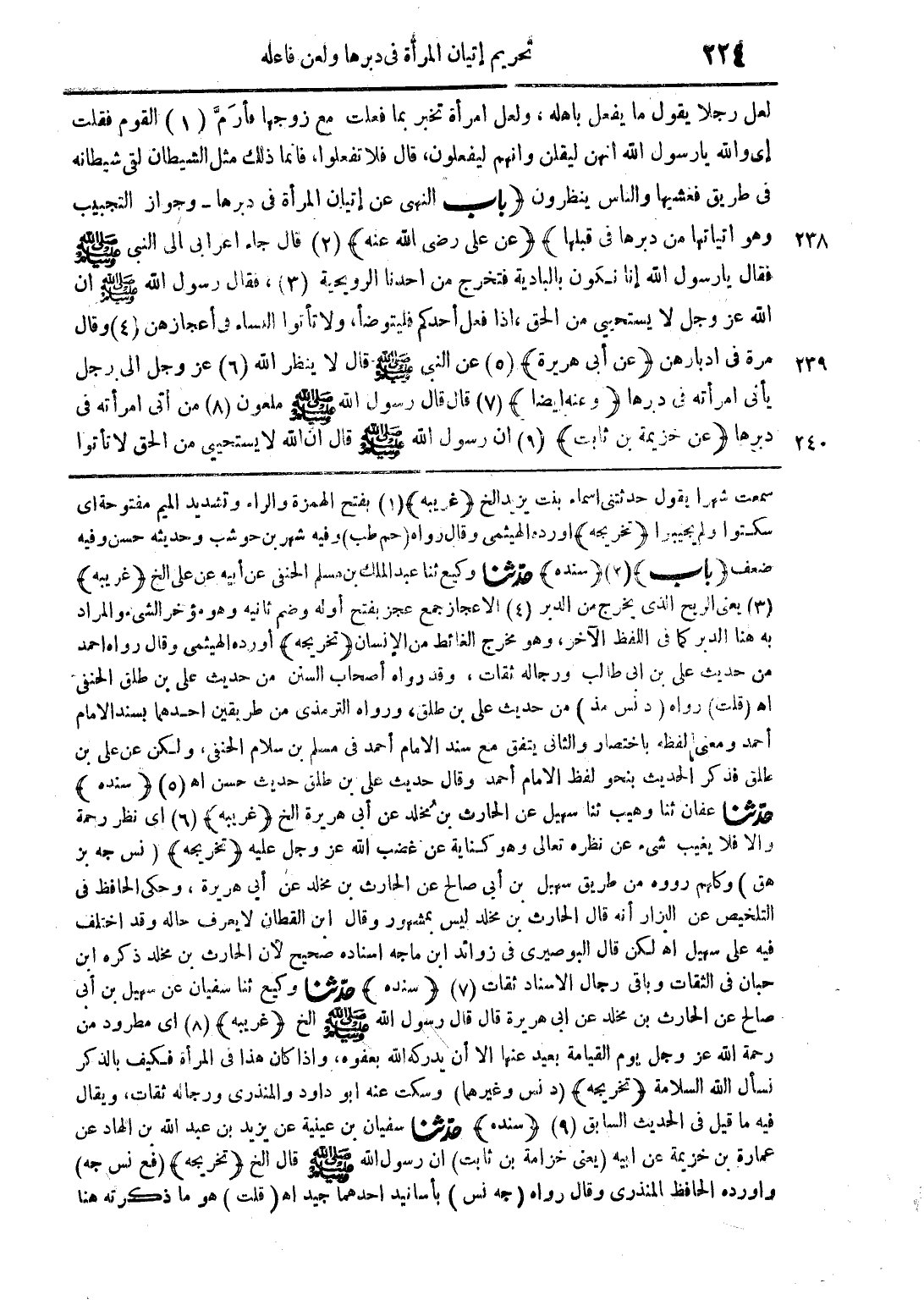 لعل رجلا يقول ما يفعل باهله, ولعل امرأة تخبر بما فعلت مع زوجها فأرمَّ (1) القوم فقلت إى والله يا رسول الله انهن ليقلن وانهم ليفعلون, قال فلا تفعلوا, فأنما ذلك مثل الشيطان لقى شيطانه فى طريق فغشيها والناس ينظرون (باب النهى عن إيتان المرأة فى دبرها- وجواز التجبيب وهو اتياتها من دبرها فى قبلها) (عن على رضى الله عنه) (2) قال جاء اعرابى الى النبى صلى الله عليه وسلم فقال يا رسول الله إنا نكون بالبادية فتخرج من احدنا الرويحة (3) , فقال رسول الله صلى الله عليه وسلم ان الله عز وجل لا يستحيي من الحق, اذا فعل أحدكم فليتوضأ, ولا تأتوا النساء فى أعجازهن (4) وقال مرة فى ادبارهن (وعنه ايضا) (7) قال قال رسول الله صلى الله عليه وسلم ملعون (8) من أتى امرأته فى دبرها (عن خزيمة بن ثابت) (9) ان رسول الله صلى الله عليه وسلم قال ان الله لا يستحيي من الحق لا تأتوا