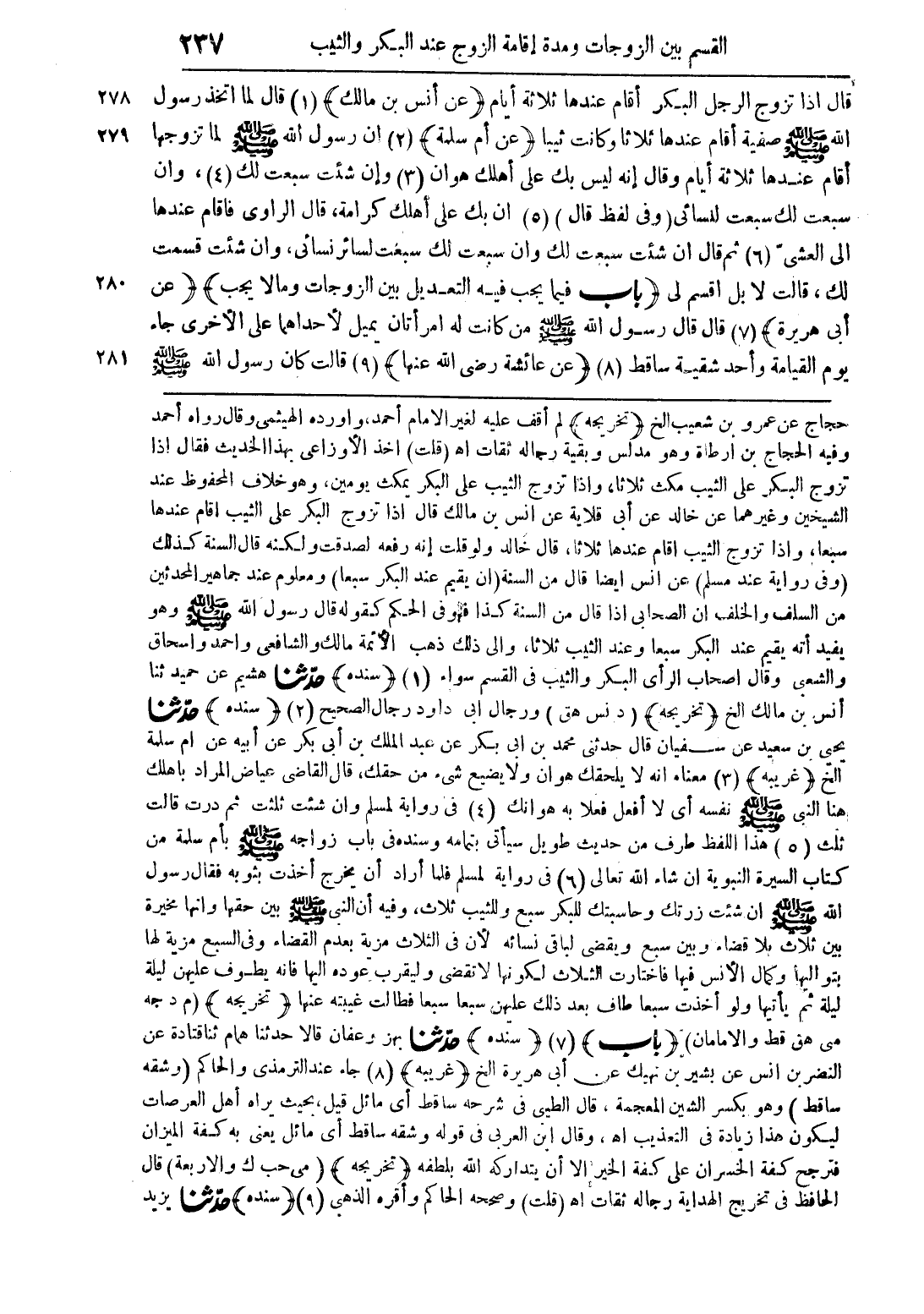حجاج عن عمرو بن شعيب الخ (تخريجه) لم أقف عليه لغير الامام أحمد, واورده الهيثمى وقال رواه أحمد وفيه الحجاج بن ارطاة وهو مدلس وبقية رجاله ثقات اهـ (قلت) اخذ الأوزاعى بهذا الحديث فقال اذا تزوج البكر على الثيب مكث ثلاثا, واذا تزوج الثيب على البكر يمكث يومين, وهو خلاف المحفوظ عند الشيخين وغيرهما عن خالد عن أبى قلاية عن انس بن مالك قال اذا تزوج البكر على الثيب اقام عندها سبعا, واذا تزوج الثيب اقام عندها ثلاثا, قال خالد ولوقلت إنه رفعه لصدقت ولكنه قال السنة كذلك (وفى رواية عند مسلم) عن انس ايضا قال من السنة (ان يقيم عند البكر سبعا) ومعلوم عند جماهير المحدثين من السلف والخلف ان الصحابى اذا قال من السنة كذا فهو فى الحكم كقوله قال رسول الله صلى الله عليه وسلم وهو يفيد أنه يقيم عند البكر سبعا وعند الثيب ثلاثا, والى ذلك ذهب الأئمة مالك والشافعى واحمد واسحاق والشعبى وقال اصحاب الرأى البكر والثيب فى القسم سواء (1) (سنده) هيثم عن حميد ثنا أنس بن مالك الخ (تخرجه) (د نس هق) ورجال ابى داود رجال الصحيح (2) (سنده) حدثنا يحيى بن سعيد عن سفيان قال حدثنى محمد بن ابى بكر عن عبد الملك بن أبى بكر عن أبيه عن امسلمة الخ (غريبه) (3) معناه انه لا يلحقك هو ان ولا يضيع شئ من حقك, قال القاضى عياض المراد باهلك هنا النبى صلى الله عليه وسلم نفسه أى لا أفعل فعلا به هو انك (4) فى رواية لمسلم وان شئت ثلثت ثم درت قالت ثلث (5) هذا اللفظ طرف من حديث طويل سيأتى بتمامه وسنده فى باب زواجه صلى الله عليه وسلم بأم سلمة من كتاب السيرة النبوية ان شاء الله تعالى (6) فى رواية لمسلم فلما أراد أن يخرج أخذت بثوبه فقال رسول الله صلى الله عليه وسلم ان شئت زرتك وحاسبتك للبكر سبع وللثيب ثلاث, وفيه أن النبى صلى الله عليه وسلم بين حقها وانها مخيرة بين ثلاث بلا قضاء وبين سبع ويقضى لباقى نسائه لأن فى الثلاث مزية بعدم القضاء وفى السبع مزية لها بتواليها وكمال الأنس فيها فاختارت الثلاث لكونها لا تقضى وليقرب عوده اليها فانه يطوف عليهن ليلة ليلة ثم يأتيها ولو أخذت سبعا طاف بعد ذلك عليهن سبعا سبعا فطالت غيبته عنها (تخريجه) (م د جه مى هق قط والامامان) (باب) (7) (سنده) حدثنا بهز وعفان قالا حدثنا همام ثنا قتادة عن النضربن انس عن بشير بن نهيك عن أبى هريرة الخ (غريبه) (8) جاء عند الترمذى والحاكم (وشقه ساقط) وهو بكسر الشين المعجمة, قال الطيبى فى شرحه ساقط أى مائل قيل, بحيث يراه أهل العرصات ليكون هذا زيادة فى التعذيب اهـ, وقال ابن العربى فى قوله وشقه ساقط أى مائل يعنى به كفة الميزان فترجح كفة الخسران على كفة الخير الا أن يتداركه الله لطفه (تخريجه) (مى حب ك والاربعة) قال الحافظ فى تخريج الهداية رجاله ثقات اهـ (قلت) وصححه الحاكم وأقره الذهبى (9) (سنده) حدثنا يزيد