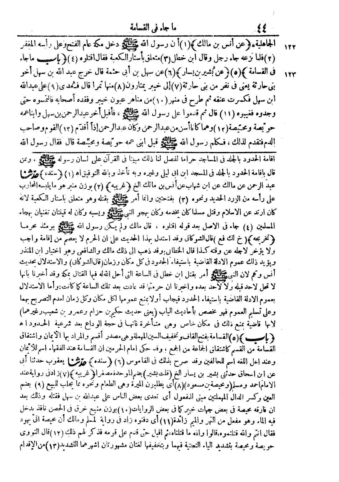 الجاهلية* (عن أنس بن مالك) (1) أن رسول الله صلى الله عليه وسلم دخل مكة عام الفتح وعلى رأسه المغفر (2) فلما نزعه جاء رجل وقال ابن خطل (3) متعلق بأستار الكعبة فقال اقتلوه (4) (باب ما جاء فى القسامة) (*) (عن بشير بن يسار) (6) عن سهل بن أبى حثمة قال خرج عبد الله بن سهل أخو بنى حارثة يعنى فى نفر من بنى حارثة (7) إلى خيبر يمتارون (8) منها تمراً قال فعدى (9) على عبد الله ابن سهل فكسرت عنقه ثم طرح فى منهر (10) من مناهر عيون خيبر وفقده أصحابه فالتمسوه حتى وجدوه فغيبوه (11) قال ثم قدموا على رسول الله صلى الله عليه وسلم، فأقبل أخو عبد الرحمن بن سهل وابنا عمه حويصة ومحيصة (12) وهما كانا أسن من عبد الرحمن وكان عبد الرحمن إذا أقدم (13) القوم وصاحب الدم فتقدم لذلك، فكلم رسول الله صلى الله عليه وسلم قبل ابنى عمه حويصة ومحيصة قال فقال رسول الله