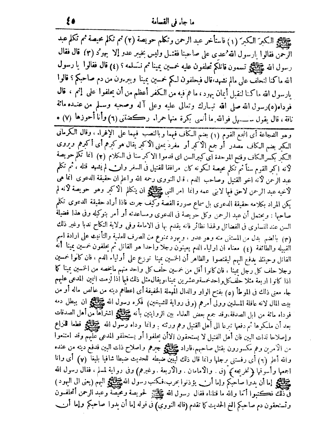 صلى الله عليه وسلم الكبر الكبر (1) فاستأخر عبد الرحمن وتكلم حويصة (2) ثم تكلم محيصة ثم تكلم عبد الرحمن فقالوا يا رسول الله عدى على صاحبنا فقتل وليس بخيبر عدو إلا يهود (3) قال فقال رسول الله صلى الله عليه وسلم تسمون قاتلكم تحلفون عليه خمسين يميناً ثم نسلمه؟ (4) قال فقالوا يا رسول الله ما كنا لنحلف على مالم نشهد، قال فيحلفون لك خمسين يميناً ويبرءون من دم صاحبكم؟ قالوا يا رسول الله ما كنا لنقبل أيمان يهود، ما هم فيه من الكفر أعظم من أن يحلفوا على إثم، قال فودأه (5) رسول الله صلى الله تبارك وتعالى عليه وعلى آله وصحبه وسلم من عنده مائة ناقة، قال يقول سهل فوالله. ما أنسى بكرة منها حمراء ركضتنى (6) وأنا أحوزها (7) *