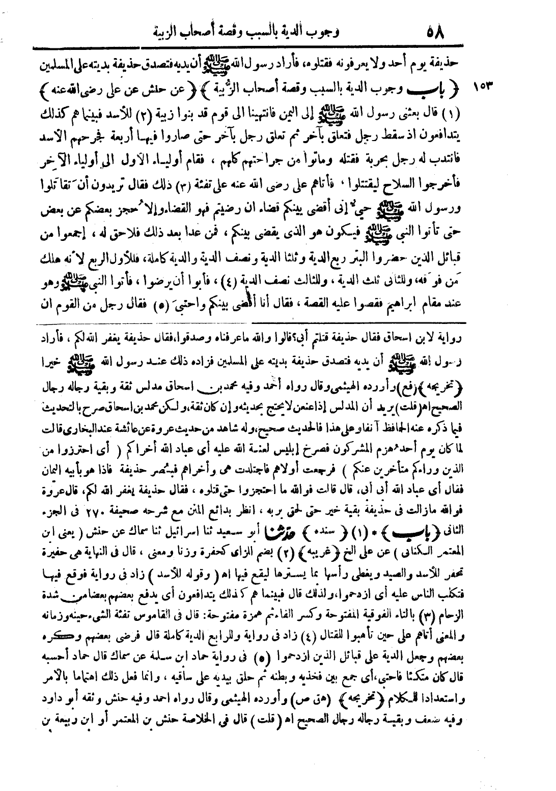 حذيفة يوم أحد ولا يعرفونه فقتلوه، فأراد رسول الله صلى الله عليه وسلم أن يديه فتصدق حذيفة بديته على المسلمين (باب وجوب الدية بالسبب وقصة أصحاب الزبية) (عن حنش عن على رضى الله عنه) (1) قال بعثنى رسول الله صلى الله عليه وسلم إلى اليمن فانتهينا إلى قوم قد بنوا زبية (2) للأسد فبينما هم كذلك يتدافعون إذ سقط رجل فتعلق بآخر حتى صاروا فيها أربعة فجرحهم الأسد فانتدب له رجل بحربة فقتله وماتوا من جراحتهم كلهم، فقام أولياء الأول إلى أولياء الآخر فأخرجوا السلاح ليقتلوا فأتاهم على رضى الله عنه على تفئة (3) ذلك فقال تريدون أن تقاتلوا ورسول الله صلى الله عليه وسلم حي إنى أقضى بينكم قضاء إن رضيتم فهو القضاء وإلا حجز بعضكم عن بعض حتى تأتوا النبى صلى الله عليه وسلم فيكون هو الذى يقضى بينكم، فمن عدا بعد ذلك فلاحق له، اجمعوا من قبائل الذين حضروا البر ربع الدية وثلثا الدية ونصف الدية والدية كاملة، فللأول الربع لأنه هلك من فوقه، وللثانى ثلث الدية، وللثالث نصف الدية (4)، فأبوا أن يرضوا، فأتوا النبى صلى الله عليه وسلم وهو عند مقام إبراهيم فقصوا عليه القصة، فقال أنا أقضى بينكم واحتبى (5) فقال رجل من القوم أن