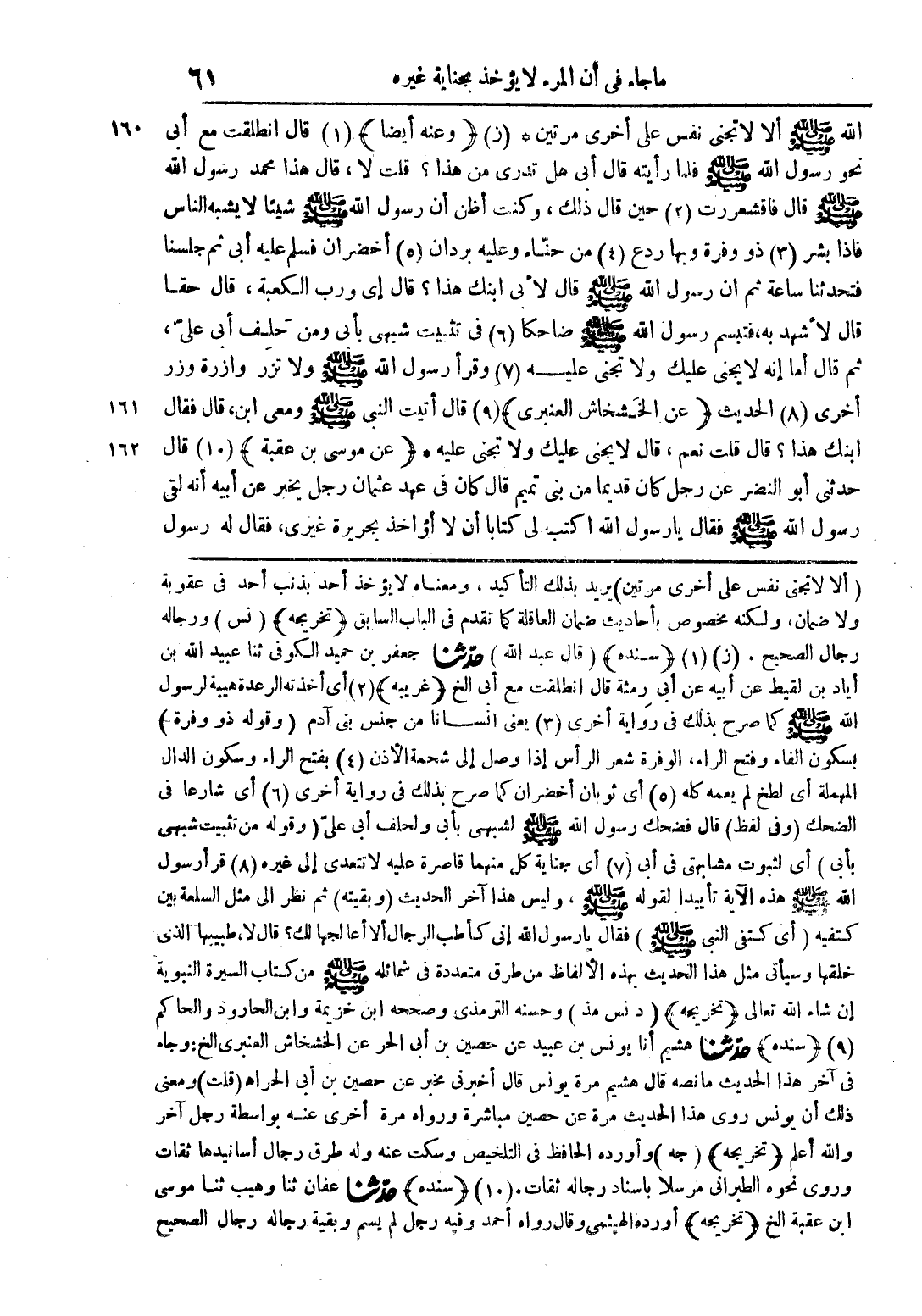 (ألا لا تجني نفس على أخرى مرتين) يريد بذلك التأكيد، ومعناه لايؤخذ احد في عقوبة ولا ضمان، ولكنه مخصوص باحاديث ضمان العاقلة كما تقدم في الباب السابق (تخريجه) (نس) ورجاله رجال الصحيح. (ز) (1) 0 (سنده) (قال عبد الله) حدثنا جعفر بن حميد الكوفي ثنا عبيد الله بن أياد بن لقط عن ابيه عن أبي رمثة قال انطلقت مع ابى الخ (غريبه) (2) أى أخذته الرعدة هيبة لرسول الله صلى الله عليه وسلم كما صرح بذلك في رولية أخرى (3) يعنى انسانا من جنس بنى ادم (وقوله ذو وفرة) بسكون الفاء وفتح الراء، الوفرة شعر الراس إذا وصل إلى شحمة الاذان (4) بفتح الراء وسكون الدال المهمله اي لطخ لم يمه كله (5) اي ثوبان أخضران كما صرح بذلك في رواية أخري (6) أى شارعا في الضحك (وفي لفظ) قال فضحك رسول الله صلى الله عليه وسلم لشبهى بابلى واحف أبى على (وقوله من تثبيت شبهي بابى) اى لثبوت مشابهتى في ابي (7) اى جناية كل منهما قاصرة عليه لاتتعدى اللى غيره (8) قرأ رسول الله صلى الله عليه وسلم هذه الاية تأييد لقوله صلى الله عليه وسلم، وليس هذا آخر الحديث (وبقيته) ثم نظر الى مثل السلعة بين كتفيه (اى كتفي النبي صلى الله عليه وسلم) فقال يارسول الله إنلى كأطب الرجال ألا أعالجها لك؟ قال لا، طبيبها الذى خلقها وسياتي مثل هذا الحديث بهذه الالفاظ من طرق متعددة في شمائله صلى الله عليه وسلم من كتاب السيرة النبويه إن شاء الله تعالى (تخريجه) (د نس مذ) وحسنه الترمزى وصححه ابن خزيمة وابن الحارود والحاكم (9) (سنده) حدثنا هشيم أنا يونس بن عبيد عن حصين بن أبي الحر عن الخشخاش العنبري الخ: وجاء في آخر هذا الحديث مانصه قال هشيم مرة يونس قال أخبرني مخبر عن حصين بن ابي الحراه (قلت) ومعنى ذلك اعلم (تخريجه) (جه) واورده الحافظ في التلخيص وسكت عنه وله طرق رجال اسانيدها ثقات وروى نحوه الطبرانى مرسلا باسناد رجاله ثقات. (10) (سنده) حدثنا عفاف ثنا وهيب ثنا موسى ابن عقبة الخ (تخريجه) وأورده الهيثميوقال رواء أحمد وفيه رجل لم يسم وبقية رجاله رجال الصحيح