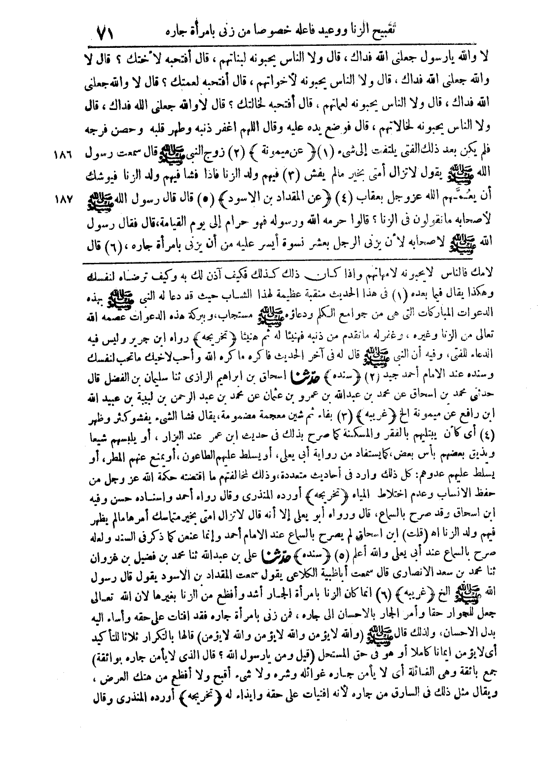 لا والله يا رسول الله جعلنى الله فداك، قال ولا الناس يحبونه لبناتهم، قال أفتحبه لأختك؟ قال لا والله جعلنى الله فداك، قال ولا الناس يحبونه لأخواتهم، قال أفتحبه لعمتك؟ قال لا والله جعلنى الله فداك، قال ولا الناس يحبونه لعماتهم، قال أتحبه لخالتك؟ قال لا والله جعلنى الله فداك، قال ولا الناس يحبونه لخالاتهم، قال فوضع يده عليه وقال اللهم أغفر ذنبه وطهر قلبه وحصن فرجه فلم يكن بعد ذلك الفتى يلتفت إلى شئ (1) (عن ميمونة) (2) زوج النبى صلى الله عليه وسلم قال سمعت رسول الله صلى الله عليه وسلم يقول لا تزال أمتى بخير ما لم يفش (3) فيهم ولد الزنا فإذا فشا فيهم ولد الزنا فيوشك أن يعمَّهم الله عز وجل بعقاب (4) (عن المقداد بن الأسود) (5) قال قال رسول الله صلى الله عليه وسلم لأصحابه ما تقولون في الزنا؟ قالوا حرمه الله ورسوله فهو حرام إلى يوم القيامة، قال فقال رسول الله صلى الله عليه وسلم لأصحابه لأن يزنى الرجل بعشر نسوة أيسر عليه من أنى يزنى بامرأة جاره، (6) قال