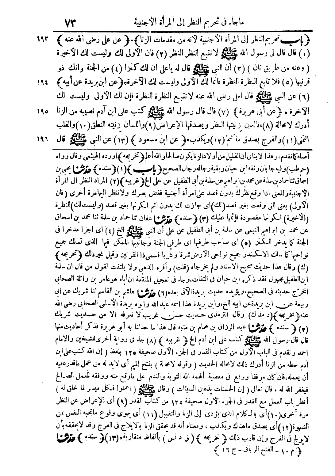 (باب تحريم النظر إلى المرأة الأجنبية لأنه من مقدمات الزنا). (عن على رضى الله عنه) (1) قال قال لى رسول الله صلى الله عليه وسلم لا تتبع النظر النظر (2) فإن الأولى لك وليست لك الأخيرة (وعنه من طريق ثان) (3) أن النبى صلى الله عليه وسلم قال له يا على إن لك كنزاً (4) من الجنة وإنك ذو قرنيها (5) فلا تتبع النظرة النظرة فإنما لك الأولى وليست لك الآخرة * (عن ابن بريدة عن أبيه) (6) عن النبى صلى الله عليه وسلم قال لعلى رضى الله عنه لا تتبع النظرة النظرة فإن لك الأولى وليست لك الآخرة * (عن أبى هريرة) (7) قال قال رسول الله صلى الله عليه وسلم كتب على ابن آدم نصيبه من الزنا أدرك لا محالة (8)، فالعين زنيتها النظر ويصدقها الإعراض (9) واللسان زنيته النطق (10) والقلب التمنى (11) والفرج يصدق ما ثم (12) ويكذب * (عن ابن مسعود) (13) عن النبى صلى الله عليه وسلم قال
