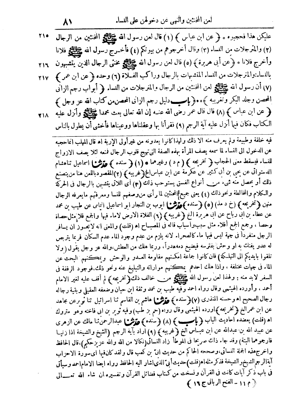 فيه خلقة وطبيعه ولم يعرف من الا ذلك ولهذ كانوا يعدونه ولهاذا كانو يعدونه من غير اولى الابه اه قال المهلب انما حجبه عن الد خول الى النساء لما يصف المراه بهذه الصفه التى تهيج قلوب الرجال فمنعه لئلا يصف الازواج للنساء قيسقط معن الحجاب (تخريجه) (م د) وغيرها * (1) (سنده) حدثنا اسماعيل ثنا هشام الدستواءى عن يحيلى بن ابى كثير عن عكرمه عن ابن عباس الخ (غريبه) (2) المقصود بللعن هنا من يتصنع ذلك او يحصل منه شئ من انواع الفسق يستوحب ذلك (3) اى اللاتى يتشبهن بالرجال فى الحركه والكلام والمخالطه ونحو ذلك (4) يعن جميع الحنئين لما راى من وصفهم للنسا ومعرفتهم ما يعرفه الرجال منهن (تخريجه) (خ د مذ) (5) (سنده) حدثنا ايوب بن النجار ابو اسماعيل اليمانى عن طيب بن محمد عن عطاء بن ابى رباح عن ابى هريره الخ (غريبه) (6) الفلاة الارض لاماء فيها والجمع فلا مثل حصاة وحصا، وجمع الجمع افلاء مثل سبب واسباب قاله فى المصباح اهـ (قلت) والمعنى انه لايجوز ان يسافر الرجل منفردا في جه ليس فيها ماء كالصحراء لانه يلزم من عدم وجود الماء عدم السكان غربما يتربص له عدو يفتك به او وحش بفترسه فيضيع دمه هدرا، وربما هلك من العطش، والله عز وجل يقول (ولا تلقوا بايديكم الى التهلكه) فان كانوا جماعه امكنهم مواراته والتبليع عنه ونحو ذلك، فوجود الرافقه في السفر لابد منه: وهذا لعن رسول الله صلى الله عليه وسلم خالف ذلك (تخريجه) لم اقف عليه لغير الامام احمد، واورده الهيثمى وقال رواه احمد وفيه طيب بن محمد وثقة ابن حبان وضعفه العقيلى وبقية رجاله رجال الصحيح اهـ وحسنه المنذرى (7) (سنده) حدثنا هاشم بن القاسم ثنا اسرائيل ثنا ئوثر عن مجاهد عن ابن عمر الخ (تخريجه) واورده الهيثمى وقال رواه (حم بز طب) وفيه ثوير بن ابى فاخته وهو متروك اهـ (قلت) يعضده احاديث الباب (باب) (8) (سنده) حدثنا عبد الرحمن ثنا مالك عن الزهرى عن عبيد الله بن عبد الله عن بن عباس الخ (غريبه) (9) اراد باية الرجم (الشيخ والشيخه اذا زنيا فارجموهما البته) وقد جاء ذلك صريحا فى الموطا زاد النسائى (نكالا من الله والله عزيز حكيم)،قال الحافظ واخرج هذه الجمله النسائى، وصححه الحاكم من حديث ابى بن كعب قال ولقد كان فيها اى سوره الاحزاب اية الرجم الشيخ والشيخه فذكر مثله اهـ (قلت) حديث ابى الذى اشار اليه الحافظ رواه ايضا الامام احمد وسياتىفي باب ذكرايات كانت في القران ونسخت من كتاب فضائل القران وتفسيره إن شاء الله تعالى