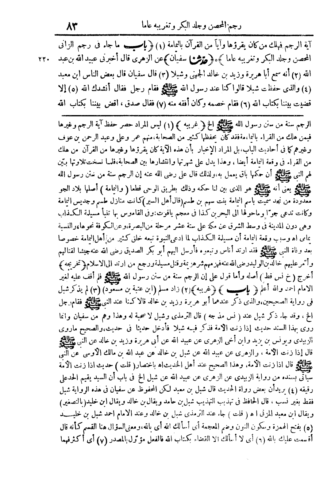 الرجم سنة من سنن رسول الله صلى الله عليه وسلم الخ (غريبه) (1) ليس المراد حصر حفظ اية الرجم وغيرها فيمن هلك من القراء باليمامه فقد كان يحفظها كثير من الصحابه، منهم عمر وعلى وعبد الرحمن بن عوف وغيرهم كما فى احاديث الباب، بل المراد الاخبار بان هذه الاية كان يقرؤها وغيرها من القران من هلك من القراء فى وقعة اليمامه ايضا، وهذا يدل على شهرتها وانتشارها بين الصحابه، فلما نسخت تلاوتها بين لهم النبى صلى الله عليه وسلم يعنى انه صلى الله عليه وسلم هو الذى بين لنا حكمه وذلك بطريق الوحى قطعا (واليمامه) اصلها بلاد الجو معدوده من نجد سميت باسم اليمامه بنت سهم بن طسم (قال اهل السير) كانت منازل طسم وجديس اليمامه وكانت تدعى جوا وما حولها الى البحرين كذا فى معجم ياقوت: وفى القاموس بها تنبا مسيله الكذاب وهى دون المدينه فى وسط الشرق عن مكه على ستة عشر مرحله من البصره، وعن الكوفه نحوها، وبالنسبه يمامى اهـ وسبب وقعة اليمامه ان مسلمه الكذاب لما ادعى النبوه تبعه خلق كثير من اهل اليمامه خصوصا بعد وفاة النبى صلى الله عليه وسلم فقد ارتد اناس وتبعوه فارسل اليهم ابو بكر من اهل عنه جيشا لقتلهم واملر عليهم خالد بن الوليد رضى الله عنه فهزتهم شر هزيمة وقتل مسيلمه ورجع من ارتد الى الاسلام (تخريجه) اخرج (خ نس قط) اصله واما قول على ان الرجم سنة من سنن رسول الله صلى الله عليه وسلم فلم اقف عليه لغير الامام احمد والله اعلم (باب) (غريبه) (2) زاد مسلم (ابن عتبه بن مسعود) (3) لم يذكر شبل فى رؤايه الصحيحين، والذى ذكر عندهما ابو هريرهوزيد بن خالد قلا كنا عند النبى صلى الله عليه وسلم فقام رجل الخ، وقد جاء ذكر شبل عند (نس مذ جه) قال الترمذى وشبل لاصحبه له وهذا وهم من سفيان وانما روى بهذا السند حديث اذا زنت الامه فذكر فيه شبلا فادخل حديثا فى حديث، والصحيح ماروى الزبيدى ويونس بن يزيد وابن اخى الزهرى عن عبيد الله عن ابى هريره وزيد بن خالد عن النبي صلى الله عليه وسلم قال اذا زنت الامه، والزهرى عن عبيد الله عن شبل بن خالد عن عبد الله بن ماللك الاوسى عن النبي صلى الله عليه وسلم قال اذا زنت الامه، وهذا الصحيح عند اهل الحديث اهـ باختصار (قلت) حديث اذا زنت الامهسياتى بسنده من رواية الزبيدى عن الزهرى عن عبيد الله عن شبل الخ فى باب ان السيد يقيم الحد على رقيقه (4) يريد ان بعض رواة الحديث قال شبل بن حامد ويقال بن خالد ويقال بن خليد (بالتصغير) ويقال ابن معبد المزنى اهـ (قلت) جاء عند الترمذى شبل بن خالد وعند الامام احمد شبل بن خليد (5) بفتح الهمزه وسكون النون وضم المعجمه اى اسالك الله اى بالله، ومعنى الشؤال هنا القسم كأنه قال اقسمت عليك بالله (6) اى لا اسالك الا القضاء بكتاب الله فالفعل مؤول بالمصدر (7) أي أكثر فهما