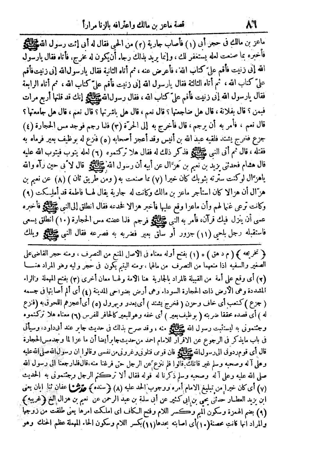 ماعز بن مالك في حجر أبى (1) فأصاب جارية (2) من الحى فقال له أبى إئت رسول الله صلى الله عليه وسلم فأخبره بما صنعت لعله يستغفر لك، وإنما يريد بذلك رجاء أن يكون له مخرج، فأتاه فقال يا رسول الله إنى زنيت فأقم علىّ كتاب الله، فأعرض عنه، ثم أتاه الثانية فقال يا رسول الله إنى زنيت فأقم علىَّ كتاب الله، ثم أتاه الثالثة فقال يا رسول الله إنى زنيت فأقم علىّ كتاب الله، ثم أتاه الرابعة فقال يا رسول الله إنى زنيت فأقم علىّ كتاب الله، فقال رسول الله صلى الله عليه وسلم إنك قلتها أربع مرات فبمن؟ قال بفلانة، قال هل ضاجعتها؟ قال نعم، قال هل باشرتها؟ قال نعم، قال هل جامعتها؟ قال نعم، فأمر به أن يرجم، قال فأخرج به إلى الحرّة (3) فلما رجم فوجد مس الحجارة (4) جزع فخرج يشتد فلقيه عبد الله بن أنيس وقد أعجز أصحابه (5) فنزع له بوظيف بعير فرماه به فقتله، قال ثم أتى النبى صلى الله عليه وسلم فذكر ذلك له فقال هلا تركتموه (6) لعله يتوب فيتوب الله عليه قال هشام فحدثنى يزيد بن نعيم بن هزَّال عن ابيه أن رسول الله صلى الله عليه وسلم قال لأبى حين رآه والله يا هزَّال لو كنت سترته بثوبك كان خيراً (7) مما صنعت به (ومن طريق ثان) (8) عن نعيم بن هزَّال أن هزالاً كان استأجر ماعز بن مالك وكانت له جارية يقال لها فاطمة قد أملكت (9) وكانت ترعى غنماً لهم وأن ماعزاً وقع عليها فأخبر هزالاً فخدعه فقال انطلق إلى النبى صلى الله عليه وسلم فأخبره عسى أن ينزل فيك قرآن، فأمر به النبى صلى الله عليه وسلم فرجم فلما عضته مس الحجارة (10) انطلق يسعى فاستقبله رجل بلحي (11) جزور أو ساق بعير فضربه به فصرعه فقال النبى صلى الله عليه وسلم ويلك