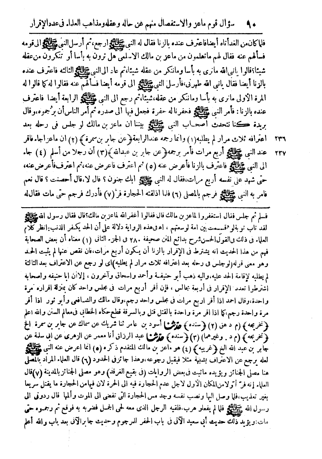 فلما كان من الغد أتاه أيضاً فاعترف عنده بالزنا فقال له النبى صلى الله عليه وسلم ارجع، ثم أرسل النبى صلى الله عليه وسلم إلى قومه فسألهم عنه فقال لهم ما تعلمون من ماعز بن مالك الأسلمى هل ترون به بأساً أو تنكرون من عقله شيئاً؟ قالوا يا نبى الله ما نرى به بأساً وما ننكر من عقله شيئاً، ثم عاد إلى النبى صلى الله عليه وسلم الثالثة فاعترف عنده بالزنا أيضاً فقال يا نبى الله طهرنى، فأرسل النبى صلى الله عليه وسلم إلى قومه أيضاً فسألهم عنه فقالوا له كما قالوا له المرة الأولى ما نرى به بأساً وما ننكر من عقله شيئاً، ثم رجع إلى النبى صلى الله عليه وسلم الرابعة أيضاً فاعترف عنده بالزنا: فأمر النبى صلى الله عليه وسلم فحفرنا له حفرة فجعل فيها إلى صدره ثم أمر الناس أن يرجموه، وقال بريدة كنا نتحدث أصحاب النبى صلى الله عليه وسلم بيننا أن ماعز بن مالك لو جلس في رحله بعد اعترافه ثلاث مرار لم يطلبه (1) وإنما رجمه عند الرابعة (عن جابر بن سمرة) (2) إن ماعزاً جاء فاقر عند النبى صلى الله عليه وسلم أربع مرات فأمر برجمه (عن جابر بن عبد الله) (3) أن رجلاً من أسلم (4) جاء إلى النبى صلى الله عليه وسلم فاعترف بالزنا فأعرض عنه (5) ثم اعترف فاعرض عنه، ثم اعترف فأعرض عنه، حتى شهد على نفسه أربع مرات، فقال له النبى صلى الله عليه وسلم أبك جنون؟ قال لا، قال أحصنت؟ قال نعم فأمر به النبى صلى الله عليه وسلم فرجم بالمصلى (6) فلما أذلقته الحجارة فرَّ (7) فأدرك فرجم حتى مات فقال له