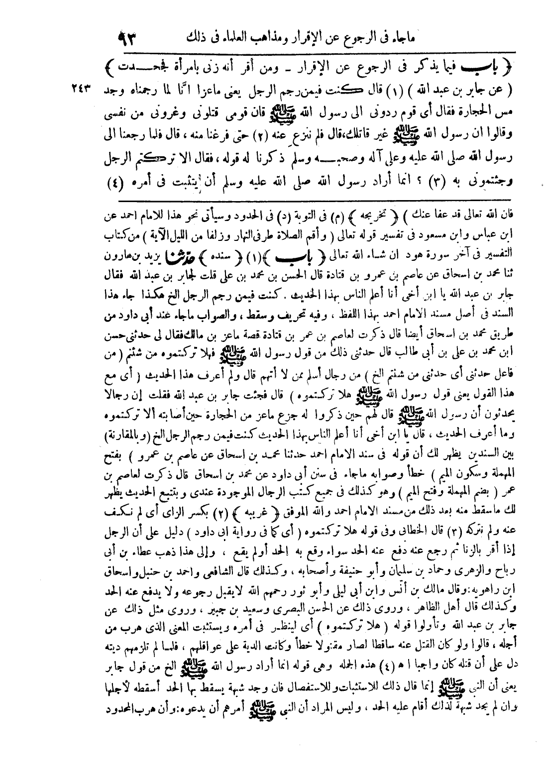 (باب فيما يذكر في الرجوع عن الإقرار - ومن أقر أنه زنى بامرأة فجحدت) (عن جابر بن عبد الله 01) (1) قال كنت فيمن رجم الرجل يعنى ماعزاً إنَّا لما رجمناه وجد مس الحجارة فقال أي قوم ردونى إلى رسول الله صلى الله عليه وسلم قان قومى قتلونى وغرونى من نفسى وقالوا إن رسول الله صلى الله عليه وسلم غير قاتلك، قال فم ننزع عنه (2) حتى فرغنا منه، قال فلما رجعنا إلى رسول الله صلى الله عليه وعلى آله وصحبه وسلم ذكرنا له قوله، فقال ألا تركتم الرجل وجئتمونى به (3)؟ إنما أراد رسول الله صلى الله عليه وسلم أن يثبت في أمره (4)