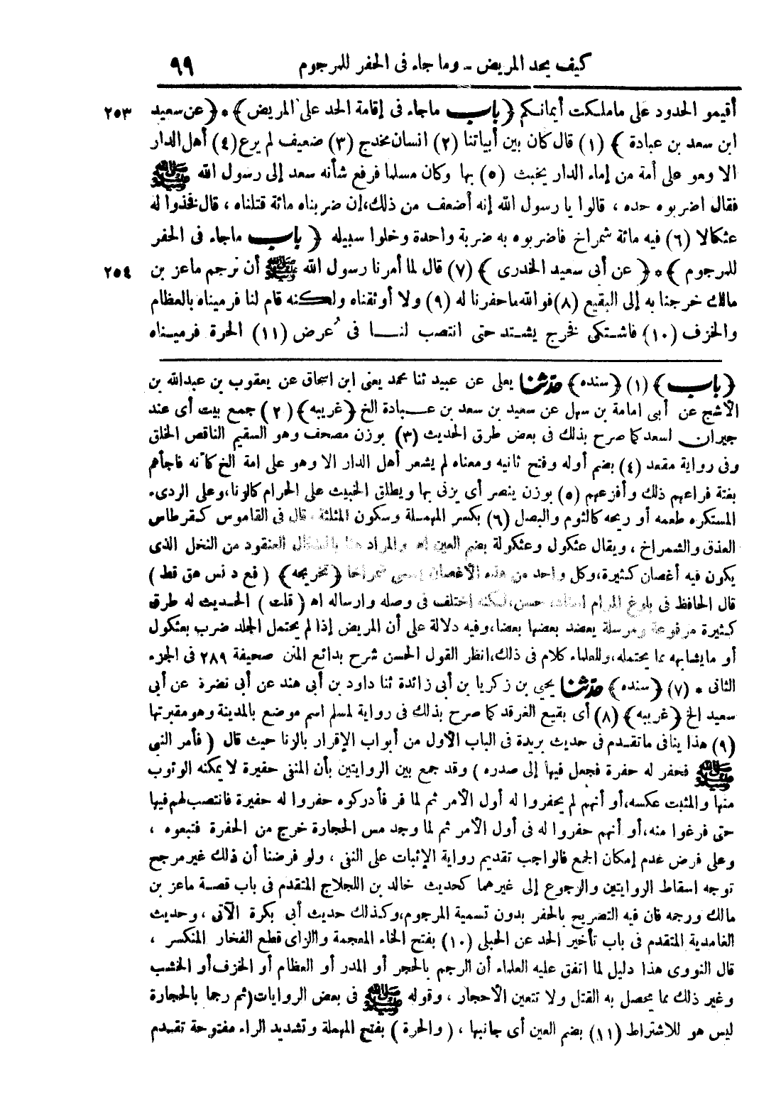 أقيموا الحدود على ما ملكت أيمانكم (باب ما جاء في إقامة الحد على المريض) * (عن سعيد ابن سعد بن عبادة) (1) قال كان بين أبياتنا (2) إنسان مخدج (3) ضعيف لم يرع (4) أهل الدار إلا وهو على أمة من إماء الدار يخبث (5) بها وكان مسلماً فرفع شأنه سعد إلى رسول الله صلى الله عليه وسلم فقال اضربوه حده، قالوا يا رسول الله إنه أضعف من ذلك، إن ضربناه مائة قتلناه، قال فخذوا له عثكالاً (6) فيه مائة شمراخ فاضربوه ضربة واحدة وخلوا سبيله (باب ما جاء في الحفر للمرجوم) * (عن أبى سعيد الخدرى) (7) قال لما أمرنا رسول الله صلى الله عليه وسلم أن نرجم ماعز بن مالك خرجنا به إلى البقيع (8) فوالله ما حفرنا له (9) ولا أوثقناه ولكنه قام لنا فرميناه بالعظام والخزف (10) فاشتكى فخرج يشتد حتى انتصب لنا في عرض (11) الحرة فرميناه