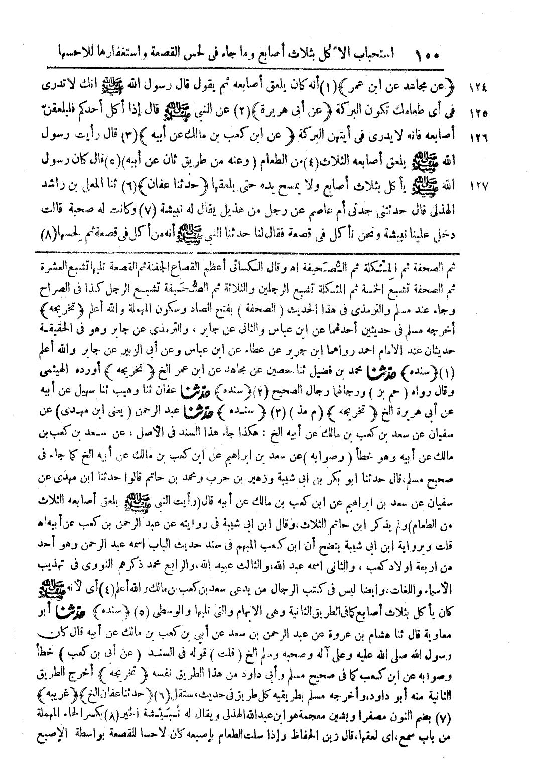 ثم الصحفة ثم المئكلة ثم الصحيفة اه وقال الكسانى اعظم القصاع الجفنة ثم القصعة تليها تشبع العشرة ثم الصحفة تشبع الخمسة ثم المئكلة تشبع الرجلين والثلاثة ثم الصحيفة تسبع الرجل كذا فى الصراح وجاء عند مسلم والترمذى فى هذا الحديث (الصحفة) ببفتح الصاد وسكون المهملة واللة اعلم (تخريجة) اخرجة مسلم فى حديثين احدهما عن ابن عباس والثانى عن جابر والترمذى عن جابر وهو فى الحقيقة حديثان عن الامام احمد رواهما ابن جرير عن عطاء عن ابن عباس وعن اب الزبير عن جابر واللة اعلم (1) (سندة) حدثنا محمد بن فضيل ثنا حصين عن مجاهد عن ابن عمر الخ (تخريجة) اوردة الهيثمى وقال رواه (حم بز) ورجالهما رجال الصحيح (2) (سندة) حدثنا عفان ثنا وهيب ثنا سهيل عن ابية عن ابى هريرة الخ (تخريجة) (م مذ) (3) (سندة) حدثنا عبد الرحمن (يعنى ابن مهدى) عن سفيان عن سعد بن كعب بن مالك عن ابية الخ: هكذا جاء هذا السند فى الاصل عن سعد بن كعب بن مالك عن ابية وهو خطأ (وصوابة) عن سعد بن ابراهيم عن ابن كعب بن مالك عن ابية الخ كما جاء فى صحيح مسلم قال حدثنا ابو بكر بن ابى شيبة وزهير بن حرب ومحمد بن حاتم قالوا حدثنا ابن مهدى عن سفيان عن سعد بن ابراهيم عن ابن كعب بن مالك عن ابية قال (رايت النبى صلى اللة علية وسلم يلعق اصابعة الثلاث من الطعام) ولم يذكر ابن حاتم الثلاث وقال ابن ابى شيبة فى روايتة عن عبد الرحمن بن كعب عن ابية اه قلت ويرواية ابن ابى شيبة يتضح ان ابن كعب المبهم فى سندة حديث الباب اسمة عبد الرحمن وهو احد من اربعة اولاد كعب والثانى اسمة عبد اللة والثالث عبيد الله والرابع محمد ذكرهم النووى فى تهذيب الاسماء واللغات وايضا ليس فى كتاب الرجال من يدعى سعد بن كعب بن مالك والله اعلم (4) اى انة صلى اللة علية وسلم كان يأكل بثلاث اصابع كما فى الطريق الثانية وهى الابهام والتى تليها والوسطى (5) (سندة) حدثنا ابو معاوية قال ثنا هشام بن عروة عن عبد الرحمن بن سعد عن ابى بن كعب بن مالك عن ابية قال كان رسول اللة صلى اللة علية وعلى الة وصحبة وسلم الخ (قلت) قولة فى السند (عن ابى بن كعب) خطأ وصوابة عن ابن كعب كما فى صحيح مسلم وابى داود من هذا الطريق نفسة (تخريجة) اخرج الطريق الثانية منة ابو داود واخرجة مسلم بطريقة كل طريق فى حديث مستقل (6) (حدثنا عفان الخ) (غريبة) (7) بضم النون مصغرا وبشين معجمة هو ابن عبد اللة الهذلى ويقال لة نبيئشة الخير (8) بكسر الحاء المهملة من باب سمع اى لعقها قال زين الحفاظ واذا سلت الطعام بأصبعة كان لاحسا للقصعة بواسطة الإصبع