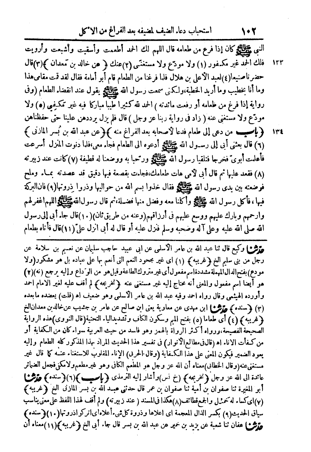 حدثنا وكيع قال ثنا عبد اللة بن عامر ثنا عبد اللة بن عامر الاسلمى عن ابى عبيد حاجب سليمان عن نعيم بن سلامة عن رجل من بنى سليم الخ (غريبة) (1) اى غير مجحود النعم التى انعم بها على عبادة بل هو مشكور (ولامودع) بفتح الدال المهملة مشددة اسم مفعول اى غير متروك الطاعة وقل هو من الوداع والية يرجع (نة) (2) هو ايضا اسم مفعول والمعنى انة محتاج الية غير مستغنى عنة (تخريجة) لم اقف علية لغير الامام احمد واوردة الهيثمى وقال رواه احمد وفية عبد اللة بن عامر الاسلمى وهو ضعيف اه (قلت) يعضدة ما بعدة (3) (سندة) حدثنا ابن مهدى عن معاوية يعنى ابن صالح عن عامربن جشيب عن خالد معدان الخ (غريبة) (4) اى طعاما (5) بفتح الميم وسكون الكاف وتشديد الياء التحتية (قال النووى) هذة الرواية الصحيحة الفصيحة ورواه اكثر الرواه بالهمز وهو فاسد من حيث العربية سواء كان من الكفاية او من كفأت الاناء اه (قال فى مطالع الانوار) فى تفسير هذا الحديث المراد بهذا المذكور كلة الطعام والية يعود الضمير فيكون المعنى على هذا الكفاية (وقال الحربى) الاناء المقلوب لللاستغناء عنة كما قال غير مستغنى عنة (وقال الخطابى) معناه ان اللة عز وجل هو المطعم الكافى وهو غير مطعم ولا مكفى فجعل الضمائر عائدة الى اللة عز وجل (تخريجة) (خ نس) واشار الية الترمذى (باب) (6) (سندة) حدثنا ابو المغيرة ثنا صفوان بن امية ثنا صفوان بن عمر قال خدثنى عبد اللة بن بسر المازنى الخ (غريبة) (7) اى كساء لة خمل والجمع قطائف (8) هكذا فى المسند (عند زبيرتة) ولم اقف لهذا اللفظ على معنى يناسب سياق الحديث (9) بكسر الذال المعجمة اى اعلاها وذروة كل شئ اعلاة اى اتركوا ذروتها (10) (سندة) حدثنا عفان ثنا شعبة عن يزيد بن خمير عن عبد اللة بن بسر قال جاء ابى الخ (غريبة) (11) معناه أن