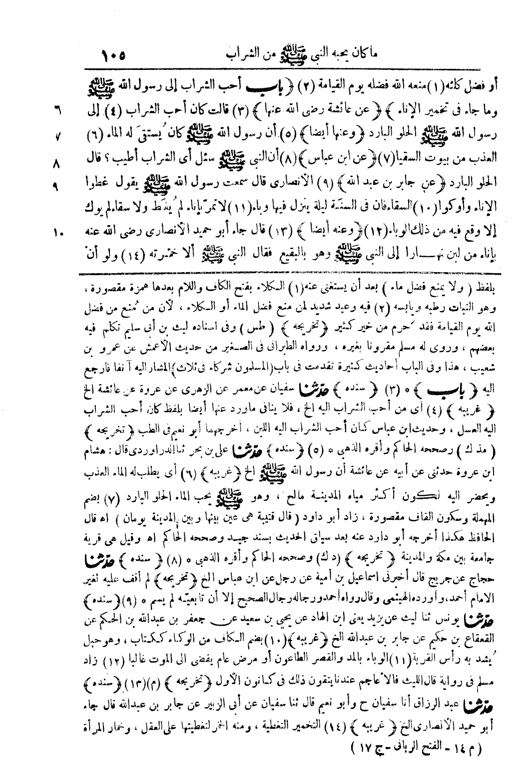 بلفظ (ولا يمنع فضل ماء) بعد ان يستغنى عنة (1) الكلاء بفتح الكاف واللام بعدها همزة مقصورة وهو النبات رطبةويابسة (2) فية وعيد شديد لمن منع فضل الماء او الكلاء لان من منع من فضل اللة يوم القيامة فقد حرم من خير كثتير (تخريجة) (طس) وفى اسنادة ليث بن ابى سليم تكلم فية بعضهم وروى لة مسلم مقرونا بغيرة ورواه الطبرانى فى الصغير من حديث الاعمش عن عمرو بن شعيب هذا وفى الباب احاديث كثيرة تقدمت فى باب (المسلمون شركاء فى ثلاث) المشار الية انفا فارجع الية (باب) * (3) (سندة) حدثنا سفيان عن معمر عن الزهرى عن عروة عن عائشة الخ (غريبة) (4) اى من احب الشراب الية الخ فلا ينافى ما ورد عنها ايضا بلفظ كان احب الشراب الية بالعسل وحديث ابن عباس كان احب الشراب الية باللبن اخرجهما ابو نعيم فى الطب (تخريجة) (مذ ك) وصححة الحاكم واقره الذهبى * (5) (سندة) حدثنا على بن بحر ثنا الدراوردى قال: هشام ابن عروة حدثنى عن ابية عن عائشة ان رسول اللة صلى اللة علية وسلم الخ (غريبة) (6) اى يطلب لة الماء العذب ويحضر الية لكون اكثر مياه المدينة مالح وهو صلى اللة علية وسلم يحب الماء الحلو البارد (7) بضم المهملة وسكون القاف مقصورة زاد ابو داود (قال قتيبة هى عين بينهما وبين المدينة يومان) اه قال الحافظ هكذا اخرجة ابو داود عنة بعد سياق الحديث بسند جيد وصححة الحاكم اه وقيل هى قرية جامعة بين مكة والمدينة (تخريجة) (دك) وصححة الحاكم واقرة الذهبى * (8) (سندة) حدثنا حجاج عن جريح قال اخبرنى اسماعيل بن امية عن رجل عن ابن عباس الخ (تخريجة) لم اقف علية نفير الامام احمد واوردة الهيثمى وقال رواه احمد ورجالة رجال الصحيح الا ان تابعية لم يسم * (9) (سندة) حدثنا يونس ثنا ليث عن يزيد يعنى ابن الهاد عن يحيى بن سعيد عن جعفر بن عبد اللة بن الحكم عن القعقاع بن حكيم عن جابر بن عبد اللة الخ (غريبة) (10) بضم الكاف من الوكاء ككتاب وهو حبل يشد بة راس القربة (11) الوباء بالمد والقصر الطاعون او مرض عام يفضى الى الموت غالبا (12) زاد مسلم فى رواية قال الليث فالاعاجم عندنا يتقون ذلك فى كانون الاول (تخريجة) (م) (13) سندة) حدثنا عبد الرزاق انا سفيان ح وابو نعيم قال ثنا سفيان عن ابى الزبير عن جابر بن عبد اللة قال جاء ابو حميد الانصارى الخ (غريبة) (14) التخمير التغطية ومنة الخمر لتغطيتها على العقل وخمار المرأة