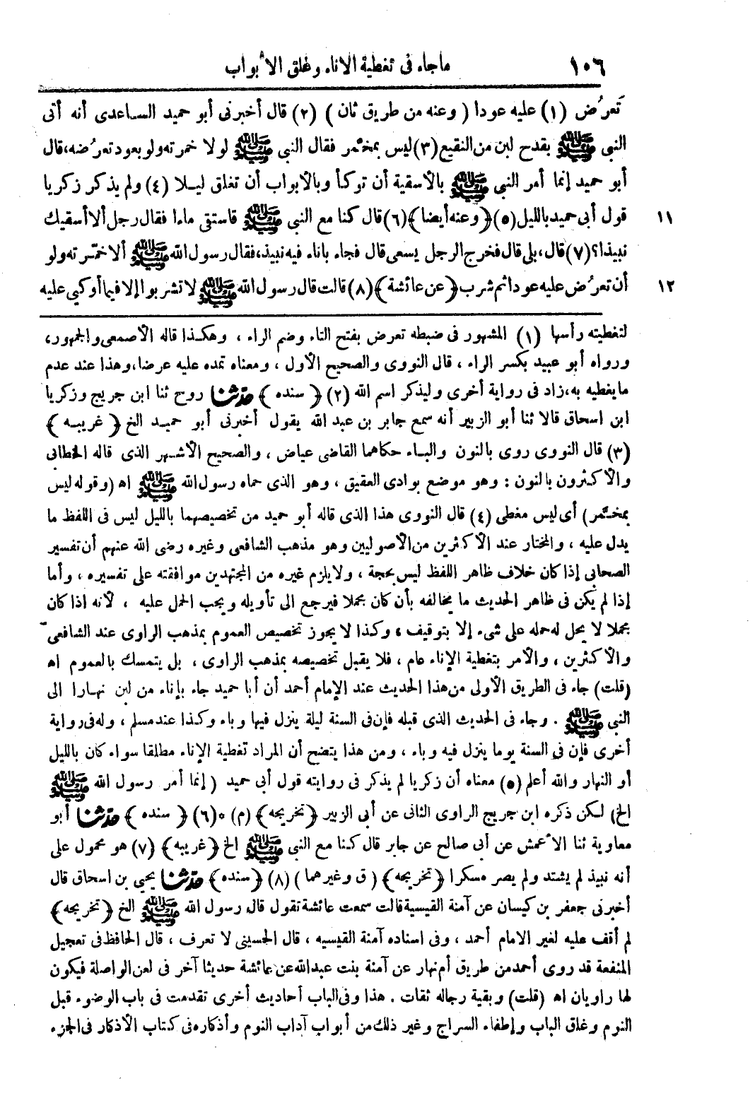 لتغطيته رأسها (1) المشهور فى ضبطة تعرض بفتح التاء وضم الراء وهكذا قالة الاصمعى والجمهور ورواه ابو عبيد بكسر الراء قال النووى والصحيح الاول ومعناه تمدة علية عرضا وهذا عند عدم ما يغطية بة زاد فى رواية اخرى وليذكر اسم اللة (2) (سندة) حدثنا روح ثنا ابن جريج وزكريا ابن اسحاق قالا ثنا ابو الزبير انة سمع جابر بن عبد اللة يقول اخبرنى ابو حميد الخ (غريبة) (3) قال النووى روى بالنون والباء حكامها القاضى عياض والصحيح الاشهر الذى قالة الخطابى والاكثرون بالنون: وهو موضع بوادى العتيق وهو حماه رسول اللة صلى اللة علية وسلم اه (وقولة ليس بمخمر) اى ليس بمغطى (4) قال النووى هذا الذى قالة ابو حميد من تخصيصها بالليل ليس فى اللفظ ما يدل علية والمختار عند الاكثرين من الاصوليين وهو مذهب الشافعى وغيرة رضى اللة عنهم ان تفسير الصحابى اذا كان خلاف ظاهر اللفظ ليس بحجة ولا يلزم غيرة من المجتهدين موافقتة على تفسيرة واما اذا لم يكن فى ظاهر الحديث ما يخالفة بان كان مجملا فيرجع الى تاويلة ويجب الحمل علية لانة اذا كان مجملا لا يحل لة حملة على شئ الا بتوقيف وكذا لا يجوز تخصيص العموم بمذهب الراوى عند الشافعى والاكثرين والامر بتغطية الاناء عام فلا يقبل تخصيصة بمذهب الراوى بل يتمسك بالعموم اه (قلت) جاء فى الطريق الاولى من هذا الحديث عند الامام احمد ان ابا حميد جاء بأناء من لبن نهارا الى النبى صلى اللة علية وسلم وجاء فى الحديث الذى قبلة فان فى السنة ليلة ينزل فية وباء وكذا عند مسلم ولة فى رواية اخرى فان فى السنة يوما ينزل فية وباء ومن هذا يتضح ان المراد تغطية الاناء مطلقا سواء كان بالليل او النهار والللة اعلم (5) معناه ان زكريا لم يذكر فى روايتة قول ابى حميد (انما امر رسول اللة صلى اللة علية وسلم الخ) لكن ذكره ابن جريح الراوى الثانى عن ابى الزبير (تخريجة) (م) * (6) (سندة) حدثنا ابو معاوية ثنا الاعمش عن ابى صالح عن جابر قال كنا مع النبى صلى اللة علية وسلم الخ (غريبة) (7) هو محمول على انة نبيذ لم يشتد ولم يصر مسكرا (تخريجة) (ق وغيرهما) (8) (سندة) حدثنا يحيى بن اسحاق قال اخبرنى جعفر بن كسيان عن امنة القيسية قالت عائشة تقول قال رسول اللة صلى اللة علية وسلم الخ (تخريجة) لم اقف علية لغير الامام احمد وفى اسنادة امنة القيسية قال الحسينى لا تعرف قال الحافظ فى تعجيل المنفعة قد روى احمد من طريق ام نهار عن امنة بنت عبد اللة عن عائشة حديثا اخر فى لعنة الواصلة فيكون لها روايان اه (قلت) وبقية رجالة ثقات هذا وفى باب احاديث اخرى تقدمت فى باب الوضوء قبل النوم وغلق الباب واطفاء السراج وغير ذلك من ابواب اداب النوم واذكارة في كتاب الأذكار في الجزء