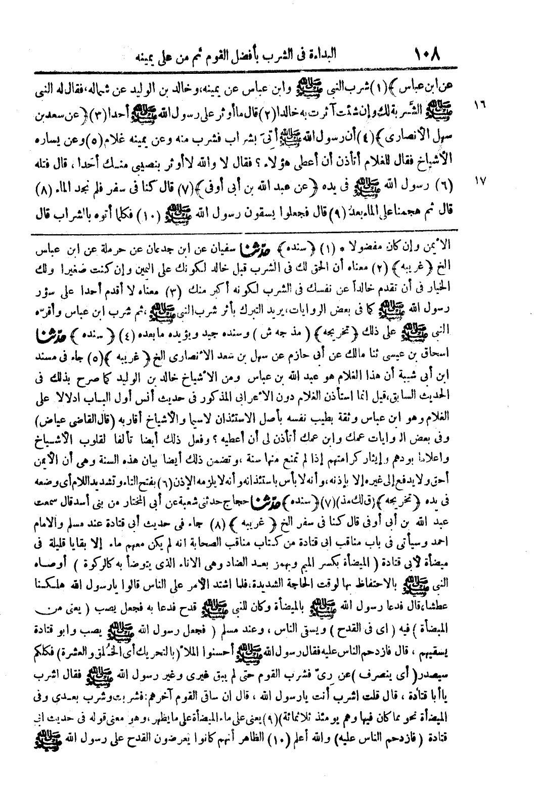 عن ابن عباس) (1) شرب النبى صلى الله عليه وسلم وابن عباس عن يمينه، وخالد بن الوليد عن شماله، فقال له النبى صلى الله عليه وسلم الشَّربة لك وإن شئت آثرت به خالدًا (2) قال ما أوثر على رسول الله صلى الله عليه وسلم أحدًا (3) (عن سعد بن سيل الأنصارى) (4) أن رسول الله صلى الله عليه وسلم أترى بشراب منه وعن يمينه غلام (5) وعن يساره الأشياخ فقال الغلام أتأذن أن أعطى هؤلاء؟ فقال لا والله لا أوثر بنصيبى منك أحدًا، قال فتله (6) رسول الله صلى الله عليه وسلم فى يده (عن عبد الله بن أبى أوفى) (7) قال كنا فى سفر فلم نجد الماء (8) قال ثم هجمنا على الماء بعد (9) قال فجعلوا يسقون رسول الله صلى الله عليه وسلم (10) فكلما أتوه بالشراب قال