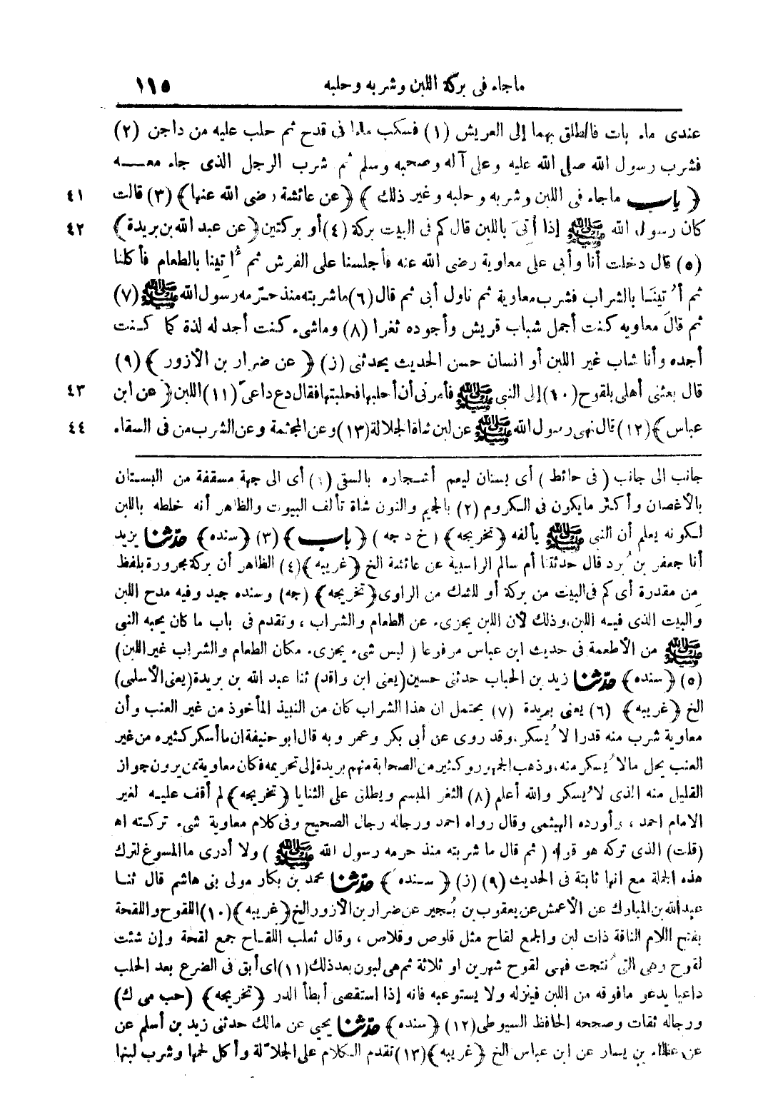 عندي ماء بات فالطلق بهما إلى العريش (1) فسكب ماءًا فى قدح ثم حلب عليه من داجن (2) فشرب رسول الله صلى الله عليه وعلى آله وصحبه وسلم ثم شرب الرجل الذى جاء معه (باب ما جاء فى اللبن وشربه وحلبه وغير ذلك) (عن عائشة رضى الله عنها) (3) قالت كان رسول الله صلى الله عليه وسلم إذا أتى باللبن قال كم فى البيت بركة (4) أو بركتين (عن عبد الله بن بريدة) (5) قال دخلت أنا وأبى على معاوية رضي الله عنه فأجلسنا على الفرش ثم أتينا بالطعام فأكلنا ثم أُتينا بالشراب فشرب معاوية ثم ناول أبى ثم قال (6) ما شربته منذ حرّمه رسول الله صلى الله عليه وسلم (7) ثم قال معاوية كنت أجمل شباب قريش وأجوده ثغرًا (8) وما شئ كنت أجد له لذة كما كنت أجده وأنا شاب غير اللبن أو إنسان حسن الحديث يحدثنى (ز) (عن ضرار بن الأزور) (9) قال بعثنى أهلى بلقوح (10) إلى النبى صلى الله عليه وسلم فأمرنى أن أحلبها فحلبتها فقال دع داعى (11) اللبن (عن ابن عباس) قال نهى رسول الله صلى الله عليه وسلم عن لبن شاة الجلالة (13) وعن المجثمة وعن الشرب في السقاء