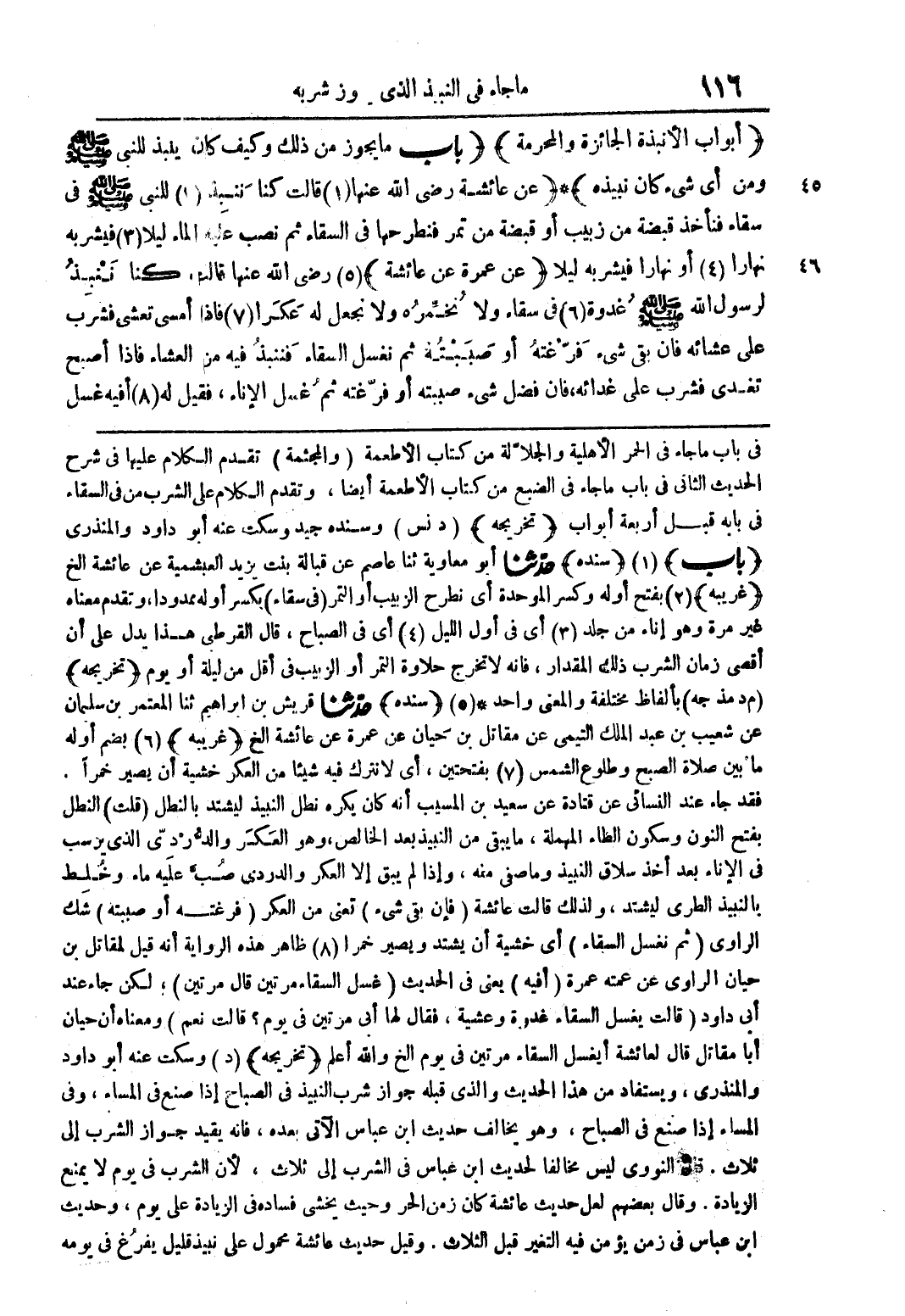 في باب ما جاء في الحمر الأهلية والجلالة من كتاب الأطعمة (والمجثمة) تقدم الكلام عليها في شرح الحديث الثانى فى باب ما جاء فى الضبع من كتاب الاطعمة ايضا وتقدم الكلام على الشرب من فى السقاء فى بابة قبل اربعة ابواب (تخريجة) (دنس) وسندة جيد وسكت عنة ابو داود والمنذرى (باب) (1) (سندة) حدثنا ابو معاوية ثنا عاصم عن قبالة بنت يزيد العبشمية عن عائشة الخ (غريبة) (2) بفتح اولة وكسر الموحدة اى نطرح الزبيب او التمر (فى سقاء) بكسر اولة ممدودا وتقدم معناه غير مرة وهو اناء من جلد (3) اى فى اول الليل (4) اى فى الصباح قال القرطى هذا يدل على ان اقصى زمان الشرب ذلك المقدار فانة لا تخرج حلاوة التمر او الزبيب فى اقل من ليلة او يوم (تخريجة) (م د مذ جة) بألفاظ مختلفة والمعنى واحد * (5) (سندة) حدثنا قريش بن ابراهيم ثنا المعتمر بن سليمان عن شعيب بن عبد الملك التيمى عن مقاتل بن حيان عن عمرة عن عائشة الخ (غريبة) (6) بضم اولة ما بين صلاة الصبح وطلوع الشمس (7) بفتحتين اى لا تترك فية شيئا من العكر شية ان يصير خمرا فقد جاء عند النسائى عن قتادة عن سعيد بن المسيب انة كان يكرة نطل النبيذ ليشتد بالنطل (قلت) النطل بفتح النون وسكون الظاء المهملة ما يبقى من النبيذ بعد الخالص وهو العكر والد ردى الذى يرسب فى الاناء بعد سلاق النبيذ وما صفى منة واذا لم يبق الاالعكر والدردى صب علية ماء وخلط بالنبيذ الطرى ليشتد ولذلك قالت عائشة (فان بقى شئ) تعنى من العكر (فرغتة او صببتة) شك الراوى (ثم نغسل السقاء) اى شية ان يشتد ويصير مرا (8) ظاهر هذة الرواية انة قيل لمقاتل بن حيان الراوى عن عمتة عمرة (افية) يعنى فى الحديث (غسل السقاء مرتين قال مرتين) لكن جاء عند ابى داود (قالت يغسل السقاء غدوة وعشية) فقال لها ابى مرتين فى يوم؟ قالت نعم) ومعناه ان حيان ابا مقاتل قال لعائشة ايغسل السقاء مرتين فى يوم الخ واللة اعلم (تخريجة) (د) وسكت عنة ابو داود والمنذرى ويستفاد من هذا الحديث والذى قبلة جواز شرب النبيذ فى الصباح اذا صنع فى المساء وفى المساء اذا صنع فى الصباح وهو يالف حديث ابن عباس الاتى بعدة فانة يقيد جواز الشرب الى ثلاث النووى ليس مخالفا لحديث ابن عباس الى ثلاث لان الشرب فى يوم لا يمنع الزيادة وقال على يوم وحديث ابن عباس من زمان ي} من فية التغير قبل الثلاث وقيل حديث عائشة محمول على نبيذ قليل يفرغ في يومه