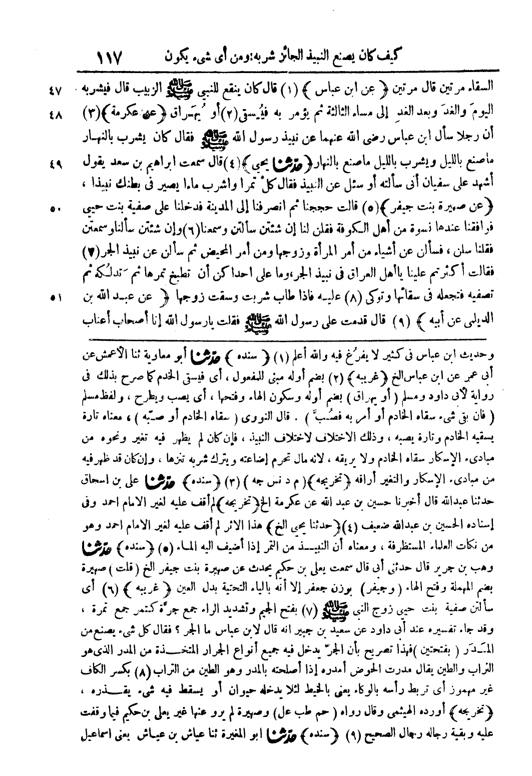 وحديث ابن عباس فى كثيرلا يفرغ فية واللة اعلم (1) (سندة) حدثنا ابو معاوية ثنا الاعمش عن ابى عمر عن ابن عباس الخ (غريبة) (2) بضم اولة مبنى للمفعول اى فيسقى الدم كما صرح بذلك فى رواية لابى داود ومسلم (او يهرق) بضم اولة وسكون الهاء وفتحها اى يصب ويطرح ولفظ مسلم (فان بقى شئ سقاه الادم او امر بة فصب) قال النووى (سقاه الخادم او صبة) معناه تارة بسقية الخادم وتارة يصبة وذلك الاختلاف لاختلاف النبيذ فان كان لم يظهر فية تغير ونحوة من مبادئ الاسكار سقاه الادم ولا يريقة لانة مال يحرم اضاعتة ويترك شربة تزها وان كان قد ظهر فية من مبادئ الاسكار والتغير ارافة (تخريجة) (م د نس جة) (3) (سندة) حدثنا على بن اسحاق حدثنا عبد اللة قال اخبرنا حسين بن عبد اللة بن عكرمة الخ (تخريجة) (م د نس جة) (3) (سندة) حدثنا على بن اسحاق حدثنا عبد اللة قال اخبرنا حسين بن عبد اللة عن عكرمة الخ (تخريجة) لم اقف علية لغير الامام احمد وفى اسنادة الحسين بن عبد اللة ضعيف (4) (حدثنا يحيى الخ) هذا الاثر لم اقف علية لغير الامام احمد وهو من نكات العلماء المستظرفة ومعناه ان النبيذ من التمر اذا اضيف الية الماء (5) (سندة) حدثنا وهب بن جرير قال حدثنى ابى قال سمعت يعلى بن حكم يحدث عن صهيرة بضم المهملة الهاء (وجيفر) بوزن جعفر الا انى بالياء التحتية بدل العين (غريبة) (ك) اى سأتين صفية بنت حيى زوج النبى صلى اللة علية وسلم (7) بفتح الجيم وتشديد الراء جمع جرة كتمر جع ثمرة وقد جاء تفسيرة عند ابى داود عن سعيد بن جبير انة قال لابن عباس ما الجر؟ فقال كل شئ يصنع من المدر (بفتحتين) فهذا تصريح بان الجر يدخل فية جميع انواع الجرار النتذة من المدر الذى هو التراب والطين يقال مدرت الحوض امدرة اذا اصلحتة بالمدر وهو الطين من التراب (8) بكسر الكاف غير مهموز اى تربط راسة بالوكاء يعنى بالليط لئلا يدخلة حيوان او يسقط فية شئ يقذرة (تخريجة) اوردة الهيثمى وقال رواه (حم طب عل) وصهيرة لم يرو عنها غير يعلى بن حكيم فيما وقفت علية وبقية رجالة الصحيح (9) (سندة) حدثنا ابو المغيرة ثنا عياش بن عياش يعني إسماعيل