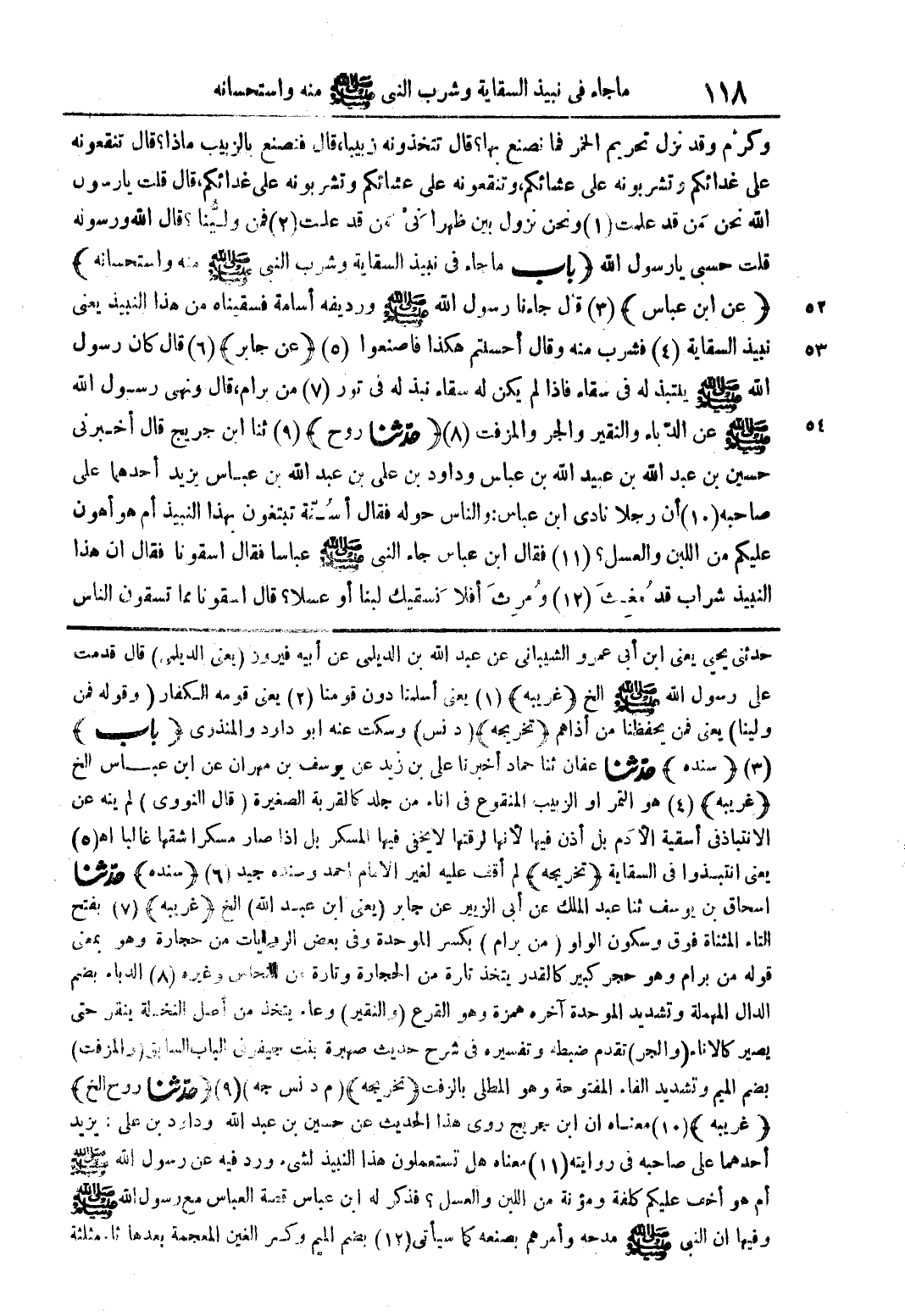 حدثني يحيى يعنى ابن ابى عمرو الشيبانى عن عبد اللة بن الديلى عن ابية فيروز (يعنى الديلى) قال قدمت على رسول اللة صلى اللة علية وسلم ال (غريبة) (1 يعنى اسلنا دون قومنا (2) يعنى قومة الكفار (وقولة فمن ولينا) يعنى فمن يحفظنا ما اذاهم (تخريجة) (د نس) وسكت عنة ابو داود والمنذرى (باب) (3) (سندة) حدثنا عفان ثنا حماد اخبرنا على بن زيد عن يوسف بن مهران عن ابن عباس الخ (غريبة) (4) هو الثمر او الزبيب المنقوع فى اناء من جلد كالقربة الصغيرة (قال النووى) لم ينة عن الانتباذ فى اسقية الادم بل اذن فيها لانها لرقتها لا يخفى فيها المسكر بل اذا صار مسكرا شقها غالبا اه (5) يعنى انتبذوا فى السقاية (تخريجة) لم اقف علية لغير الامام احمد وسندة جيد (6) (سندة) حدثنا اسحاق بن يوسف ثنا عبد الملك عن ابى الزبير عن جابر (يعنى ابن عبد اللة) الخ (غريبة) (7) بفتح التاء المثناه فوق وسكون الواو (من برام) بكسر الموحدة وفى بعض الروايات من حجارة وهو معنى قولة من برام وهو حجر كبير كالقدر يتخذ تارة من الحجارة وتارة من النحاس وغيرة (8) الدباء بضم الدال المهملة وتشديد الموحدة اخرة همزة وهو القرع (والنقير) وعاء يتخذ من اصل النخلة ينقر حتى يصير كالاناء (والجر) تقدم ضبطة وتفسيرة فى شرح حديث صهبرة بنت جيفر فى الباب السابق (والمزفت) بضم الميم وتشديد الفاء المفتوحة وهو المطلى بالزفت (تخريجة) (م د نس جة) (9) (حدثنا روح الخ) (غريبة) (10) معناه ان ابن جريج روى هذا الحديث عن حسين بن عبد اللة وداود بن على: يزيد احدهما على صاحبة فى روايتة (11) معناه هل تستمعون هذا النبيذ لشئ ورد فية رسول اللة صلى اللة علية وسلم ام هو اخف عليكم كلفة مؤمنة من اللبن والعسل؟ فذكر لة ابن عباس قصة العباس مع رسول اللة صلى اللة علية وسلم وفيها ان النبى صلى اللة علية وسلم مدحة وامرهم بصنعه كما سياتى (12) بضم الميم وكسر الغين المعجمة بعدها ثاء مثلثة