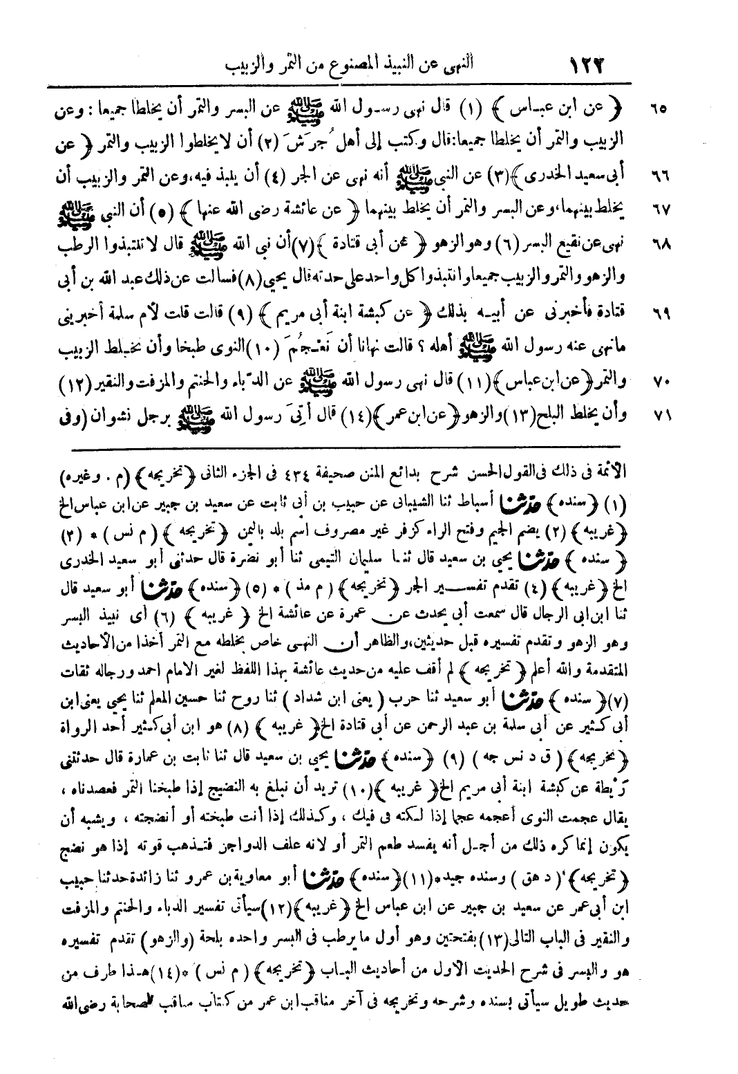 الأئمة في ذلك فى القول الحسن شرح بدائع المنن صحيفة 434 فى الجزء الثانى (تخريجة) (م. وغيرة) (1) (سندة) حدثنا اسباط ثنا الشيبانى عن حبيب بن ابى ثابت عن سعيد بن جبير عن ابن عباس الخ (غريبة) (2) بضم الجيم وفتح الراء كزفر غير مصرف اسم بلد باليمن (تخريجة) (م نس) * (2) (سندة) حدثنا يحيى بن سعيد قال ثنا سليمان التيمى ثنا ابو نضرة قال حدثنى ابو سعيد الخدرى الخ (غريبة) (4) تقم تفسير الجر (تخريجة) (م مذ) * (سندة) حدثنا ابو سعيد قال ثنا ابن ابى الرجال قال سمعت ابى يحدث عن عمرة عن عائشة الخ (غريبة) (6) اى نبيذ البسر وهو الزهو وتقدم تفسيرة قبل حديثين والظاهر ان النهى خاص بخلطة مع التمراخذا من الاحاديث النتقدمة واللة اعلم (تخريجة) لم اقف علية من حديث عائشة بهذا اللفظ لغير الامام احمد ورجالة ثقات (7) (سندة) حدثنا ابو سعيد ثنا حرب (يعنى ابن شداد) ثنا روح ثنا حسين المعلم ثنا يحيى يعنى ابن ابى كثير عن ابن سلمة بن عبد الرحمن عنن ابى قتادة الخ (غريبة) (8) هو ابن ابى كثير احد الرواه (تخريجة) (ق د نس جة) (9) (سندة) حدثنا يحيى بن سعيد قال ثنا ثابت بن عمارة قال حدثنى ريطة عن كبشة ابنة ابى مريم الخ (غريبة) (10) تريد ان نبلغ بة النضيج اذا طبخنا التمر فعصدناه يقال عجمت النوى اعجمة عجما اذا لكتة فى فيك وكذلك اذا انت طبختة او انضجتة ويشبة ان يكون انما كرة ذلك من اجل انة يفسد طعم التمر او لانة علف الدواجن فتذهب قوتة اذا هو نضج (تخريجة) (د هق) وسندة جيد * (11) (سندة) حدثنا ابو معاوية بن عمرو ثنا زائدة حدثنا حبيب ابن ابى عمر عن سعيد بن جبير عن ابن عباس الخ (غريبة) (12) سياتى تفسير الدباء والختم والمزفت والنقير فى الباب التالى (13) بفتحتين وهو اول ما يرطب فى البسر وحدة بلحة (والزهو) تقدم تفسيرة هو والبسر فى شرح الحديث الاول من احاديث الباب (تخريجة) (م نس) * (14) هذا طرف من حديث طويل سيأتى بسندة وشرحة وتخريجة فى اخر مناقب ابن عمر من كتاب صاقب الصحابة رضي الله