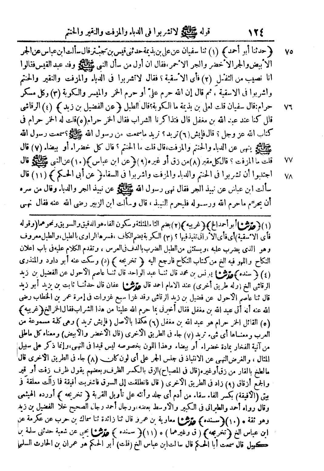 (1) (حدثنا أبو أحمد الخ) (غريبة) (2) بضم الثاء المثلثة وسكون الفاء هو الدقيق والسويق ونحوهما (وقولة فأى الاسقية) اى فأى الارانى تنبذفيها؟ (3) الكربة بضم الكاف فسرها الراوى بالطبل والطبل معروف وهو الذى يضرب علية ويستثنى من الطبل الضرب بالدوف فى العرس وتقدم الكلام علية فى باب اعلان المكاح واللهو فية الخ من كتاب النكاح فارجع الية (تخريجة) (د) وسكت عنة ابو داود والمنذرى (4) (سندة) حدثنا يونس بن محمد قال ثنا عبد الواحد قال ثنا عاصم الاحوال عن الفضيل بن زيد الرقاشى الخ (ولة طريق اخرى) عند الامام احمد قال حدثنا عفان قال حدثنا ثابت بن يزيد ابو زيد قال ثنا عاصم الاحوال عن فضيل بن زيد الرقاشى وقد غزا سبع غزوات فى امرة عمر بن الطاب رضى اللة عنة انة اتى عبد اللة بن مغفل فقال ابرنى بما حرم اللة علينا من هذا الشراب فقال الخمر الخ (غريبة) (5) القائل المر حرام هو عبد اللة بن مغفل (6) بالاصل (فايش تريد) وهى كلمة مسموعة من العرب معناها اى شئ تريد (7) جاء فى الطريق الارى (قال الاخضر والابيض) ومعناه كل ما طلى من انية الفخار بمادة خضراء او بيضاء وهذا اللون بخصوصة ليس فيذا فى النهى وانما ذكر على سبيل المثال والغرض النهى عن الانتباذ فة جنس الجر على اى لون كان (8) جاء فى الطريق الارى قال ما لطخ بالقار من زق او غيرة (قال فى المصباح) الزق بالكسر الظرف وبعضهم يقول ظرف زفت او قير والجمع ازقاق (9) زاد فى الطرق الاخرى (قال فانطلقت الى السوق فاشتريت افيقة فما زالت معلقة فى بيتى (الافقية) بكسر الفاء سقاء من ادم اى جلد وانتة على تاويل القرية (تخريجة) اوردة الهيثمى وقال رواه احمد والطبرانى فى الكبير والاوسط بعضة ورجال احمد رجال الصحيح لا الفضيل بن زيد وهو ثقة * (10) (سندة) حدثنا معاوية بن عمرو قال ثنا زائدة ثنا سماك بن حرب عن عكرمة عن ابن عباس الخ (تخريجة) (ق وغيرهما) * (11) (سندة) حدثنا يحيى عن شعبة حدثنى سلمة بن كهيل قال سمعت ابا الحكم قال سالت ابن عباس الخ (قلت) ابو الحكم هو عمران بن الحارث السلمي
