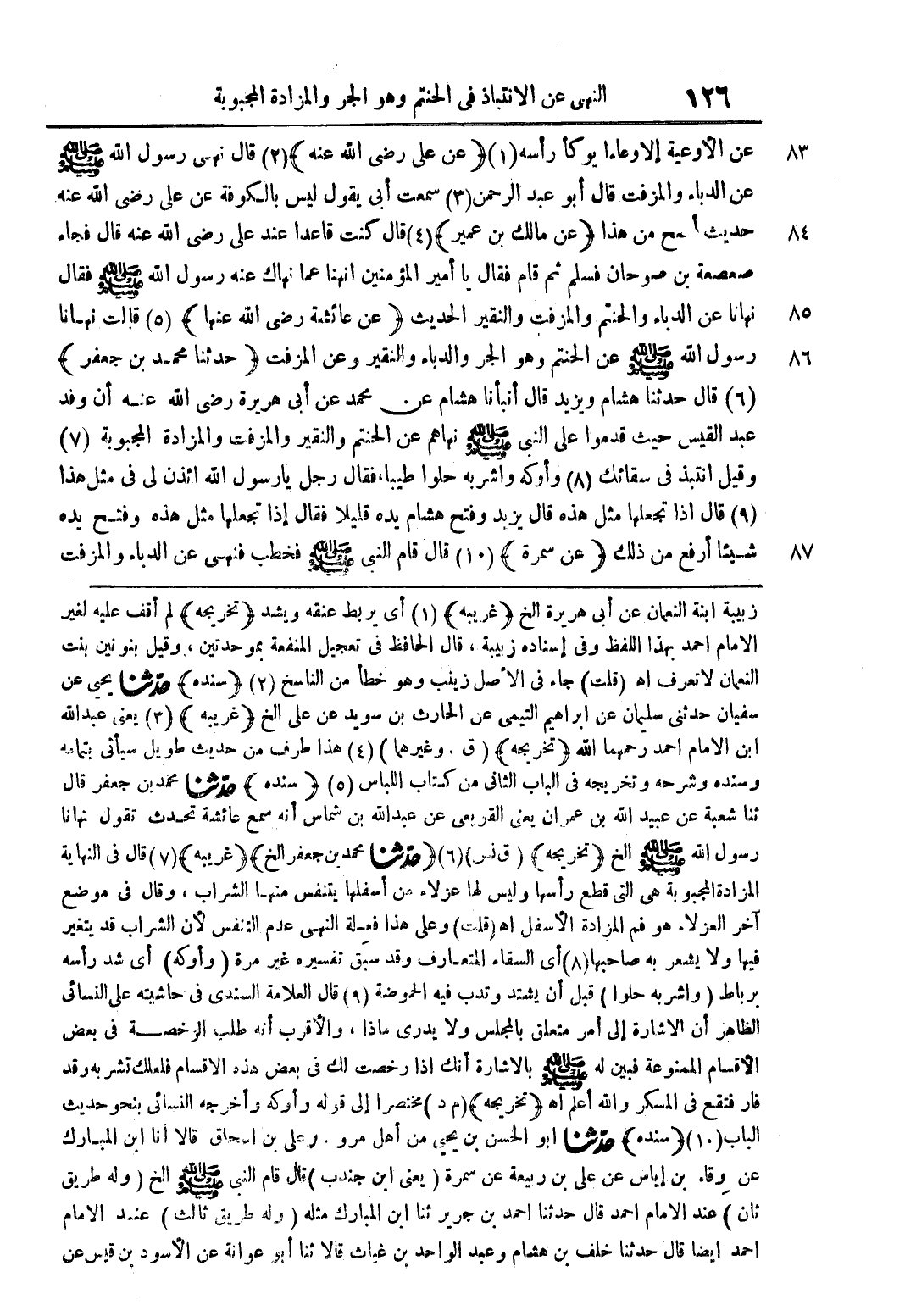 عن الأوعية إلا وعاءًا يوكأ رأسه (1) (عن علي رضي الله عنه) (2) قال نهى رسول الله صلى الله عليه وسلم عن الدباء والمزفت قال أبو عبد الرحمن (3) سمعت أبي يقول ليس بالكوفة عن علي رضي الله عنه حديث أصح من هذا (عن مالك بن عمير) (4) قال كنت قاعدا عند علي رضي الله عنه قال فجاء صعصعة بن صوحان فسلم ثم قام فقال يا أمير المؤمنين انهنا عما نهاك عنه رسول الله صلى الله عليه وسلم فقال نهانا عن الدباء والحنتم والمزفت والنقير الحديث (عن عائشة رضي الله عنها) (5) قال نهانا رسول الله صلى الله عليه وسلم عن الحنتم وهو الجر والدباء والنقير وعن المزفت (حدثنا محمد بن جعفر) (6) قال حدثنا هشام ويزيد قال أنبأنا هشام عن محمد عن أبي هريرة رضي الله عنه أن وفد عبد القيس حيث قدموا على النبي صلى الله عليه وسلم نهاهم عن الحنتم والنقير والمزفت والمزادة المجبوبة (7) وقيل انتبذ في سقائك (7) وأوكه واشربه حلو طيباً، فقال رجل يا رسول الله ائذن لي في مثل هذا (9) قال إذا تجعلها مثل هذه قال يزيد وفتح هشام يده قليلاً فقال إذا تجعلها مثل هذه وفتح يده شيئًا أرفع من ذلك (عن سمرة) (10) قال قام النبي صلى الله عليه وسلم فخطب فنهى عن الدباء والمزفت