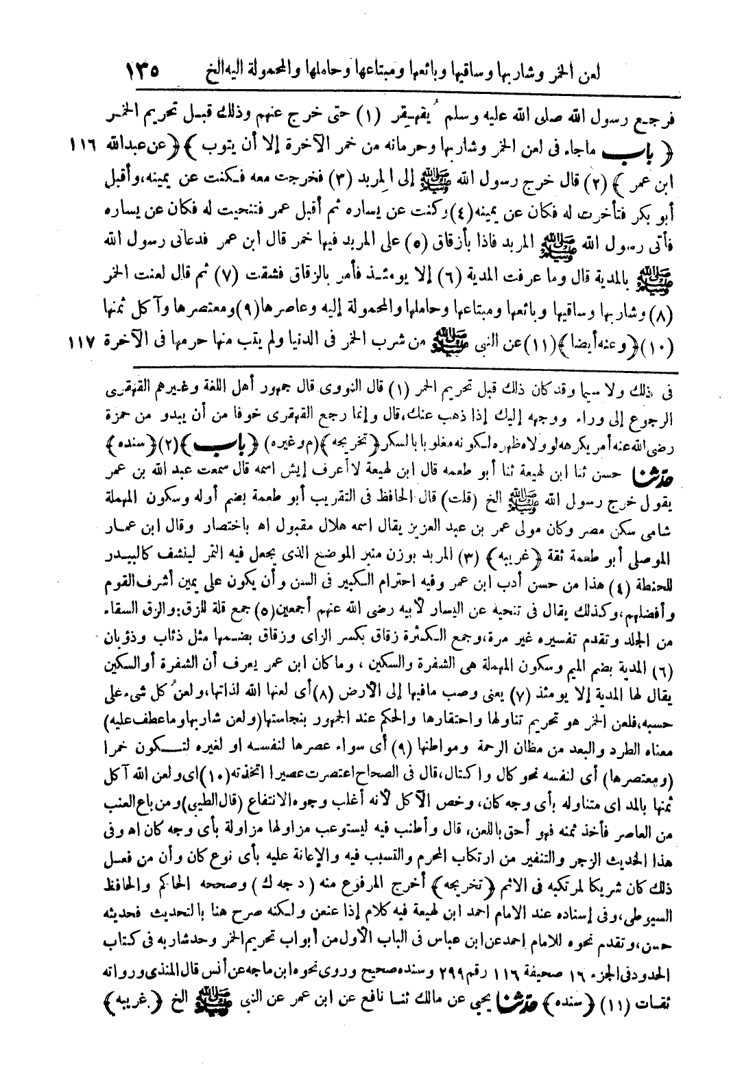 في ذلك ولا سيما وقد كان هذا قبل تحريم الخمر (1) قال النووى قال الجمهور اهل اللغة وغيرهم القهقرى الرجوع الى وراء ووجهة اليك اذا ذهب عنك قال وانما رجع القهقرى وفا من ان يبدو من حمزة رضى اللة عنة امر يكرهة لو ولاة ظهرة لكونة مغلوبا بالسكر (تخريجة) (م وغيرة) (باب) (2) سندة حدثناحسن ثنا ابن لهيعة لا اعرف ايش اسمة قال سمعت عبد اللة بن عمر يقول خرج رسول اللة صلى اللة علية وسلم الخ (قلت) قال الحافظ فى التقريب ابو طعمة بضم اولة وسكون المهملة شامى سكن مصر وكان مولى عمر بن عبد العزيز يقال اسمة هلال مقبول اه باتصار وقال ابن عمار الموصلى ابو طعمة ثقة (غريبة) (3) المربد بوزن منبر الموضع الذى يجعل فية التمر لينشف كالبيدر للحنطة (4) هذا من حسن ادب ابن عمر وفية احترام الكبير فى السن وان يكون على يمين اشرف القوم وافضلهم وكذلك يقال فى تنحية عن اليسار لابية رضى اللة عنهم اجمعين (5) جمع قلة للزوق: والزق السقاء من الجلد وتقدم تفسيرة غير مرة وجمع الكثرة زقاق بكسر الزاى وزقاق بضمها مثل ذئاب وذوبان (6) المدية بضم الميم وسكون المهملة هى شفرة والسكين وما كان ابن عمر يعرف ان الشفره او السكين يقال لها المدية الايومئذ (7) يعنى وصب ما فيها الى الارض (8) اى لعنها اللة لذاتها ولعن كل شئ على حسبة فلعن الخمر هو تحريم تناولها واحتقارها والحكم عند الجمهور بنجاستها (ولعن شاربها وما عطف علية) معناه الطرد والبعد من مظان الرحمة ومواطنها (9) اى سواء عصرها لنفسة او لغيرة لتكون مرا (ومعتصرا) اى لنفسة نحو كال واكتال قال فى الصحاح اعتصرت عصيرا اتخذتة (10) اى ولعن اللة اكل ثمنها بالمد اى متناولة باى وجة كان وخص الاكل لانة اغلب وجوة الانتفاع (قال الطيى) ومن باع العنب من العاصر فاذ ثمنة فهو احق باللعن قال واطنب فية ليستوعب مزاولها زوالة باى وجة كان اه وفى هذا الحديث الزجر والتنفير من ارتكاب المحرم والنسبب فية والاعانة علية باى نوع كان وان من فعل ذلك كان شريكا لمرتكبة فى الاثم (تخريجة) اخرج المرفوع منة (د جة ك) وصححة الحاكم والحافظ السيوطى وفى اسنادة عند الامام احمد ابن لهيعة فى كلام اذا عنعن ولكنة صرح هنا بالحديث فحديثة حسن وتقدم نحوة للامام احمد عن ابن عباس فى الباب الاول تحريم الخمر وحد شاربة فى كتاب الحدود فى الجزء 16 صحيفة 116 رقم 299 وسندة صحيح وروى نحوة ابن ماجة عن انس قال المنذرى ورواتة ثقات (11) (سندة) حدثنا يحيى عن مالك ثنا نا فع عن ابن عمر عن النبى صلى اللة علية وسلم الخ (غريبه)