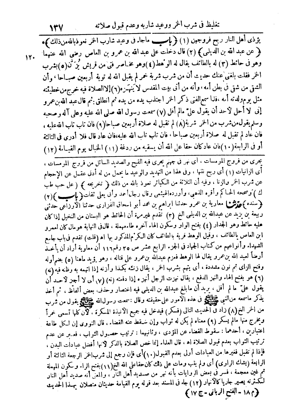 يؤذي أهل النار ريح فروجهن (1) (باب ما جاء في وعيد شارب الخمر نعوذ بالله من ذلك)، (عن عبد الله بن الديلي) (2) قال دخلت على عبد الله بن عمرو بن العاص رضي الله عنهما وهو في حائط (3) له بالطائف يقال له والوهط (4) وهو مخاصر فتى من قريش يزن (5) بشرب الخمر فقلت بلغني عنك حديث أن من شرب شربة خمر لم يقبل الله له توبة أربعين صباحاً، وأن الشقي من شقي في بطن أمه، وأنه من أتى بيت المقدس لا ينهزه (6) إلا الصلاة فيه خرج من خطيئته مثل يوم ولدته أمه، فلما سمع الفتح ذكر الخمر اجتذب يده من يده ثم انطلق: ثم قال عبد الله بن عمرو إني لا أحل لأحد أن يقول على ما لم أقل (7) سمعت رسول الله صلى الله عليه وسلم وعلى آله وصحبه وسلم يقول من شرب من الخمر شربة (8) لم تقبل له صلاة أربعين صباحا (9) فإن تابا تاب الله عليه، فإن عادل لم تقبل له صلاة أربعين صباحا، فان تاب تاب الله عليه، فإن عاد قال فلا أدري في الثالثة أو في الرابعة (10) فإن عاد كان حقا على الله أن يسقيه من ردغة (11) الخبال يوم القيامة (12)