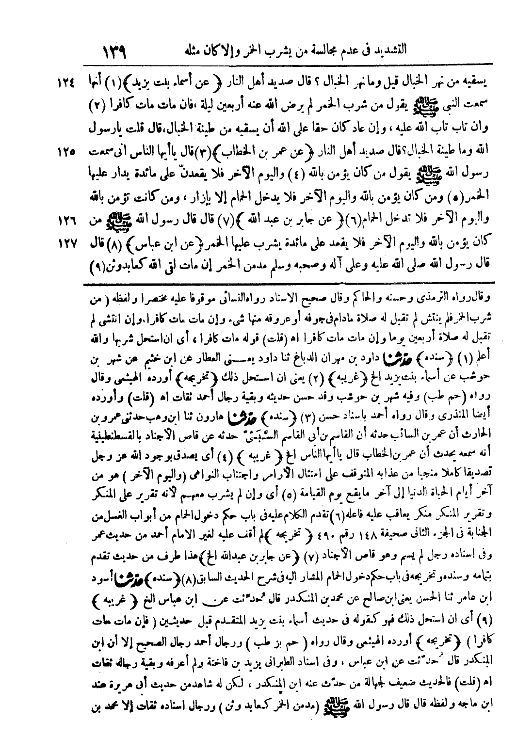 وقال رواه الترمذي وحسنة الحاكم وقال صحيح الاسناد رواه النسائى موقوفا علية متصرا ولفظة (من شرب الخمر فلم ينتش لم تقبل لة صلاه ما دام فى جوفة او عروقة منها شئ وان مات مات كافرا وان انتشى لم تقبل لة صلاة اربعين يوما وان مات مات كافرا اه (قلت) قولة مات كافرا اى ان استحل شربها واللة اعلم (1) (سندة) حدثنا داود بن مهران الباغ ثنا داود يعنى العطار عن ابن خثم عن شهر بن حوشب عن اسماء بن يزيد الخ (غريبة) (2) يعنى ان استتحل ذلك (تخريجة) اوردة الهيثمى وقال رواه (حم طب) وفية شهر بن حوشب وقد حسن حديثة وبقية رجال احمد ثقات اه (قلت) واوردة ايضا المنذرى وقال رواه احمد باسناد حسن (3) (سندة) حدثنا هارون ثنا ابن وهب جدثنى عمرو بن الحارث ان عمرو بن السائب حدثة ان القاسم بن ابى القاسم السبئى حدثة عن قاص الاجناد بالقسطنطينية انة سمع يحدث ان عمر بن الطاب قال يا ايها الناس الخ (غريبة) (4) اى يصدق بوجود اللة عز وجل تصديقا كاملا منجيا من عذابة المتوقف على امتثال الاوامر واجتناب النواهى (واليوم الار) هو من اخر ايام الحياه الدنيا الى اخر ما يقع يوم القيامة (5 اى وان لم يشرب معهم لانة تقرير على المنكر وتقرير المنكر منكر يعاقب علية فاعلة (6) تقدم الكلام علية فى باب حكم دول الحمام من ابواب الغسل من الجنابة فى الجزء التانى صحيفة 148 رقم 490 (تخريجة) لم اقف علية لغير الامام من حديث عمر وفى اسنادة رجل لم يسم وهو قاص الاجناد (7) (عن جابر بن عبد اللة الخ) هذا طرف من حديث تقدم بتمامة وسندة وتخريجة فى باب حكم دخول الحمام المشار الية فى شرح الحديث السابق (8) (سندة) حدثنا اسود ابن عامر ثنا الحسن يعنى ابن صالح عن محمد بن المنكدر قال حدثت عن ابن عباس الخ (غريبة) (9) اى ان استحل ذلك فهو كقولة فى حديث اسماء بنت يزيد المتقدم قبل حديثين (فان مات مات كافرا) قال حدثت عن ابن عباس وفى اسنادة الطبرانى يزيد بن فاختة ولم اعرفة وبقية رجالة ثقات اه (قلت) فالحديث ضعيف لجهالة من حدث عنة ابن المنكدر لكن لة شاهدمن حديث ابى هريرة عند ابن ماجة ولفظة قال قال رسول اللة صلى اللة علية وسلم (مدمن الخمر كعابد وثن) ورجال اسنادة ثقات إلا محمد بن