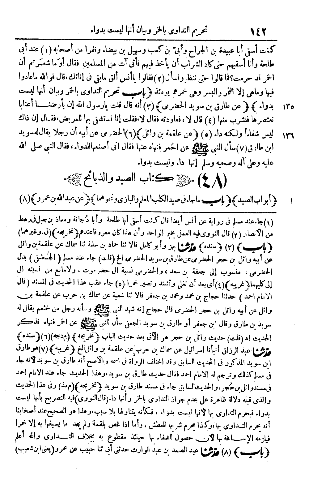 (1) جاء عند مسلم فى رواية عن انس ايضا قال كنت اسقى ابا طلحة وابا دجابة ومعاذ بن جبل فى رهط من الانصار (2) قال النووى فية العمل بخير الواحد وان هذا كان معروفا عندهم (تخريجة) (ق. وغيرهم) (باب) (3) (سندة) حدثنا بهز وابو كامل قالا ثنا حماد بن سلمة ثنا سماك عن علقمة بن وائل عن ابية وائل بن حجر الحضرمى عن طريق بن سويد الحضرمى ال (قلت) جاء عند مسلم (الحعفى) بدل الحضرمى منسوب الى جعفة بن سعد والحضرمى نسبة الى حضر موت ولا مانع من نسبتة الى الى كليهما (غريبة) (4) اى بعد ان تغلى وتشتد وتصير مرا (5) جاء عقب هذا الحديث فى المسند (قال الامام احمد) حدثنا حجاج بتن محمد ومحمد بن جعفر قالا ثنا شعبة عن سماك بن حرب عن علقمة بن وائل عن ابية وائل بن حجر الحضرمى قال حجاج انة شهد النبى صلى اللة علية وسلم وسالة رجل من خثعم يقال لة سويد بن طارق وقال ابن جعفر او طارق بن سويد الجعنى سال النبى صلى اللة علية وسلم عن المر فنهاه فذكر الحديث اه (قلت) حديث وائل بن حجر هو الانى بعد حديث الباب (تخريجة) (م د جة) (6) (سندة) حدثنا عبد الرزاق انبانا اسرائيل عن سماك بن حرب عن علقمة بن وائل ال (غريبة) (7) هو طارق ابن سويد المذكور فى الحديث السابق وقد اختلف الرواه فى اسمة والاصح انة طارق بن سويد لانة جاء فى مسلم كذلك وترجم لة الامام احمد فقال حديث طارق بن سويد وهذا الحديث جاء عند الامام احمد فى مسند وائل بن حجر والحديث السابق جاء فى مسند طارق بن سويد (تخريجة) (م مذ) وفى هذا الحديث والذى قيلة دلالة ظاهرة على عدم جواز التداوى بالمر وانها داء (قال النووى) فية التصريح بانها ليست بدواء فيحرم التداوى بها لانها ليست بدواء فكأنة يتناولها بلا سبب وهذا هو الصحيح عند اصحابنا انة يحرم التداوى بها وكذا يحرم شربها للعطش واما اذا غص بلقمة ولم يحد ما يسيغها بة الا مرا فيلزمة الاساغة بها لان حصول الشفاء بها حينئذ مقطوع بة بخلاف التداوى واللة اعلم