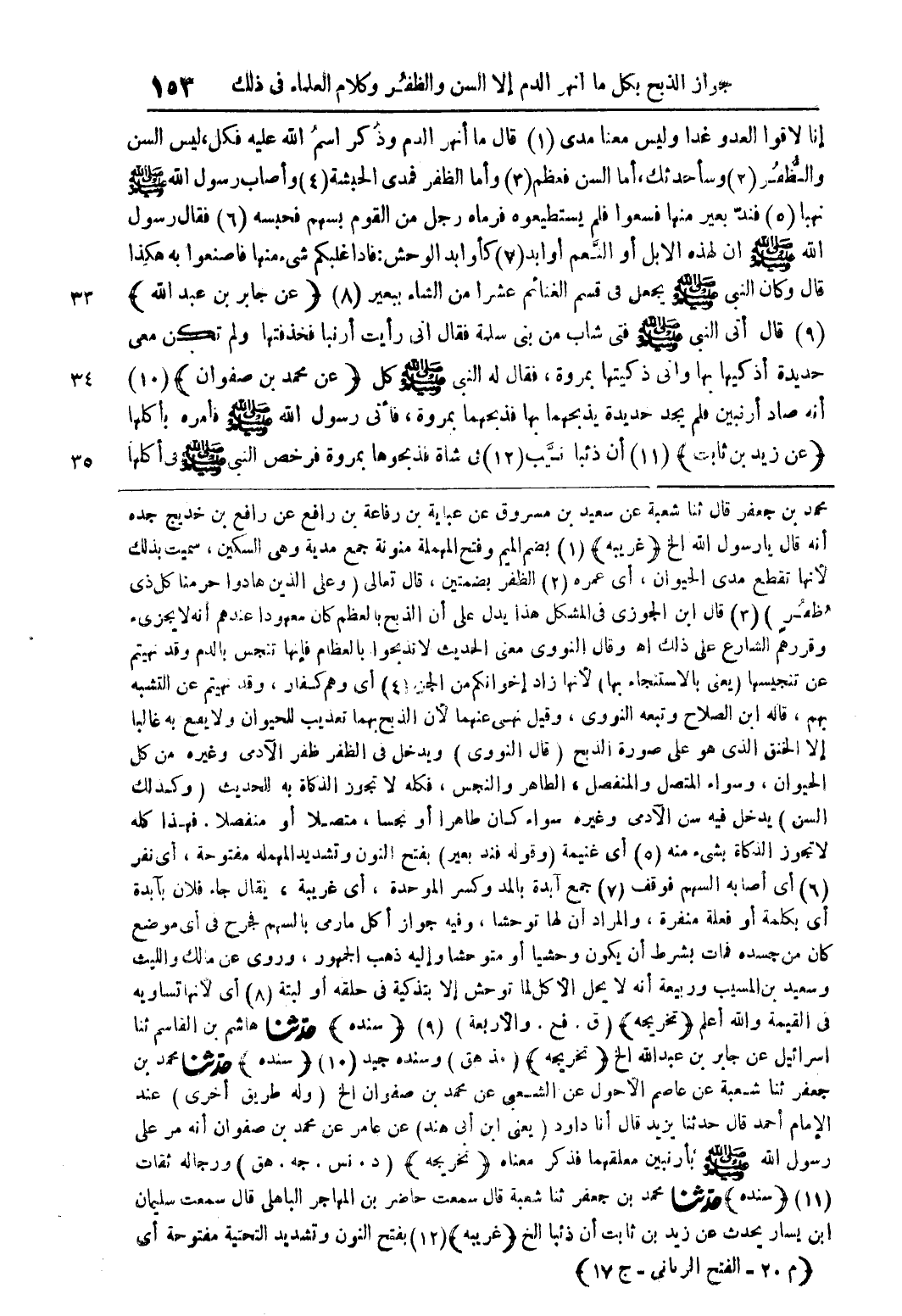 إنا لاقوا العدو غداً وليس معنا مدى (1) قال ما أنهر الدم وذكر اسم الله عليه فكل، ليس السن والظُّفر (2) وسأحدثك، أما السن فعظم (3) وأما الظفر فمدى الحبشة (4) وأصاب رسول الله صلى الله عليه وسلم نهبا (5) فندّ بعير منها فسعوا فلم يستطيعوه فرماه رجل من القوم بسهم فحبسه (6) فقال رسول الله صلى الله عليه وسلم أن لهذه الإبل أو النِّعم أو أبد (7) كأوابد الوحش: فإذا غلبكم شئ منها فاصنعوا به هكذا قال وكان النبى صلى الله عليه وسلم يجعل في قسم الغنائم عشراً من الشاء ببعير (8) (عن جابر بن عبد الله) (9) قال أتى النبى صلى الله عليه وسلم فتى شاب من بنى سلمة فقال إنى رأيت أرنباً فخذفتها ولم تكن معى حديدة أذكيها بها وإنى ذكيتها بمروة، فقال له النبى صلى الله عليه وسلم كل (عن محمد بن صفوان) (10) أنه صاد أرنبين فلم يجد حديدة يذبحهما بها فذبحهما بمروة، فأتى رسول الله صلى الله عليه وسلم فأمره بأكلها (عن زيد بن ثابت) (11) أن ذئباً نيِّب (12) في شاة فذبحوها بمروة فرخص النبى صلى الله عليه وسلم في أكلها