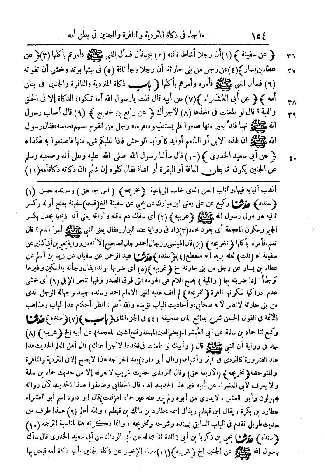 أنشب أنيابه فيها والناب السن الذى خلف الرباعي (تخريجة) (نس جة هق) وسندة حسن (1) (سندة) حدثنا وكيع عن على يعنى ابن مبارك عن يحيى عن سفينة الخ (قلت) سفينة بفتح اولة وكسر ثانية هو مولى رسول اللة صلى اللة علية وسلم (غريبة) (2) اى سفك دم ناقتة واراقة يعنى انة ذبحها بحذل بكسر الجيم وسكون المعجمة اى بعود محدد (3) زاد فى رواية عند البزار: فقال يعنى النبى صلى اللة علية وسلم ابهر الدم؟ قال نعم فامرة باكلها (تخريجة) (بز قال الهيثمى ورجال احمد رجال الصحيح الا انة من رواية يحيى بن ابى كثير عن سفينة اه (قلت) لعلة يريد انة منصطع (4) (سندة) حدثنا عبد الرحمن عن سفيان عن زيد با اسلم عن عطاء بن يسار عن رجل من بنى حارثة الخ (غريبة) (5) اى ضربها بوتد يقال وجاتة بالسكين وغيرها وجأ اذا ضربتة بها (واللبة) بفتح اللام هى الهزمة التى فوق الصدر وفيها تنحر الابل (6) اى خشى عدم ادراكها لكونها نافرة (تخريجة) لم اقف علية لغير الامام احمد وسندة جيد وجهالة الرجل الذى من بنى حارثة لا تضر لانة صحابى واحاديث الباب تويدة واللة اعلم: انظر احكام هذا الباب ومذاهب الائمة فى القول الحسن شرح بدائع المنن صحيفة 441 فى الجزء الثانى (باب) (7) (سندة) حدثنا وكيع ثنا بن سلمة عن ابى العشراء (بضم العين المهملة وفتح الشين المعجمة) عن ابية الخ (غريبة) (8) جاء فى رواية ان النبى صلى اللة علية وسلم قال (وابيك لو طعنت فى فخذها لا جزا عنك) قال اهل العلم بالحديث هذا عند الضرورة كالتردى فى البئر واشباهة (وقال ابو داود) بعد اخراجة هذا لا يصح الا فى المتردية والنافرة والمتوحشة (تخريجة) (الاربعة هق) وقال الترمذى حديث غريب لا نعرفةالا من حديث حماد بن سلمة ولا يعرف لابى العشراء لا يدرى من ابوة ولم يرو عنة غير حماد اه (قلت) قال ابو داود اسم ابو العشراء عطارد بن بكرة ويقال ابن قهطم ويقال اسمة عطارد بن مالك بن قهطم واللة اعلم (9) هذا طرف من حديث طويل تقدم فى الباب السابق بسندة وشرحة وتخريجة وانما ذكرتة هنا لمناسبة الترجمة (10) (سندة) حدثنا يحيى بن زكريا بن ابى زائدة ثنا مجالد عن ابى الوداك عن ابى سعيد الخدرى قال سالنا رسول اللة صلى اللة علية وسلم عن الجنين الخ (غريبة) (11) معناه الاخبار عن ذكاه الجنين بانها ذكاه أمه فيحل بها