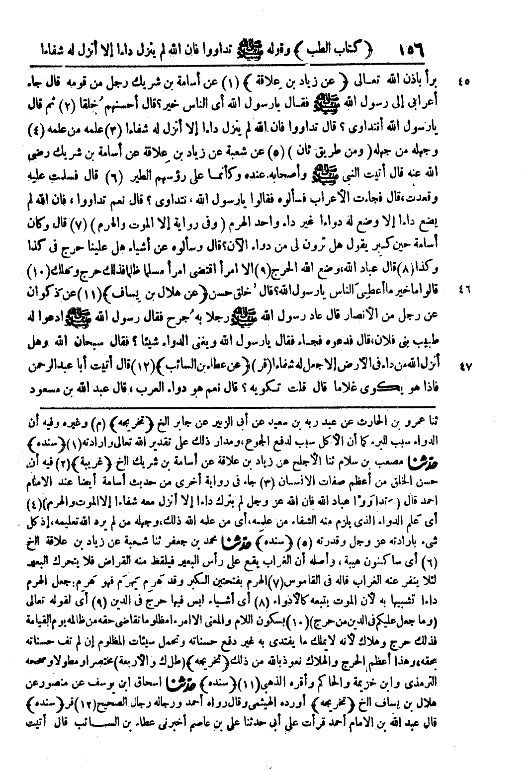 برأ بإذن الله تعالى (عن زياد بن علاقة) (1) عن أسامة بن شريك رجل من قومه قال جاء أعرابى إلى رسول الله صلى الله عليه وسلم فقال يا رسول الله أي الناس خير؟ قال أحسنهم خلقاً (2) ثم قال يا رسول الله أتتداوى؟ قال تداووا فإن الله لم ينزل داءاً إلا أنزل له شفاءاً (3) علمه من علمه (4) وجهله من جهله (ومن طريق ثان) (5) عن شعبة عن زياد بن علاقة عن أسامة بن شريك رضى الله عنه قال أتيت النبى صلى الله عليه وسلم وأصحابه عنده وكأنما على رؤسهم الطير (6) قال فسلمت عليه وقعدت، قال فجاءت الأعراب فسالوه فقالوا يا رسول الله، نتداوى؟ قال نعم تداووا، فإن الله لم يضع داءاً إلا وضع له دواءاً غير داء واحد الهرم (وفى رواية إلا الموت والهرم) (7) قال وكان أسامة حين كبر يقول هل ترون لى من دواء الآن؟ قال وسألوه عن أشياء هل علينا حرج في كذا وكذا (8) قال عباد الله، وضع الله الحرج (9) إلا أمراً اقتضى أمراً مسلماً ظلماً فذلك حرج وهلك (10) قالوا ما خير ما أعطى الناس يا رسول الله؟ قال خلق حسن (عن هلال بن يساف) (11) عن ذكوان عن رجل من الأنصار قال عاد رسول الله صلى الله عليه وسلم رجلاً به جرح فقال رسول الله صلى الله عليه وسلم أدعوا له طبيب بنى فلان، قال فدعوه فجاء فقال يا رسول الله ويغنى الدواء شيئاً؟ فقال سبحان الله وهل أنزل الله من داء في الأرض إلا جعل له شفاءاً (قر) (عن عطاء بن السائب) (12) قال أتيت أبا عبد الرحمن فإذا هو يكوى غلاماً قال قلت تكويه؟ قال نعم هو دواء العرب، قال عبد الله بن مسعود