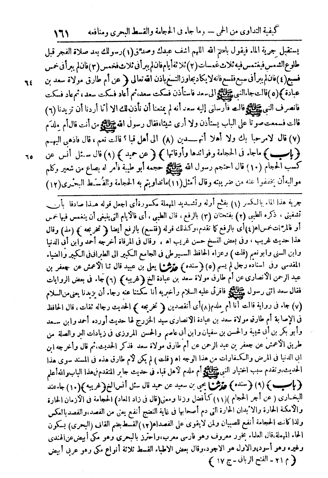 جرية هذا الماء بالكسر (1) بفتح اولة وتشديد المهملة مكسورة اى اجعل قولة هذا صادق بان تشفينى ذكرة الطيى (2) بفتحتان (3) بالرفع قال الطيى اى فالايام التى ينبغى ان ينغمس فيها مس اة فالمرات خمس اه (4) اى بالرفع كما تقدم وكذلك قولة (فتسع) بالرفع ايضا (تخريجة) (مذ) وقال هذا حديث غريب وفى بعض النسخ حسن غريب اه وقال فى المرقاه اخرجة احمد وابن ابى الدنيا وابن السنى وابو نعيم (قلت) وعزاه الحافظ السيوطى فى الجامع الكبير الى الطبرانى فى الكبير والضياء المقدسى وفى اسنادة رجل يم يسم (5) (سندة) حدثنا يعلى بن عبيد قال ثنا الاعمش عن جعفر بن عبد الرحمن الانصارى عن ام طارق مولاة سعد بن عبادة الخ (غريبة) (6) جاء فى بعض الروايات فقال سعد ائتى رسول اللة صلى اللة عليةوسلم فاقرئى علية السلام واخبرية انا سكتنا عنة رجاء ان يزيدنا يعنى من السلام (7) جاء فى رواية قالت انا ام ملدم (8) اى اتقصدين (تخريجة) الحديث رجالة ثقات قال الحافظ فى الاصابة ام طارق مولاة سعد بن عبادة الانصارى سيد الزرج لها حديث اوردة احمد وابن سعد وابو بكر بن ابى شيبة والحسن بن سفيان وابن ابى عاصم والحسن المروزى فى زيادات البز واالصلة من طريق الاعمش عن جعفر بن عبد الرحمن عن ام طارق مولاة سعد فذكر الحديث ثم قال واخرجة ابن ابى الدنيا فى المرض والكفارات من هذا الوجة اه (قلت) لم يكن لام طارق هذه فى السند سوى هذا الحديث وتقدم سبب اختبار النبى صلى اللة علية وسلم ام ملدم لاهل قباه فى حديث جابر المتقدم فى هذا الباب واللة اعلم (باب) (9) (سندة) حدثنا يحيى بن سعيد عن حميد قال سئل انس الخ (غريبة) (10) جاء عند البخارى (عن اجر الحجام) (11) كافضل وزنا ومعنى (قال فى زاد العاد) الحجامة فى الازمان الحارة والامكنة الحارة والابدان الحارة التى دم اصحابها فى غاية النضج انفع يعنى من الفصد والفصد بالعكس ولذا كانت الحجامة انفع للصبيان ولمن لا يقوى على الفصداه (12) القسط يضم القاف (البحرى) بسكون الحاء المهملة قال العلماء بخور معروف وهو فارسى معرب واحترز بالبحرى وهو مكى ابيض عن الهندى وغيرة وهو اسود والاول هو الاجود وقال بعض الاطباء القسط ثلاثة انواع مكى وهو عربي أبيض